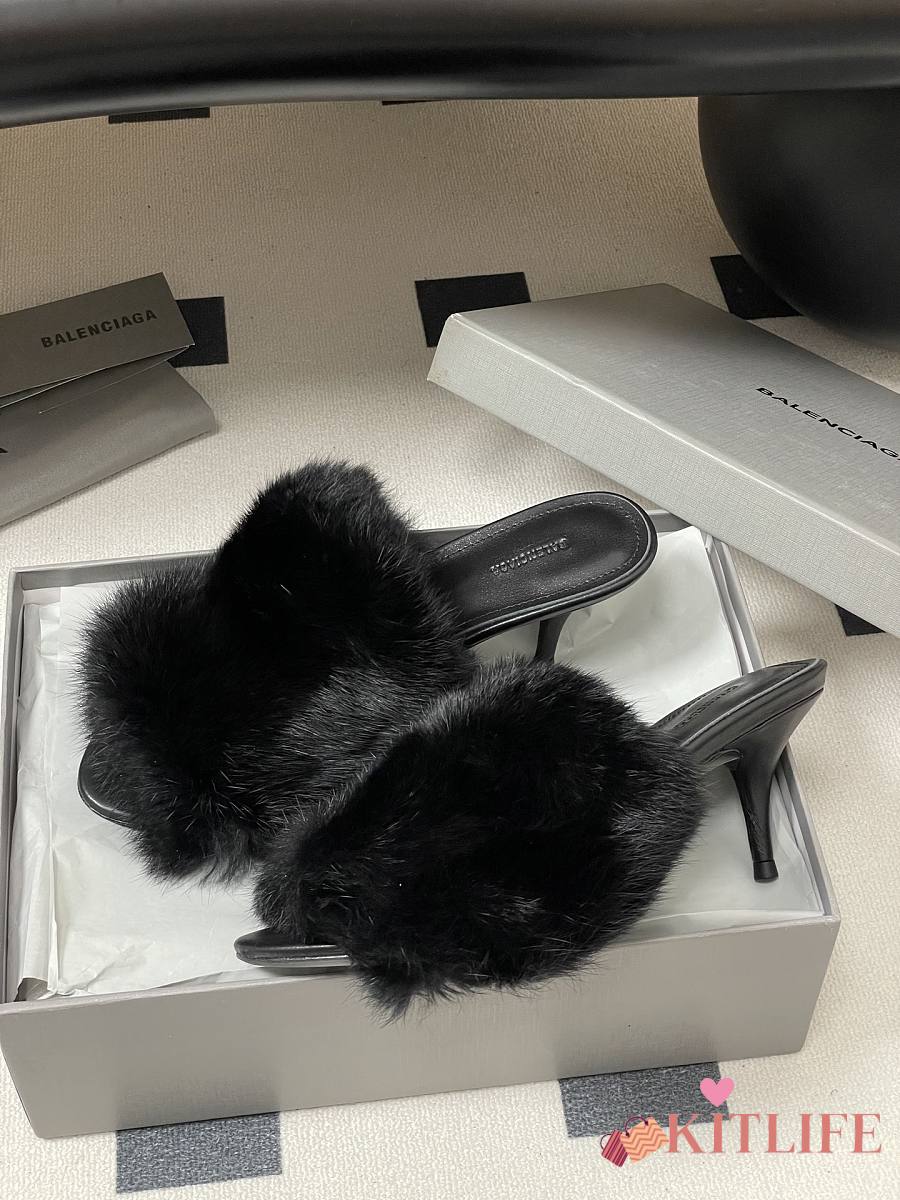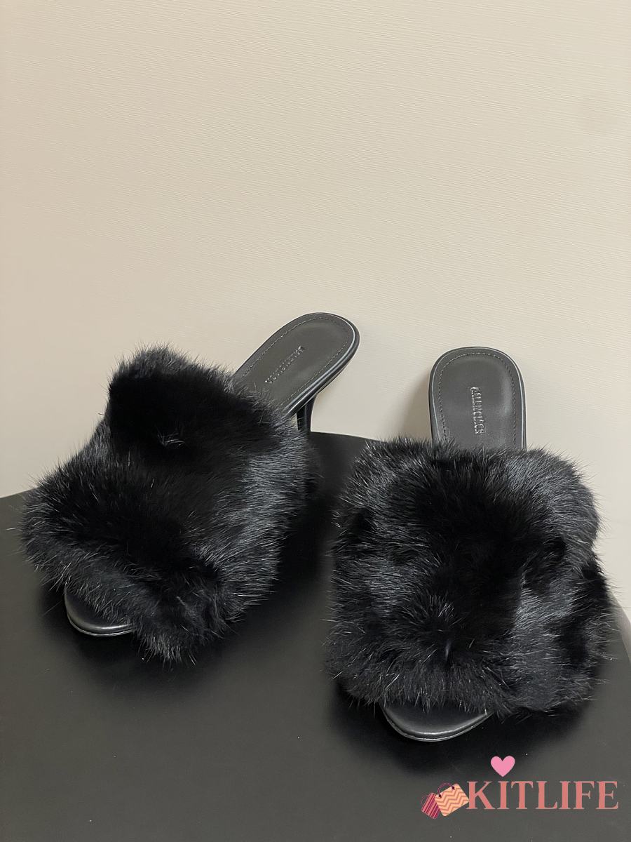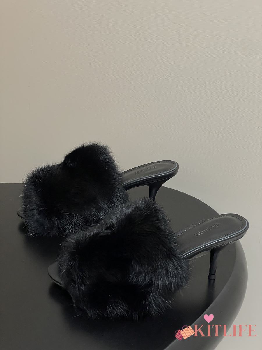 Kitlife Balenciaga Plush Tail Kitten Heel Slippers Black 65mm