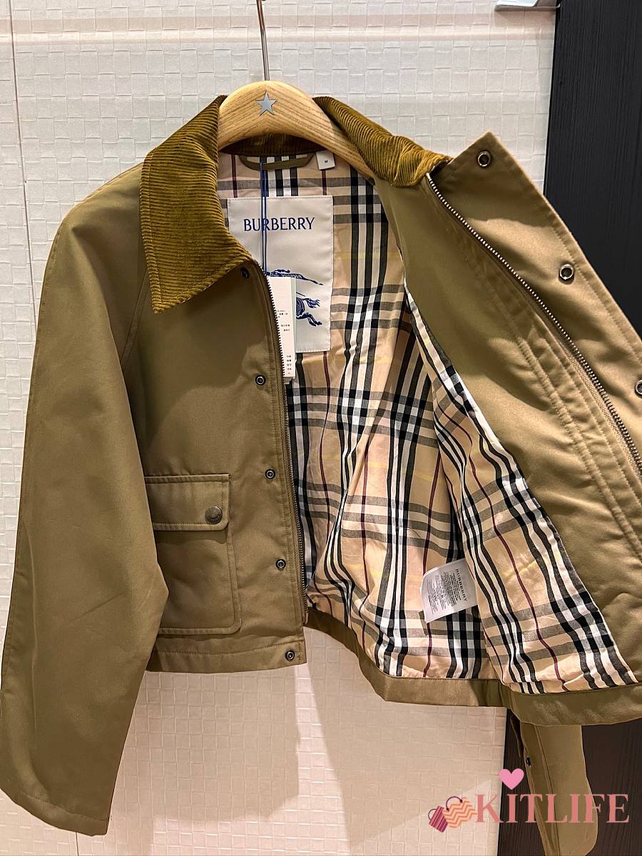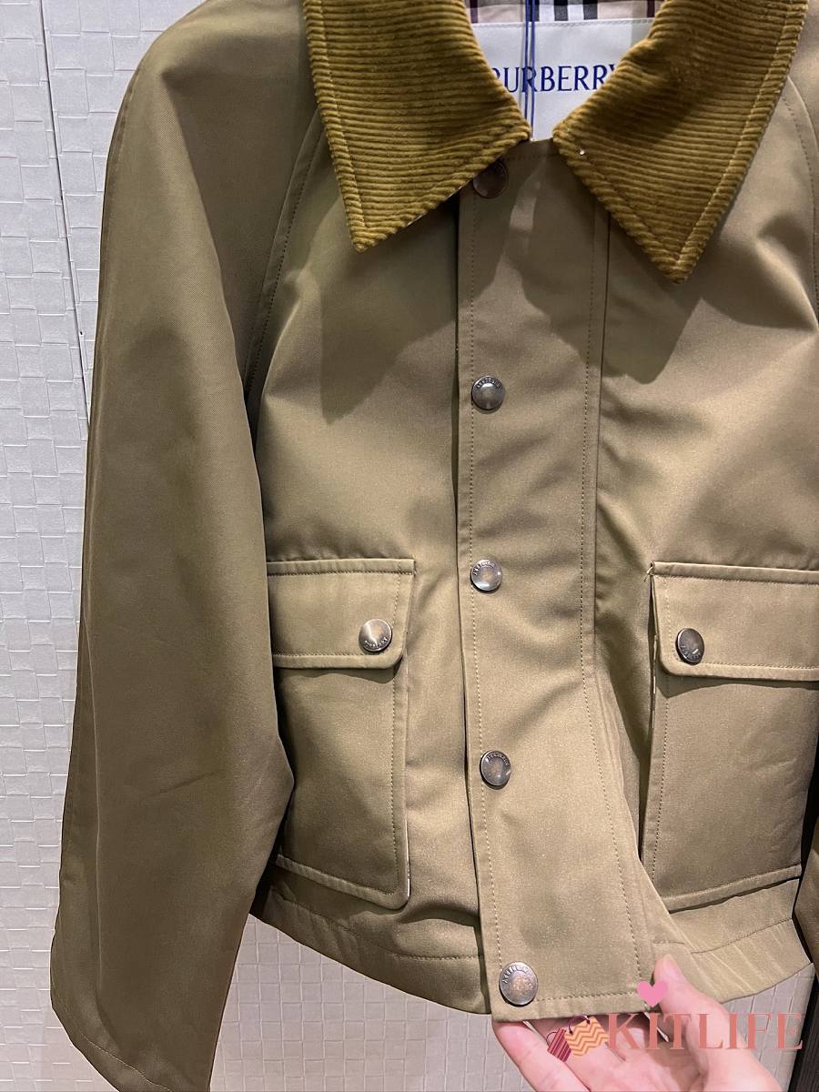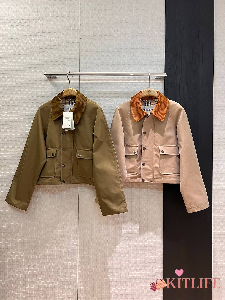 Kitlife Burberry Cropped Olive Brown Coat With Corduroy Collar Neutrals