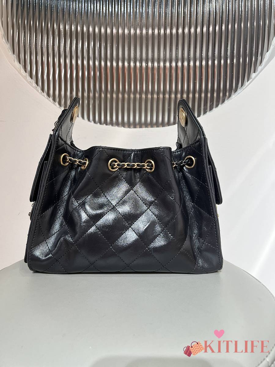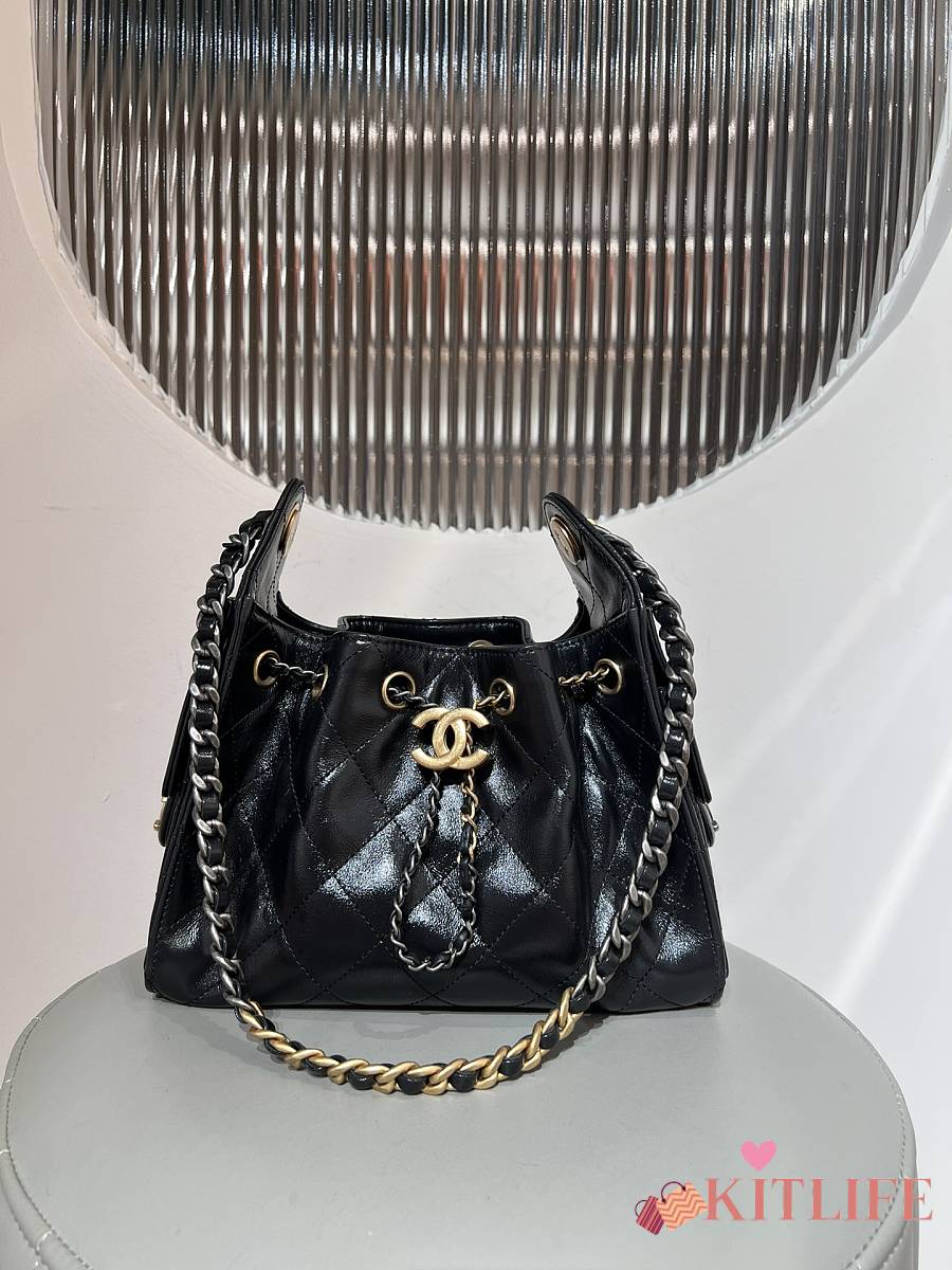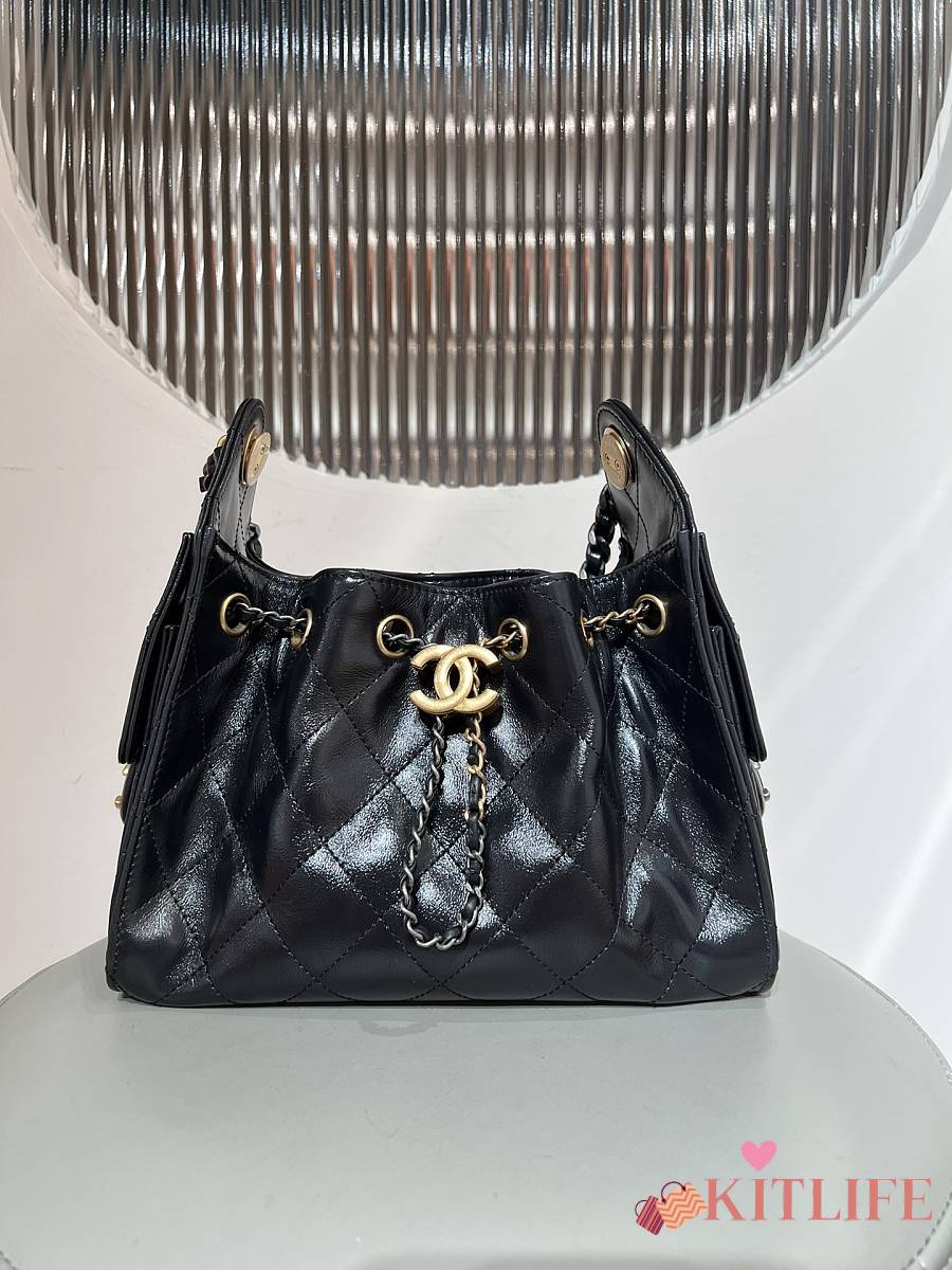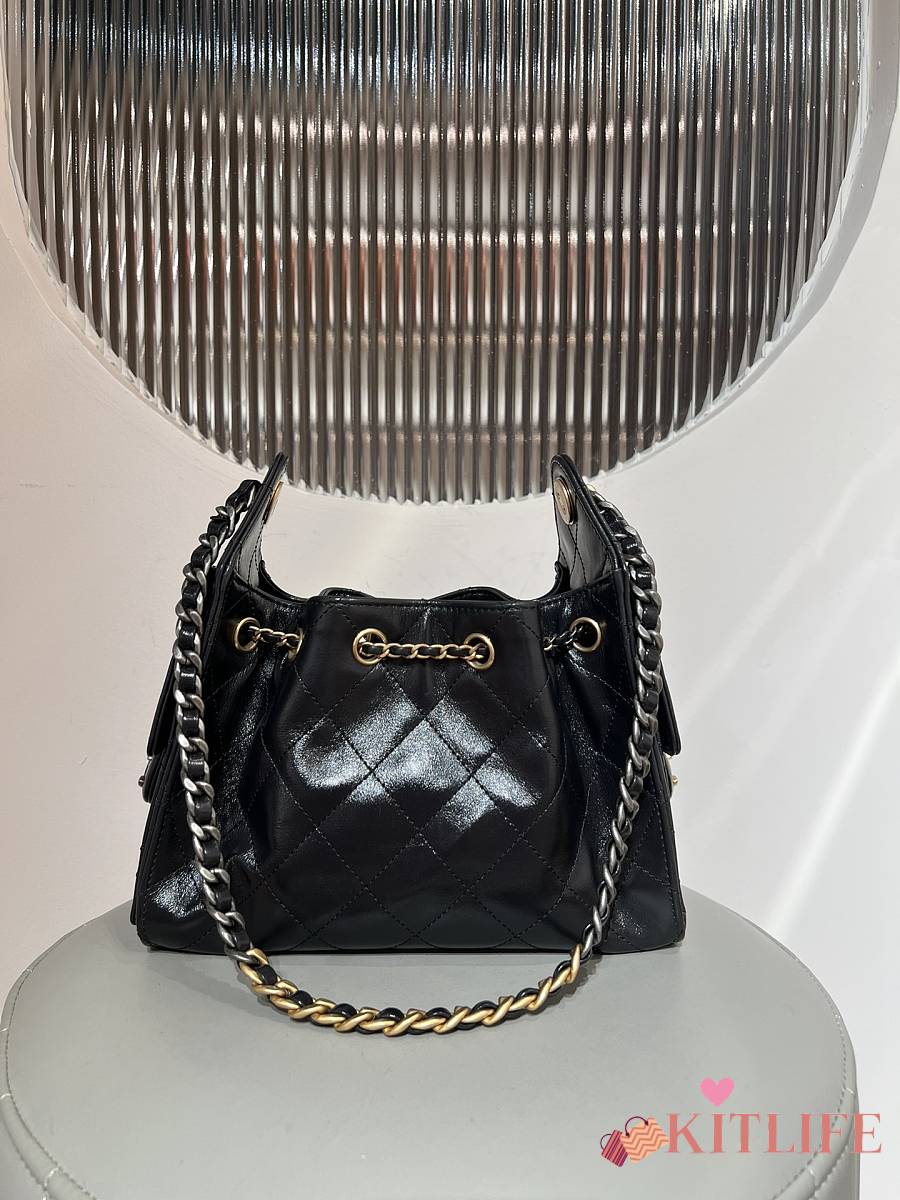 Kitlife Chanel 25C Drawstring Bucket Hobo Bag Black Glossy Lambskin 20x22x12.5cm