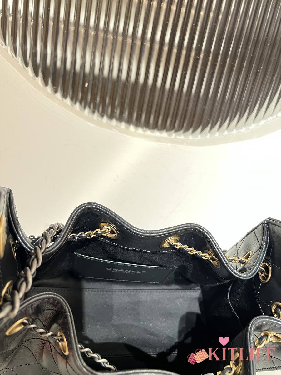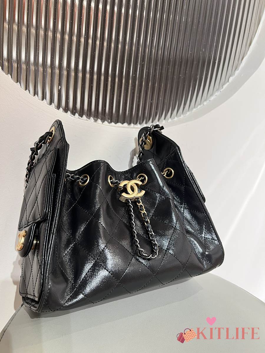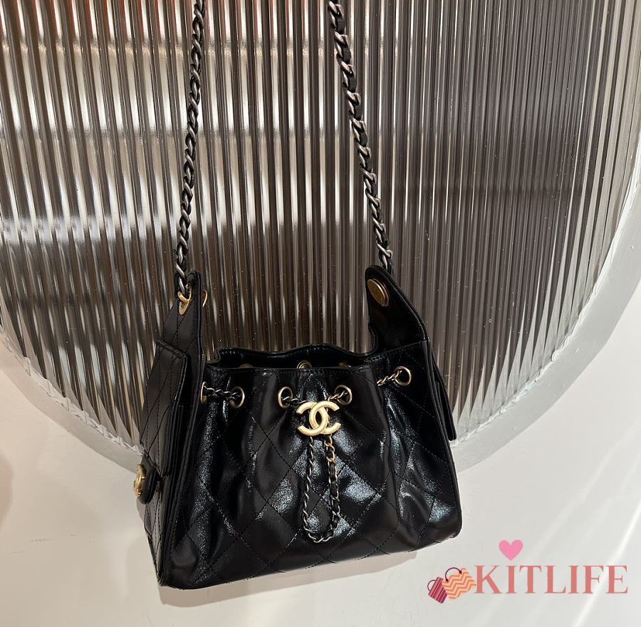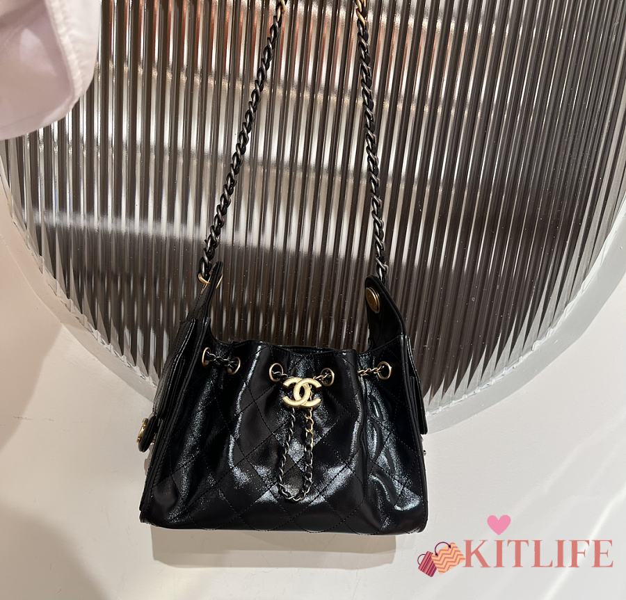 Kitlife Chanel 25C Drawstring Bucket Hobo Bag Black Glossy Lambskin 20x22x12.5cm