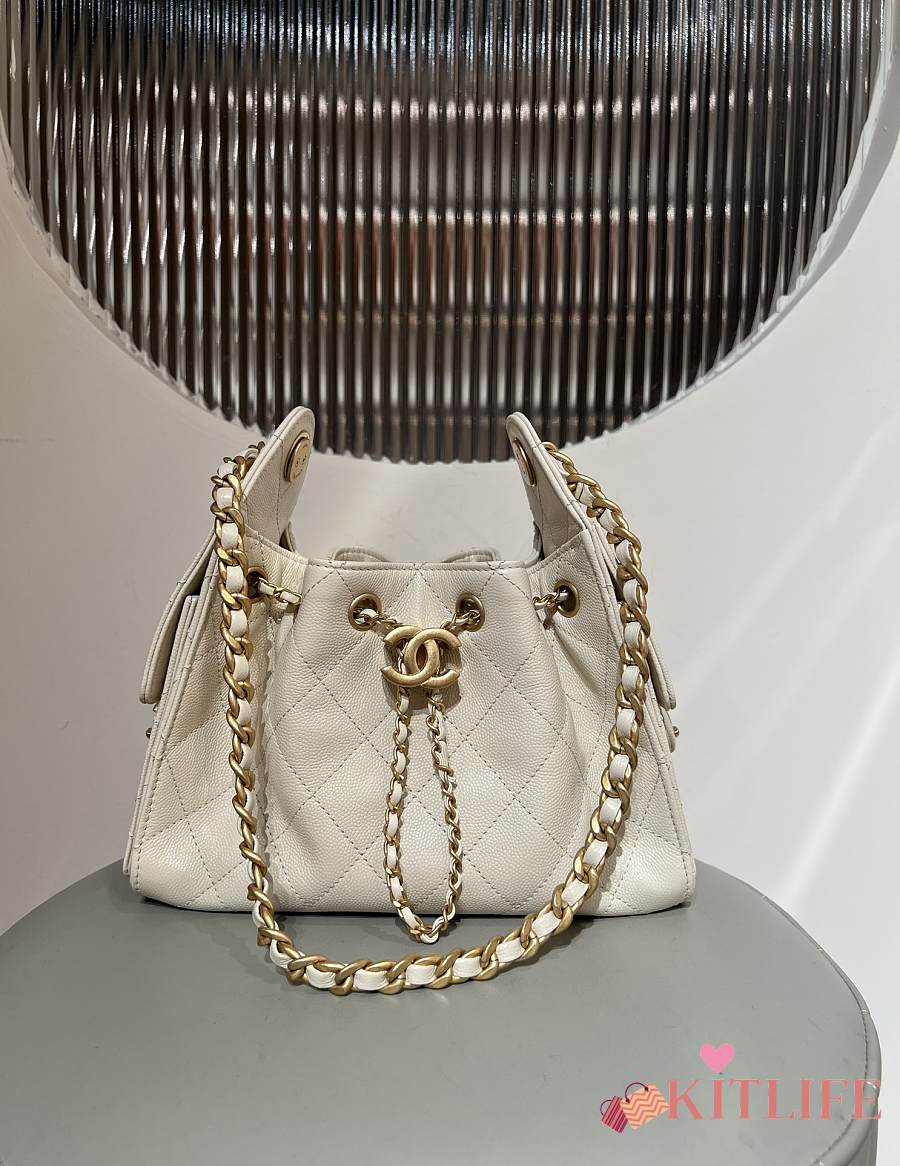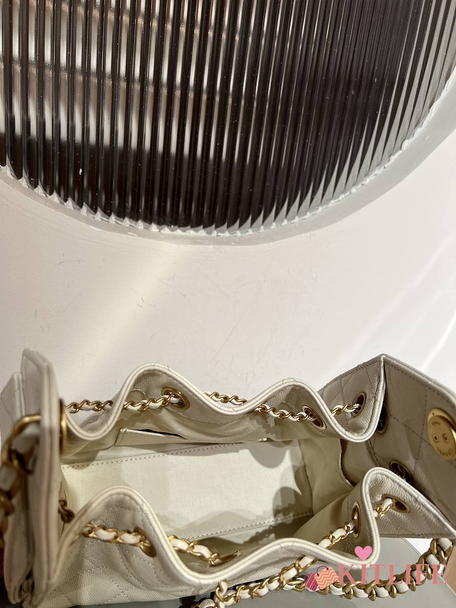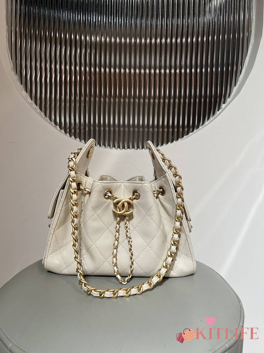 Kitlife Chanel 25C Drawstring Bucket Hobo Bag Cream Grained Leather 20x22x12.5cm
