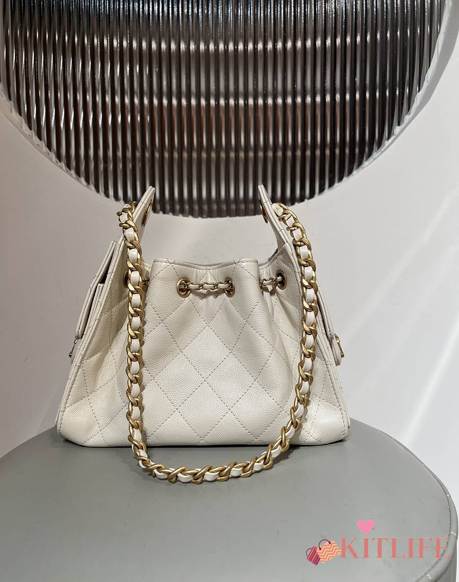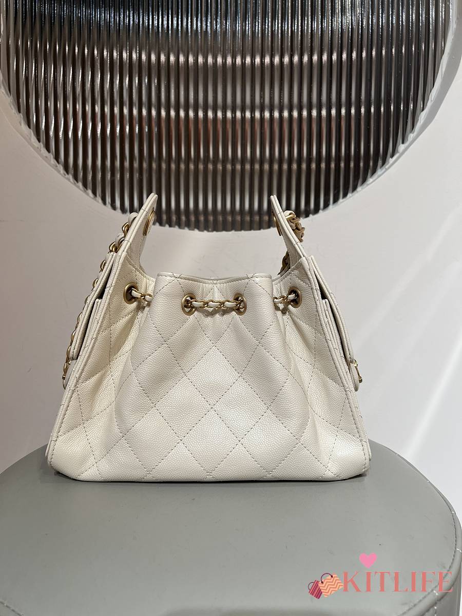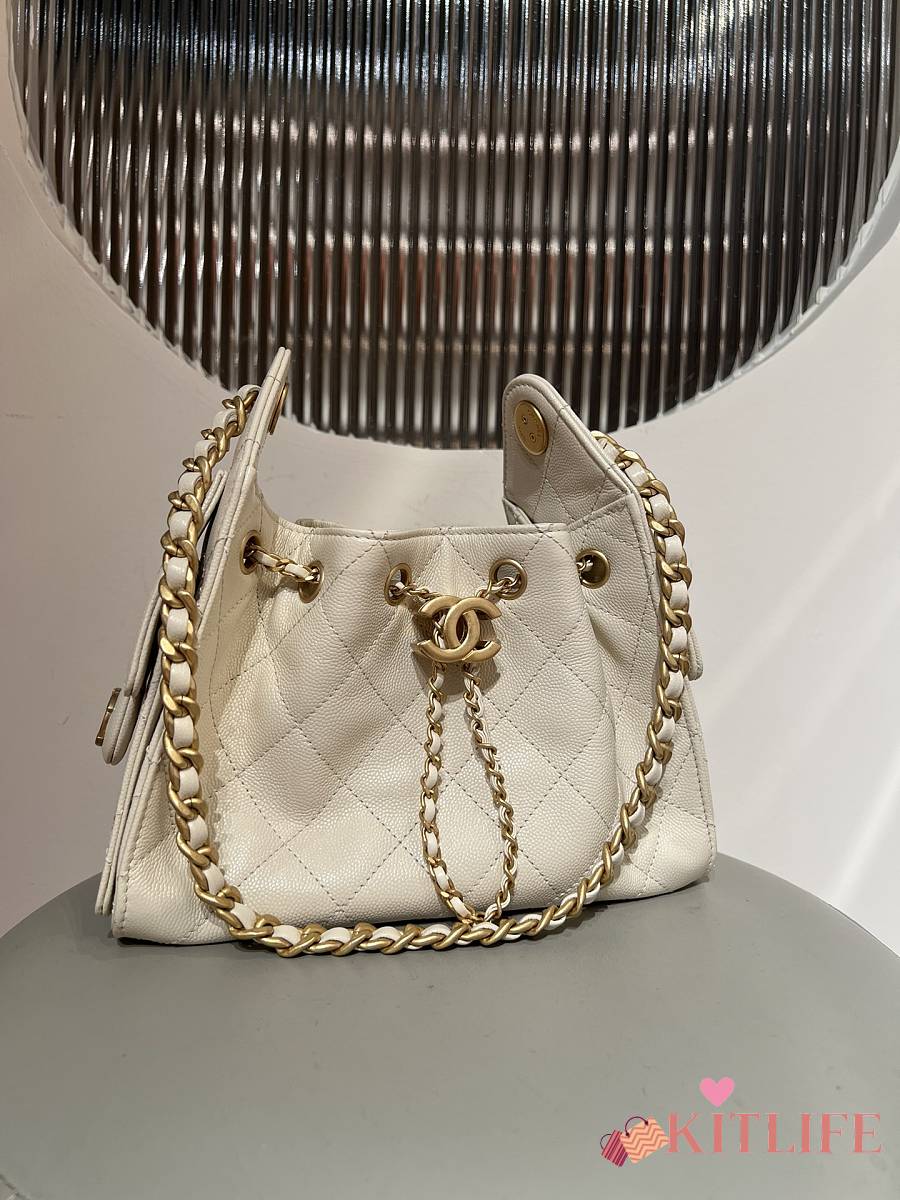 Kitlife Chanel 25C Drawstring Bucket Hobo Bag Cream Grained Leather 20x22x12.5cm