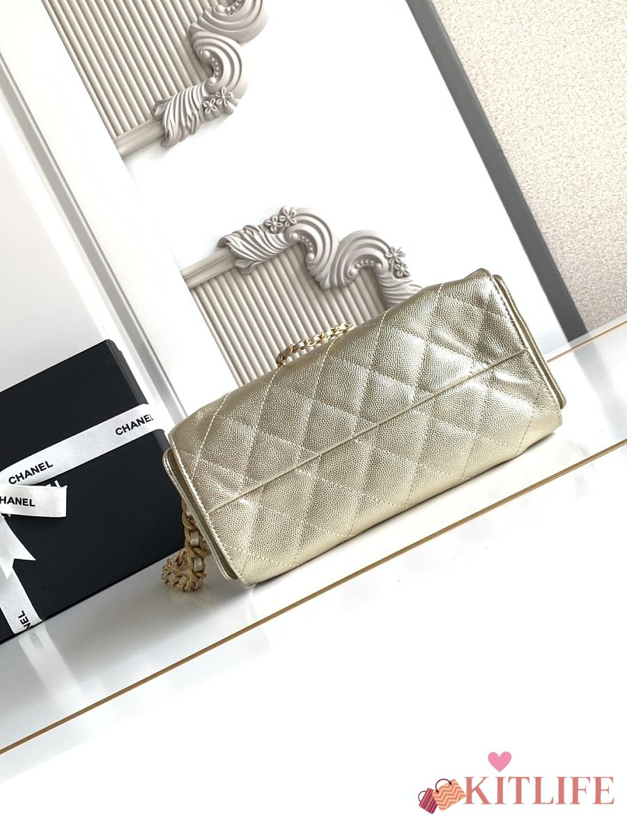 Kitlife Chanel Pouch White Grained Calfskin Imitation Pearl Gold Tone Metal 19x20x4cm