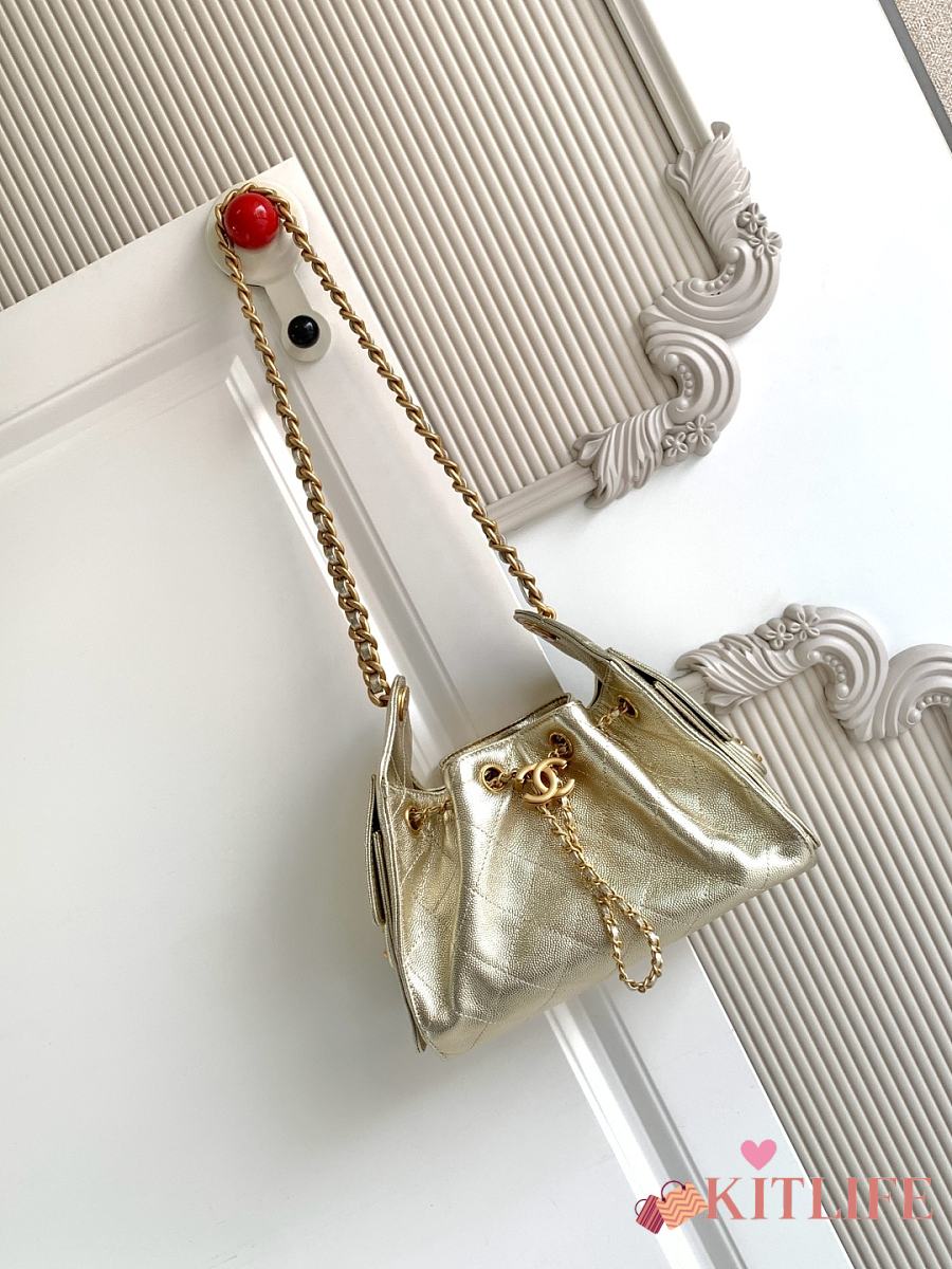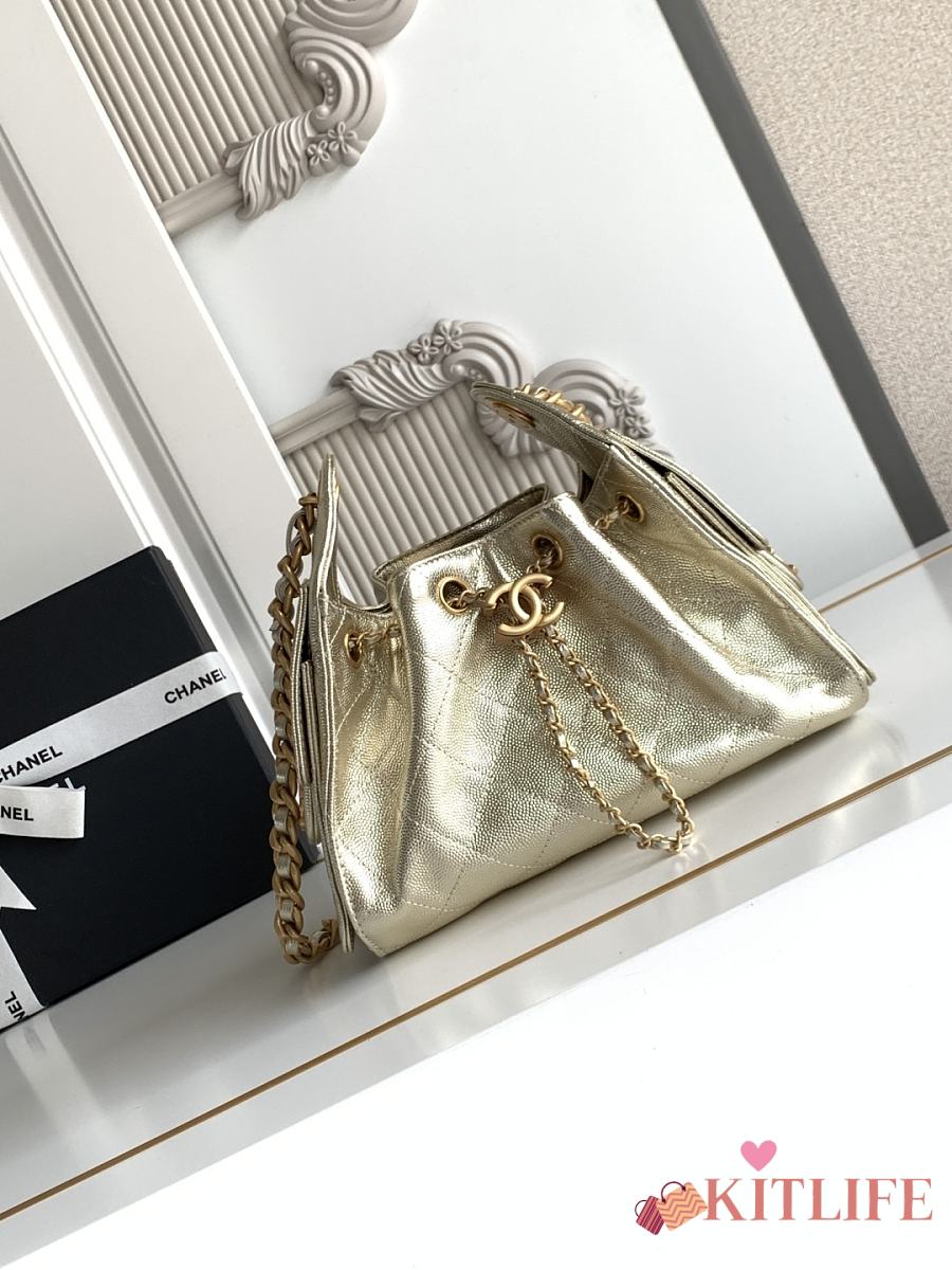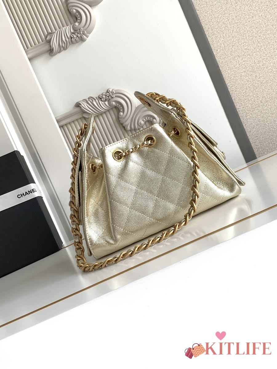 Kitlife Chanel 25C Drawstring Bucket Hobo Bag Light Gold Leather 20x22x12.5cm