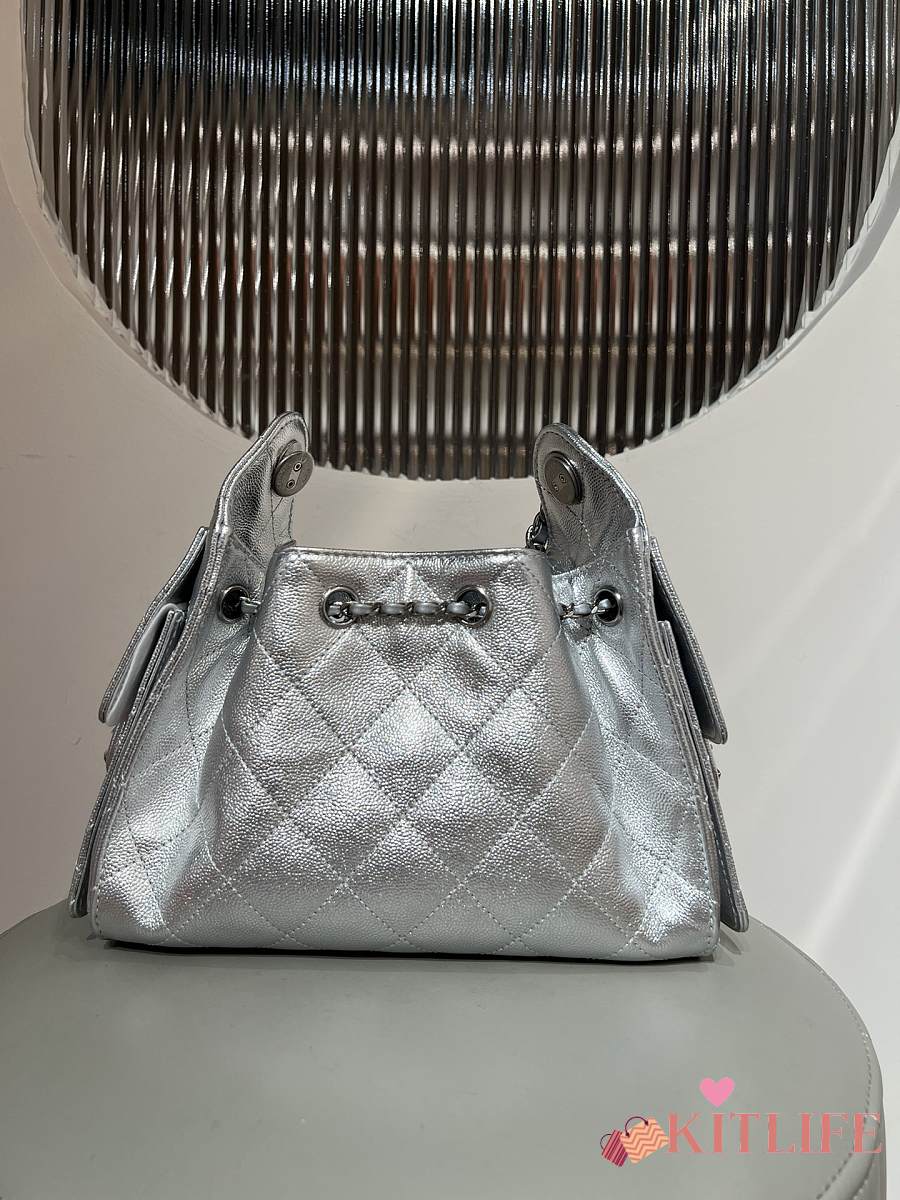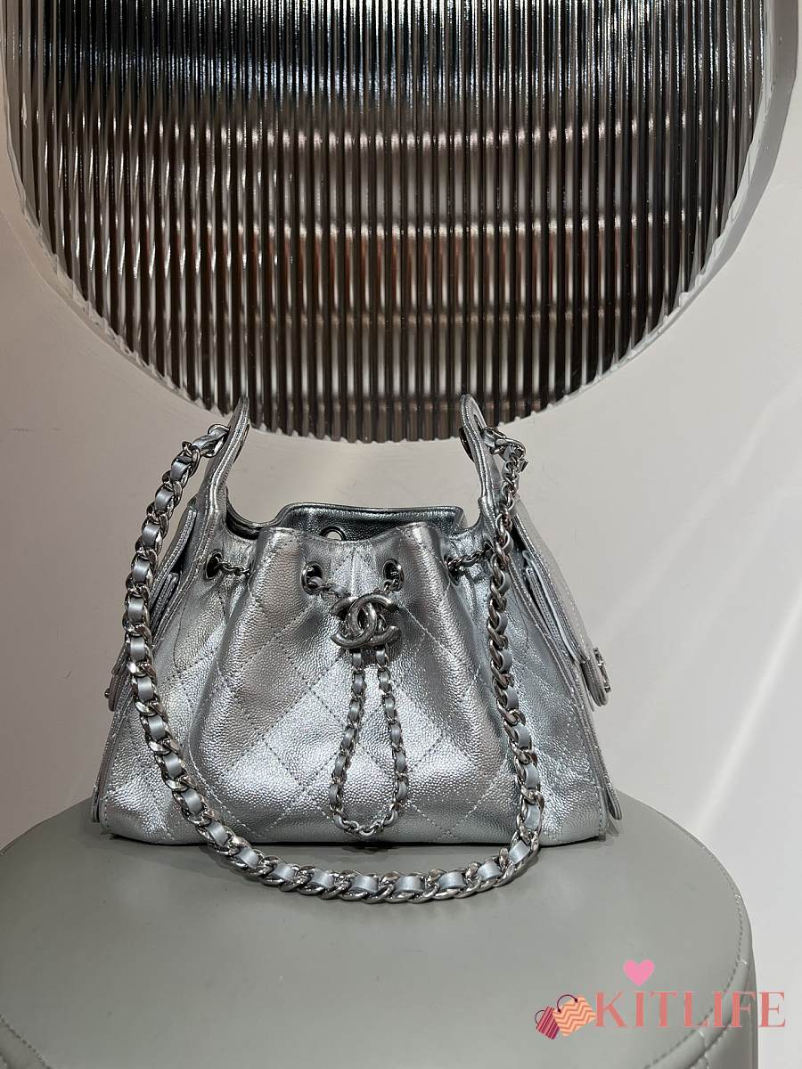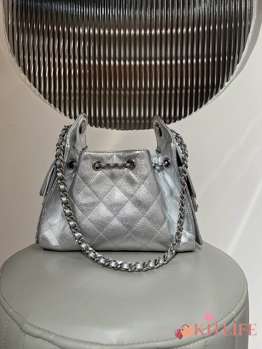 Kitlife Chanel 25C Drawstring Bucket Hobo Bag Silver Grained Leather 20x22x12.5cm