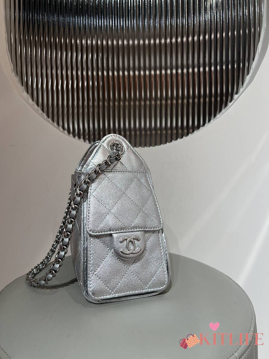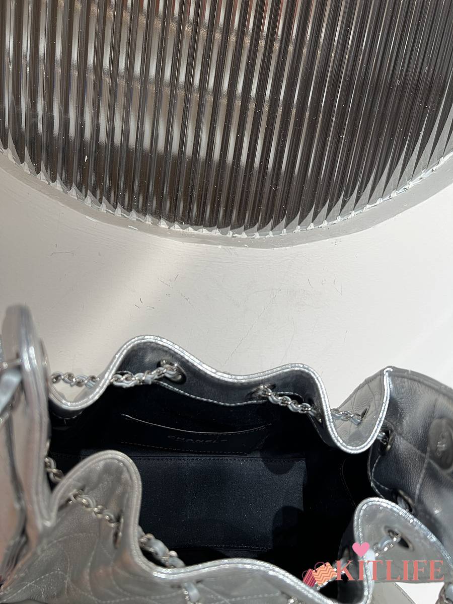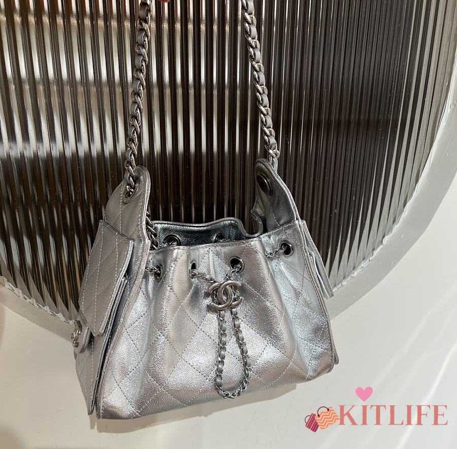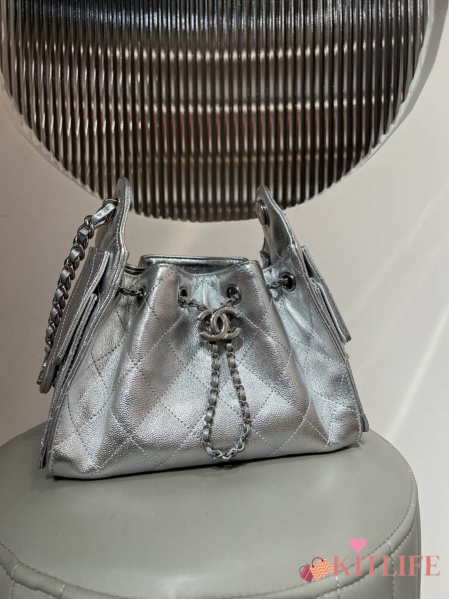 Kitlife Chanel 25C Drawstring Bucket Hobo Bag Silver Grained Leather 20x22x12.5cm