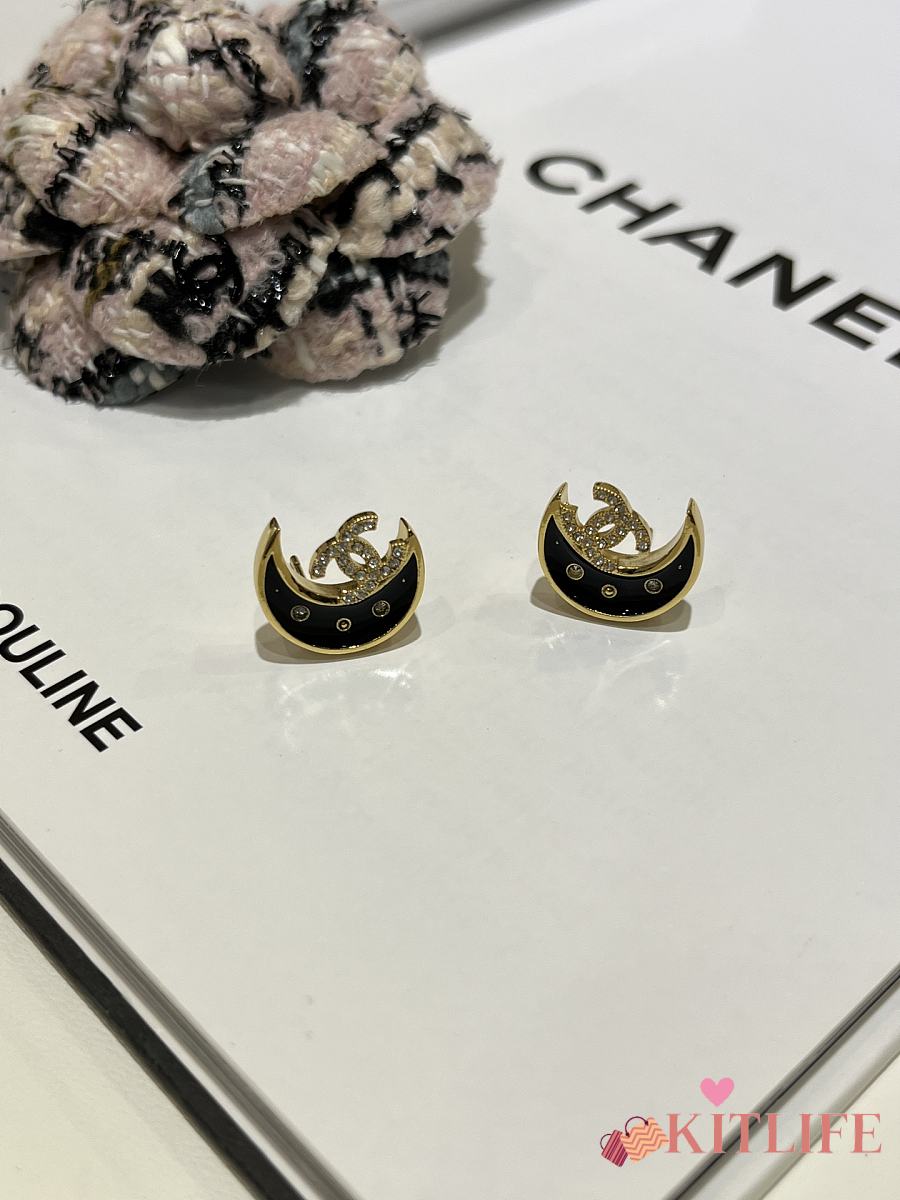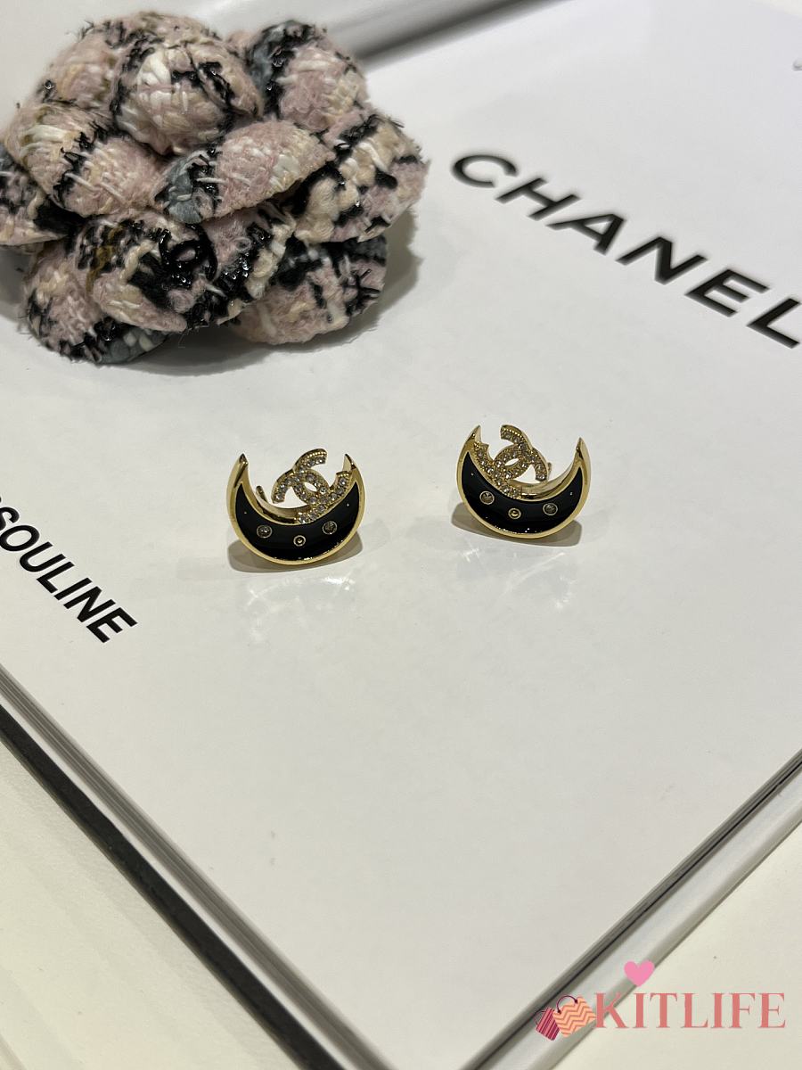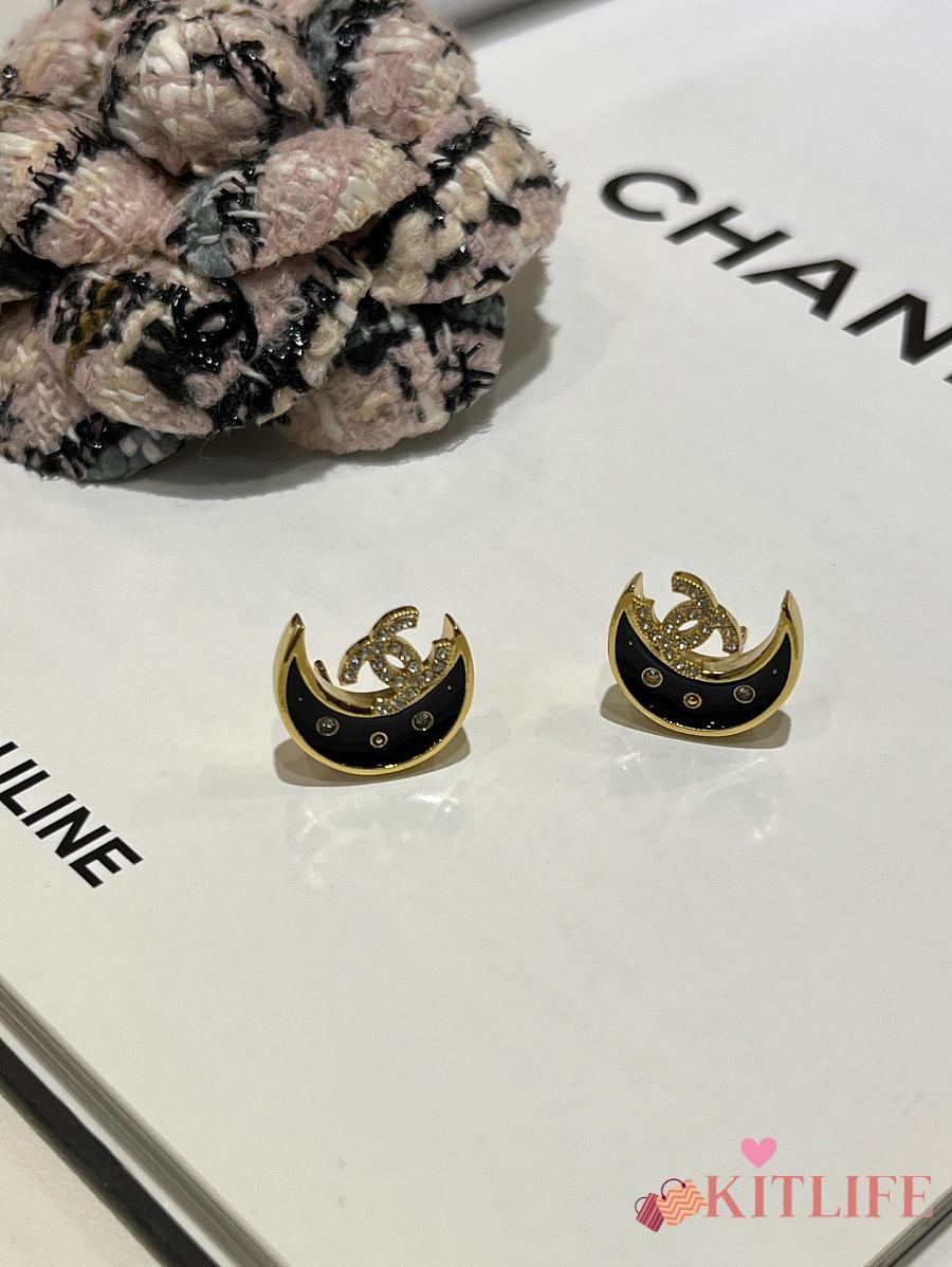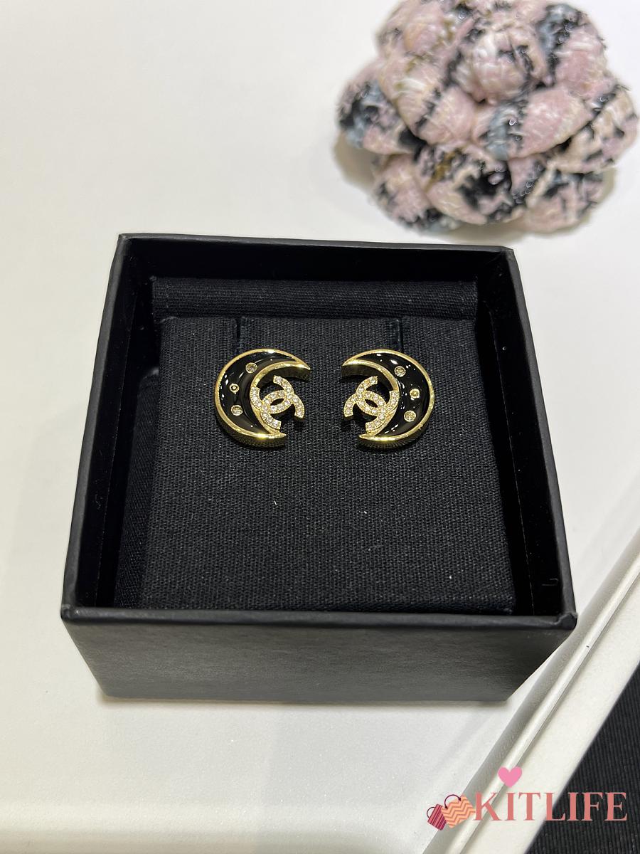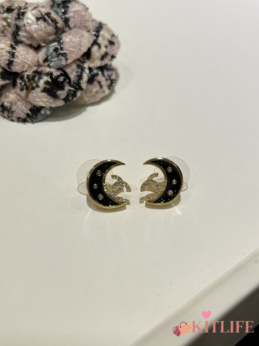 Kitlife Chanel 25K Black Enamel Full Diamond Double C Moon Earrings