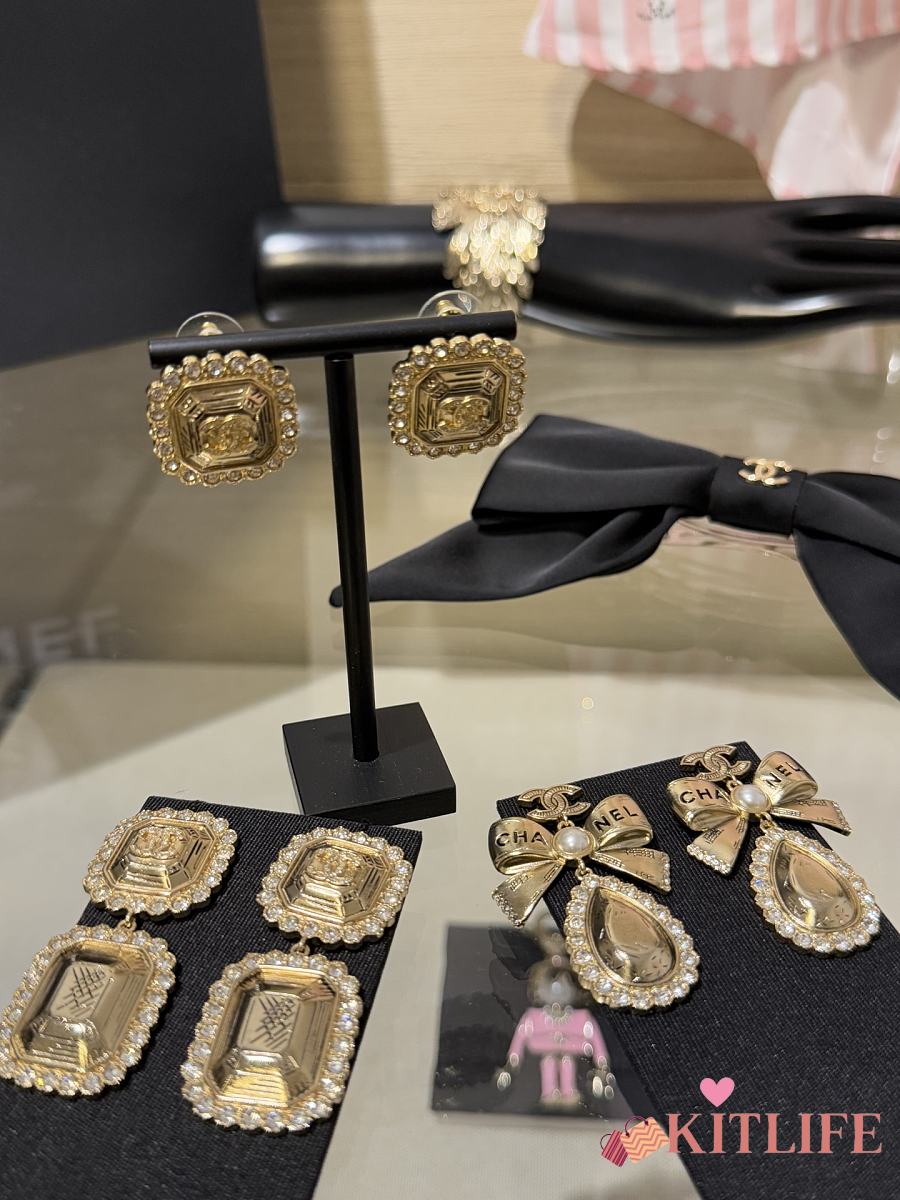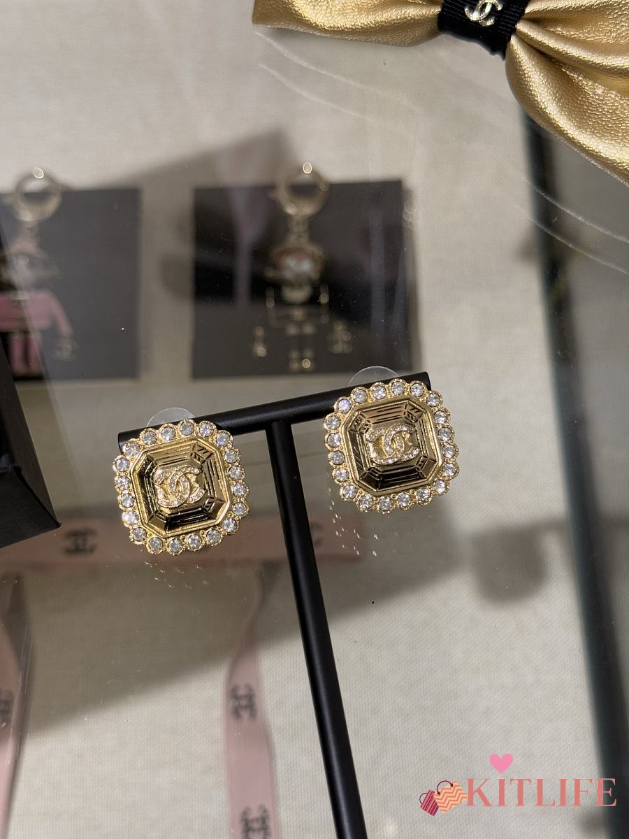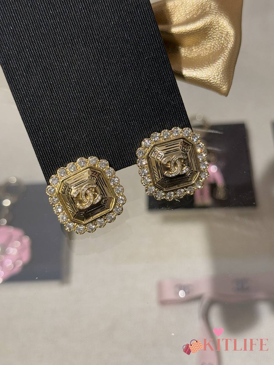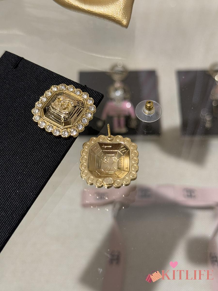 Kitlife Chanel 25k Gold Square Engraved Earrings with Double C Rhinestone Lace Trim