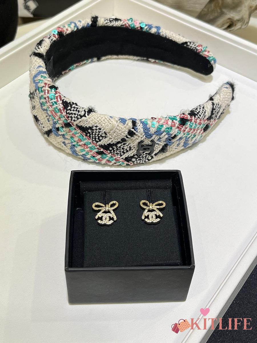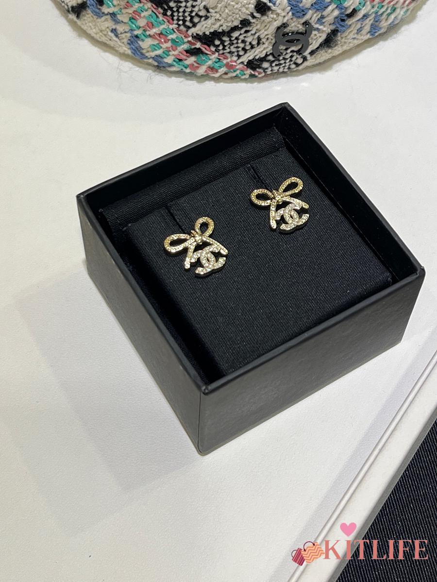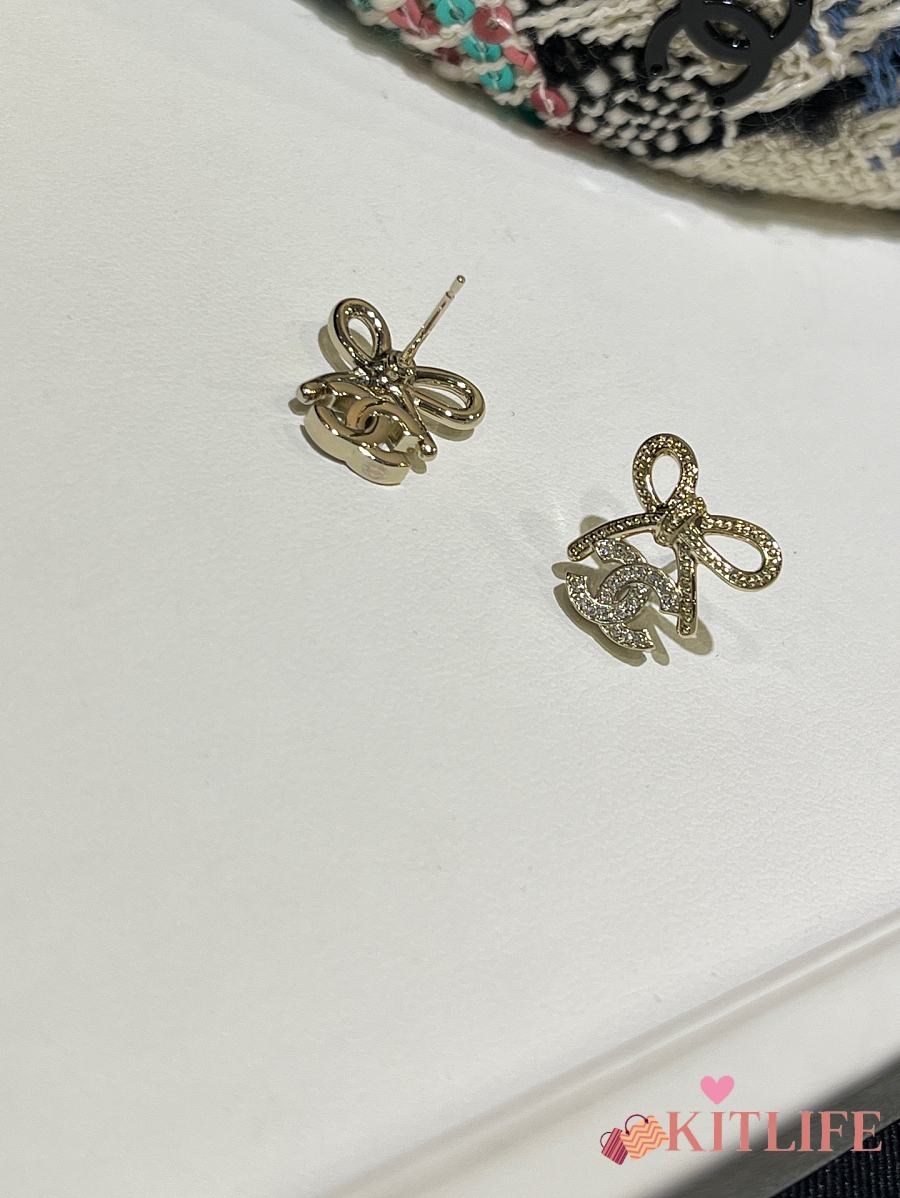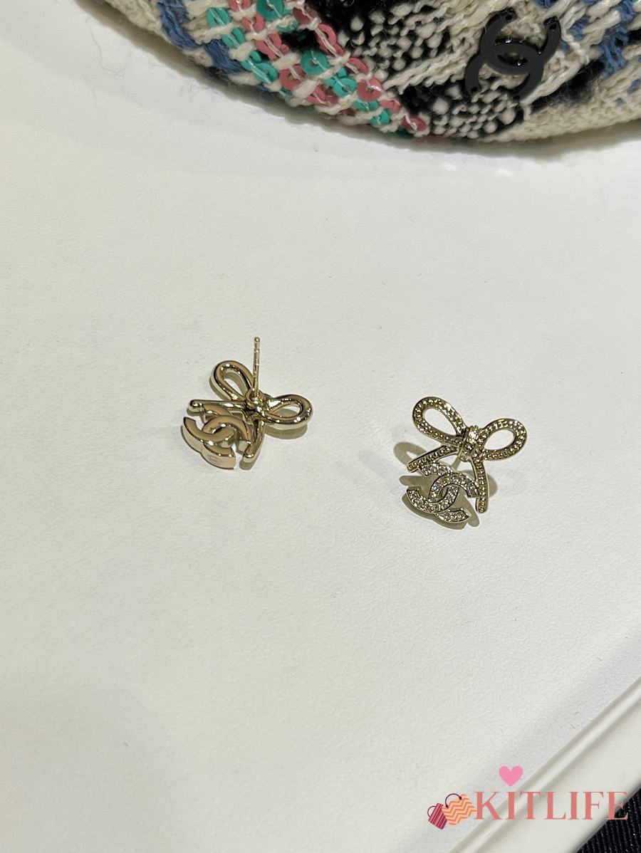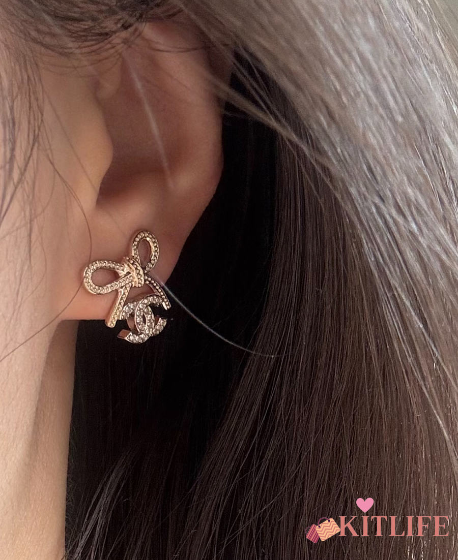 Kitlife Chanel 25K Light Gold Bow with Full Diamond Double C Stud Earrings