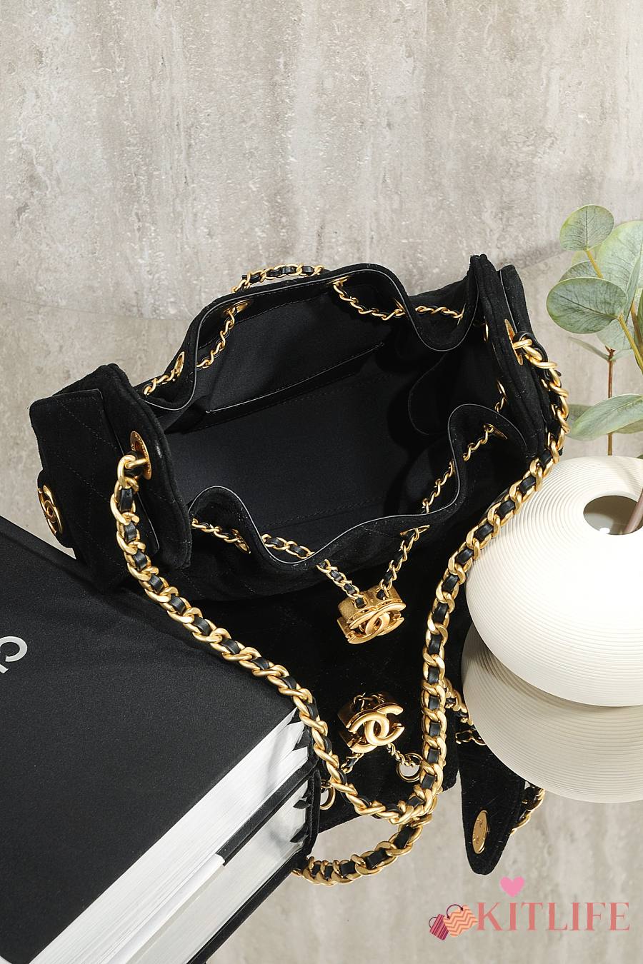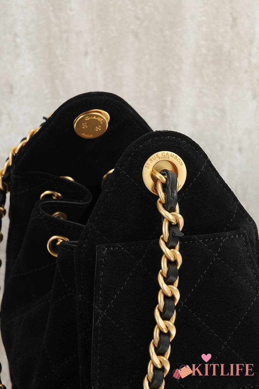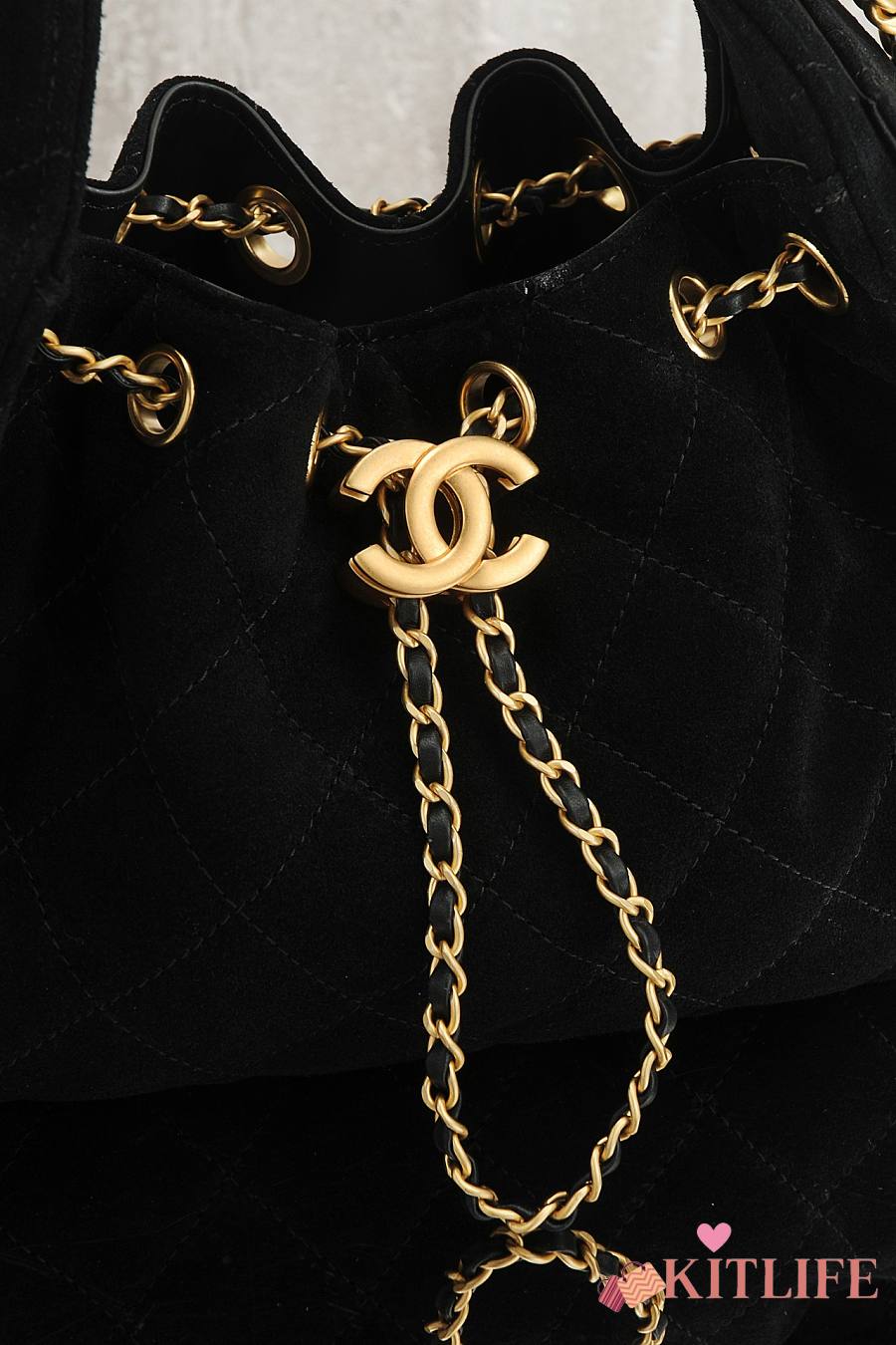 Kitlife Chanel 25s Drawstring Bucket Hobo Bag Black Suede Leather 20x22x12.5cm