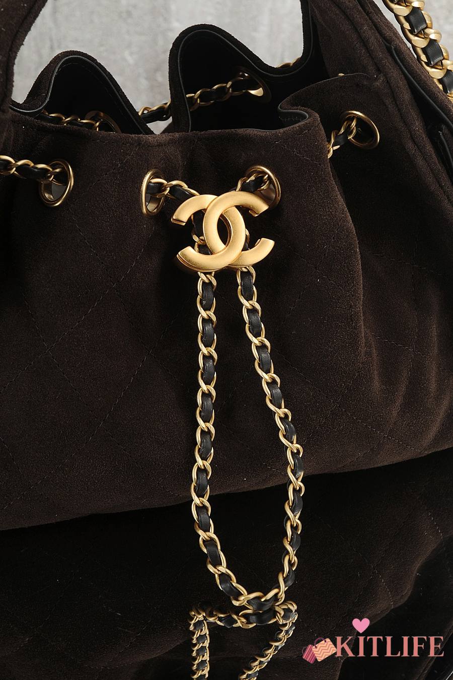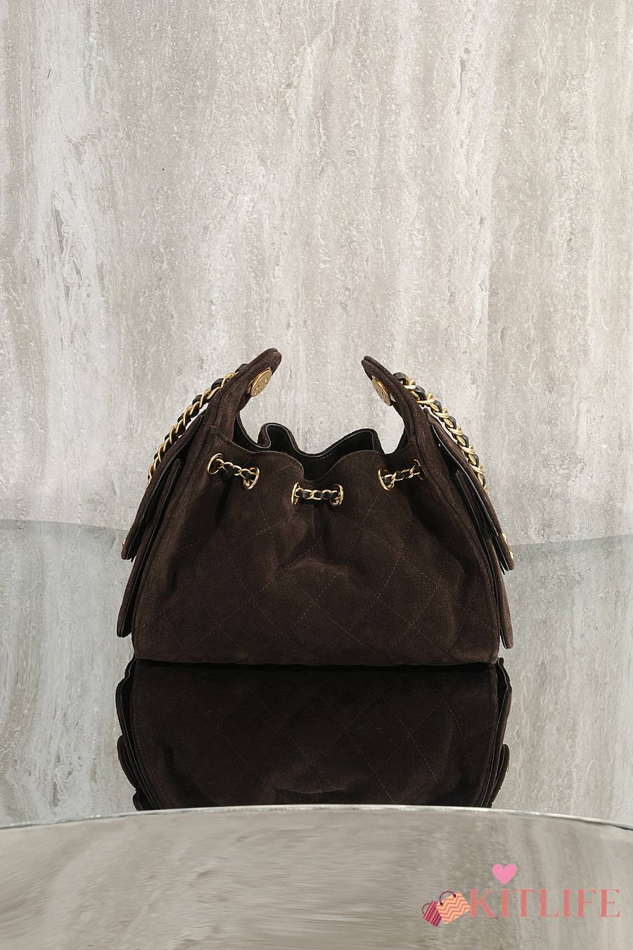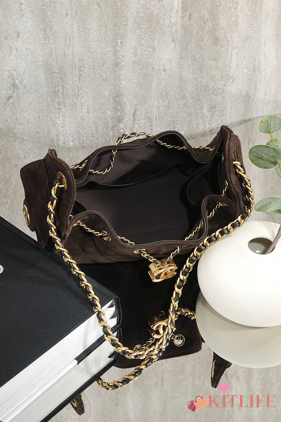 Kitlife Chanel 25s Drawstring Bucket Hobo Bag Dark Brown Suede Leather 20x22x12.5cm