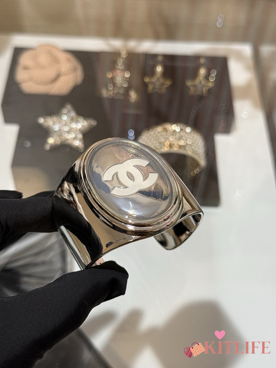 Kitlife Chanel 25S Silver Oval Mirror-Enamel Bangle with White Double C Enamel