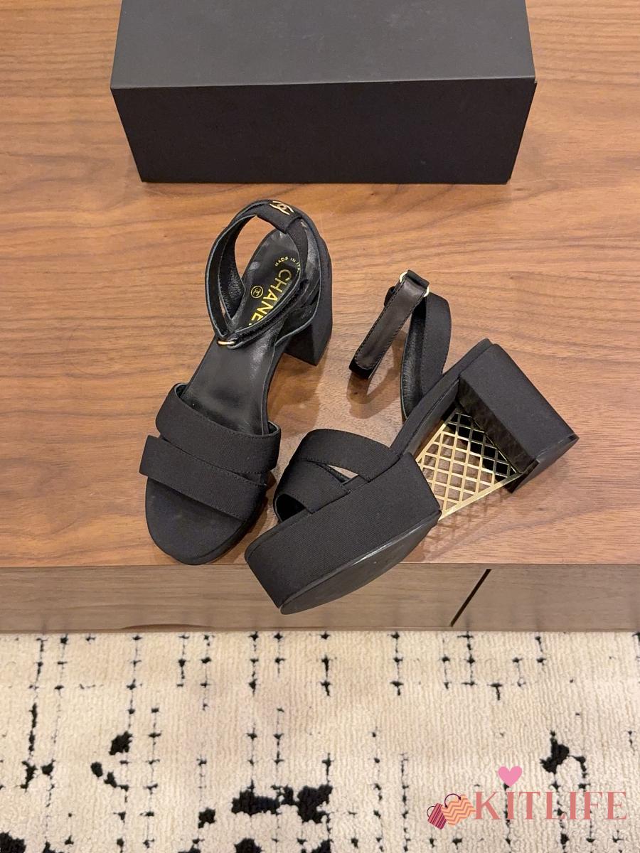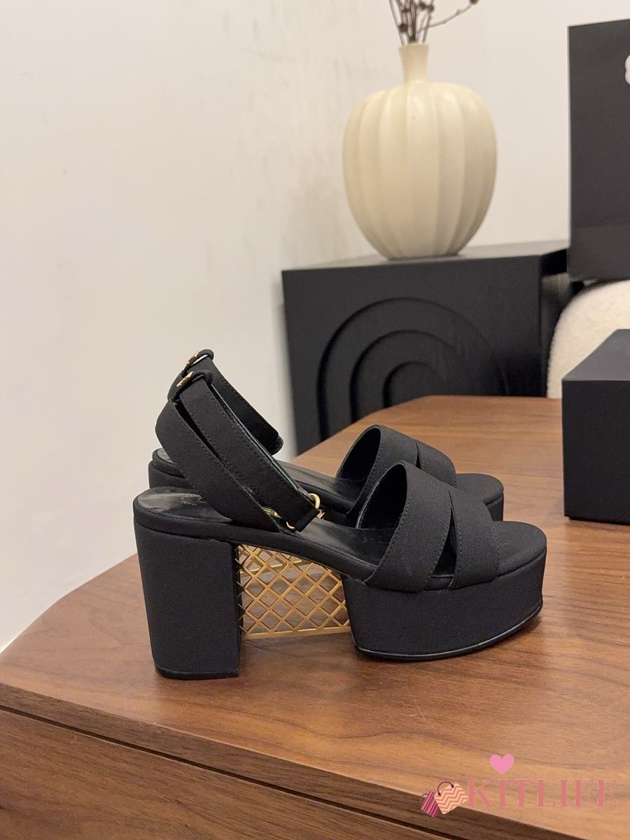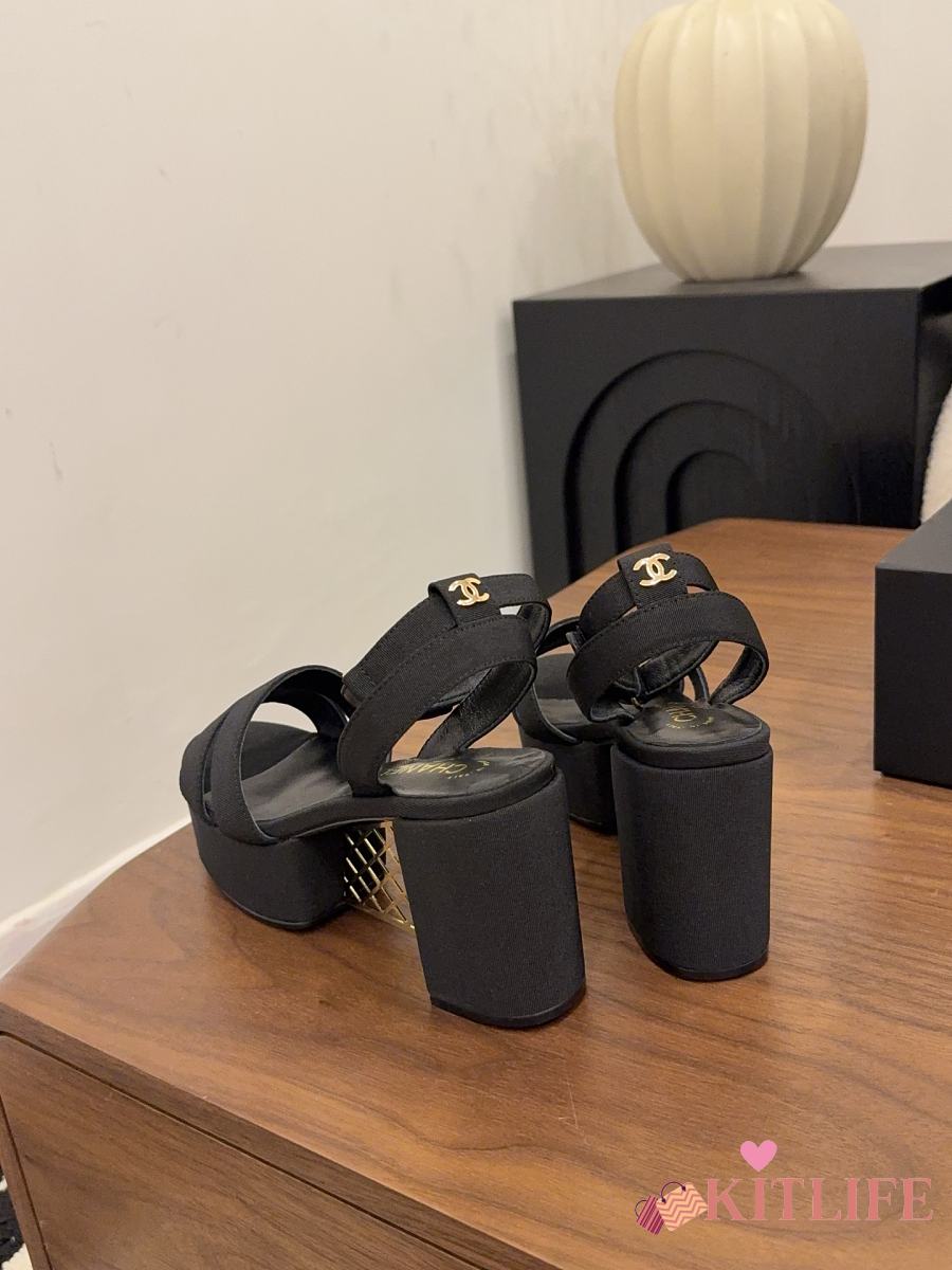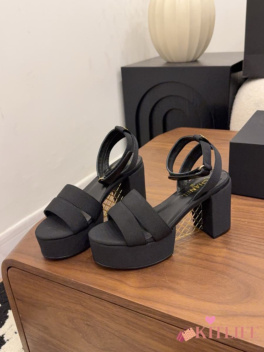 Kitlife Chanel 26 Classic Double C High-Heeled Platform Sandals Black Denim