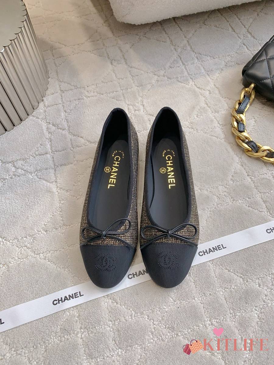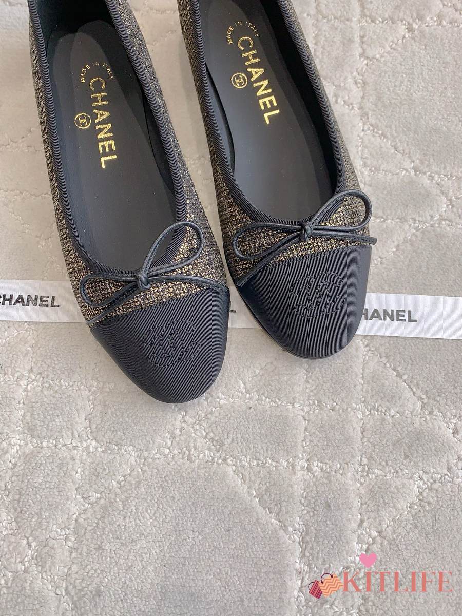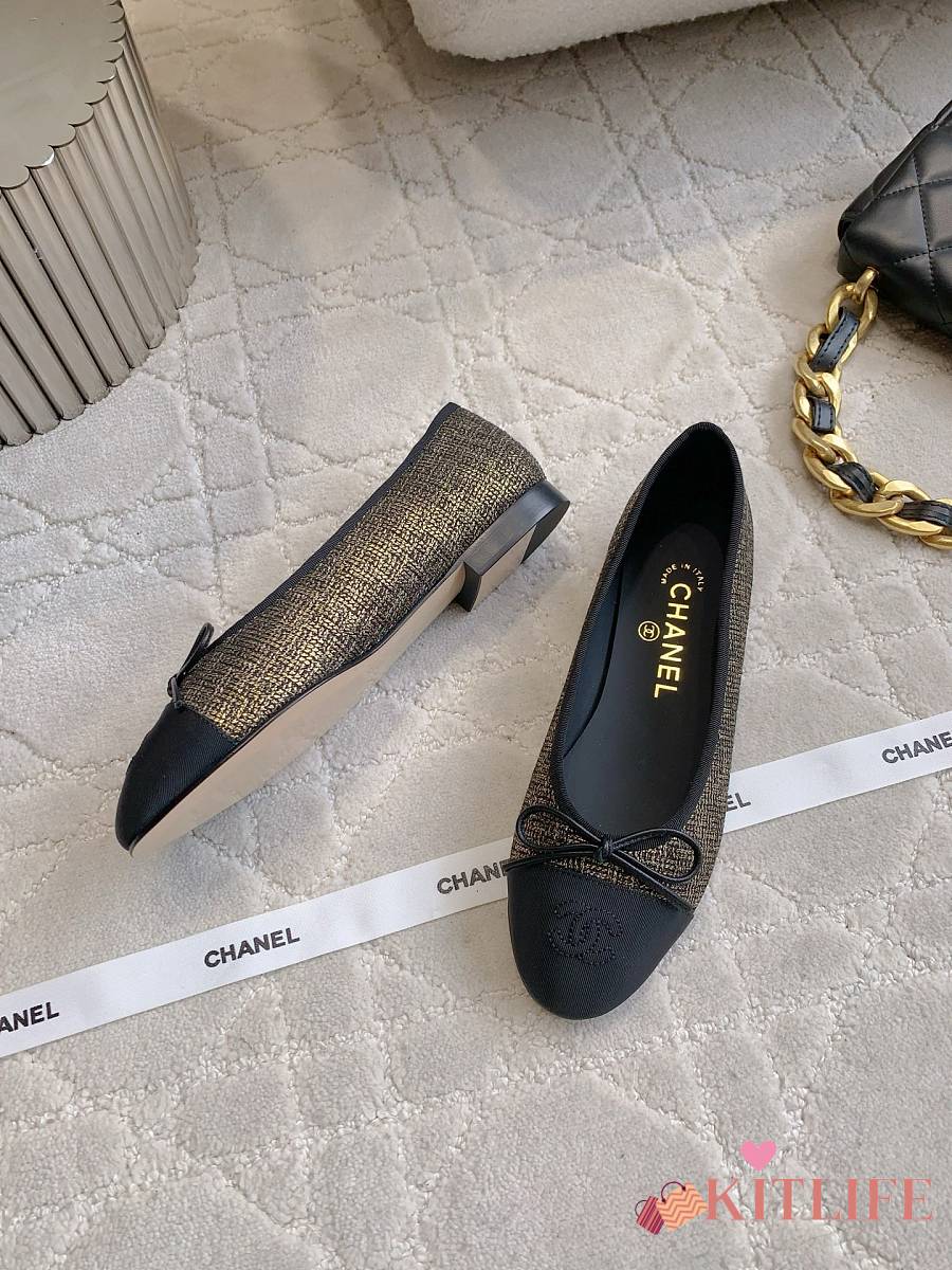 Kitlife Chanel Ballet Flats Shoes Black & Gold Tweed