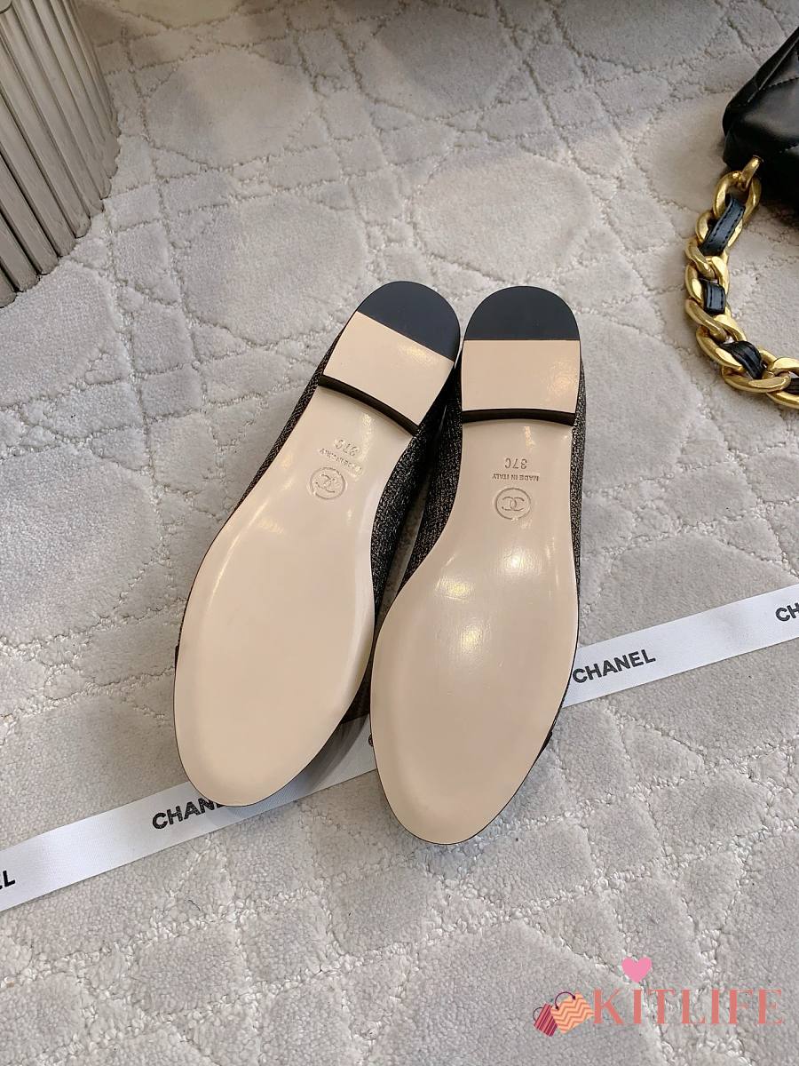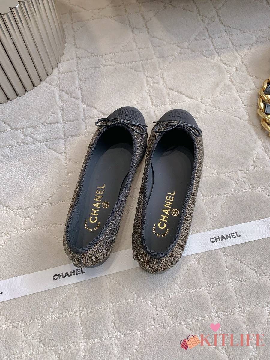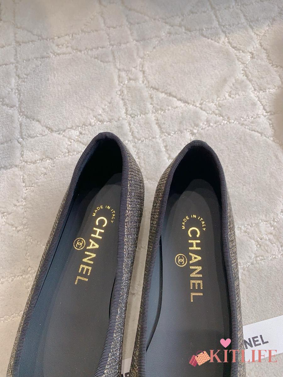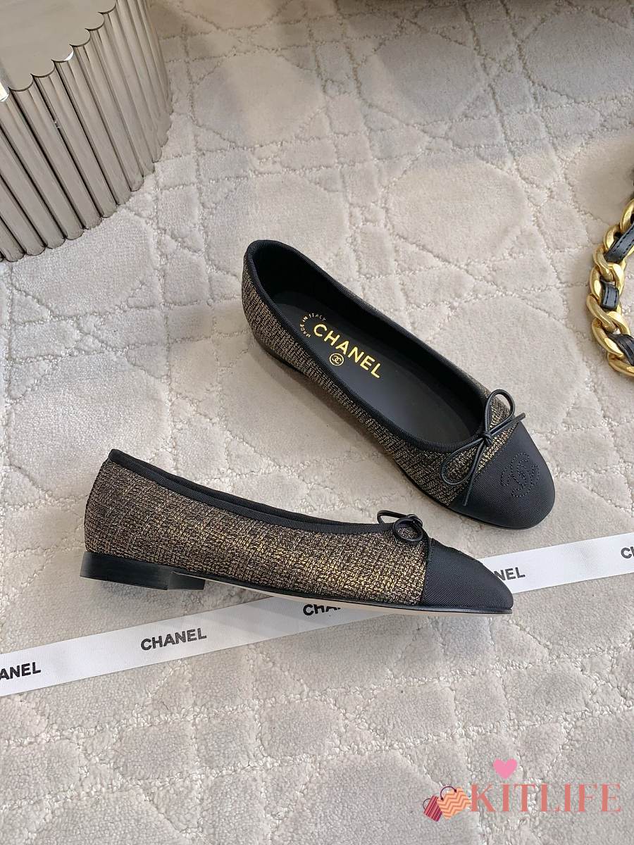 Kitlife Chanel Ballet Flats Shoes Black & Gold Tweed