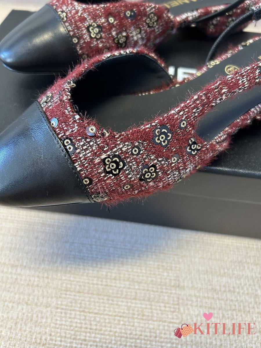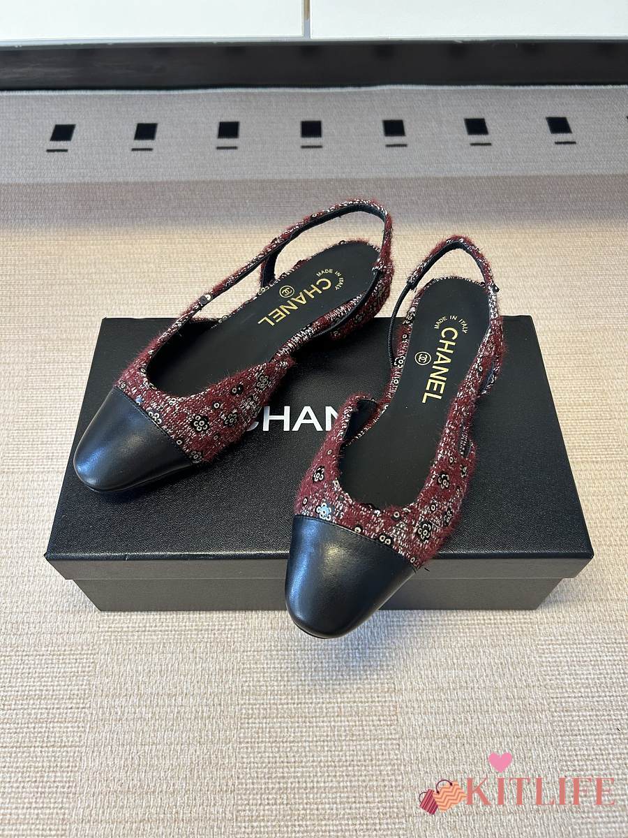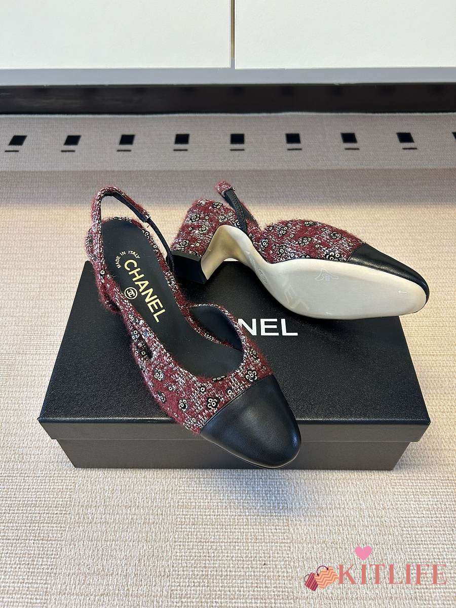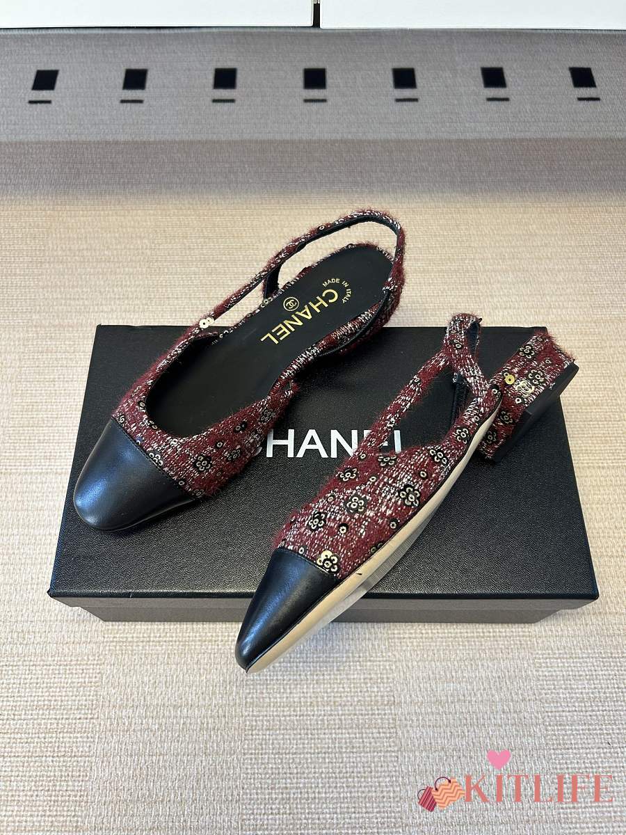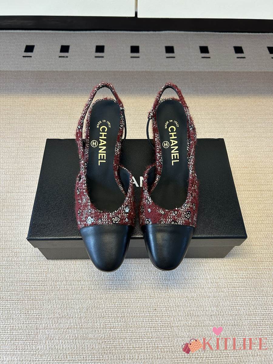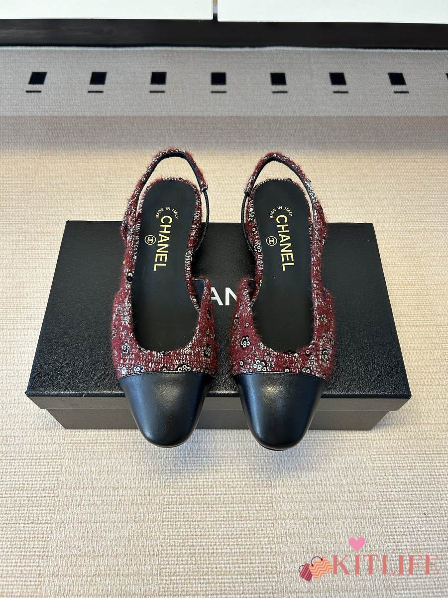 Kitlife Chanel Cap Toe CC Slingback Sandals Burgundy Tweed