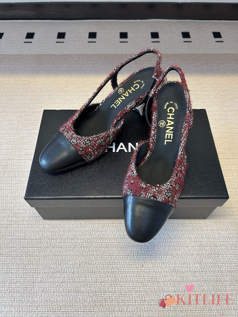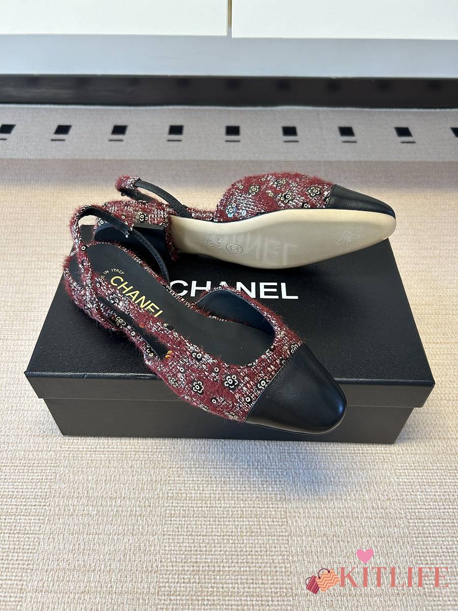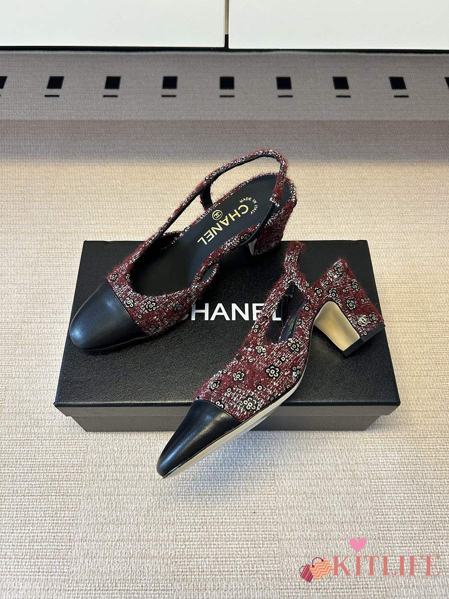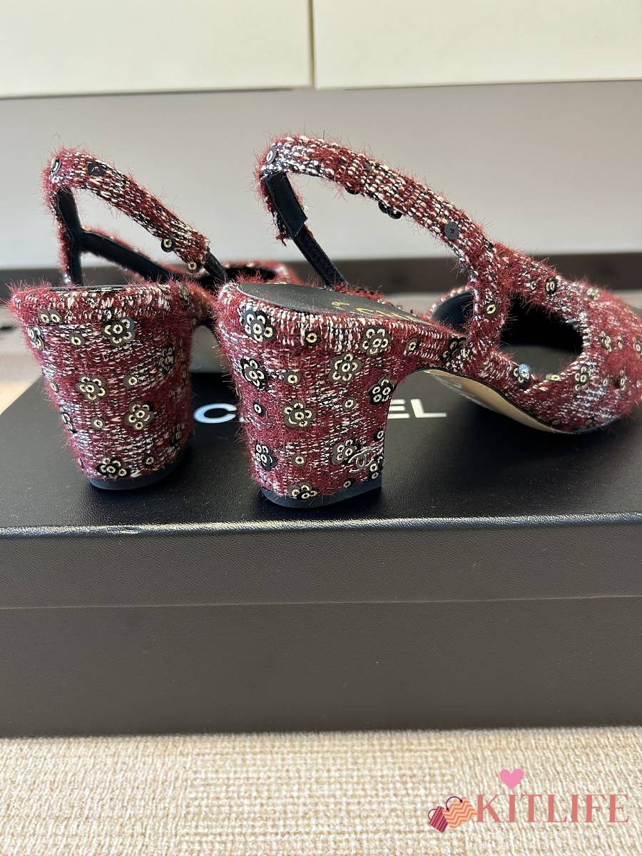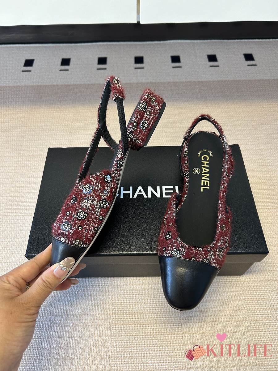 Kitlife Chanel Cap Toe CC Slingback Sandals Burgundy Tweed