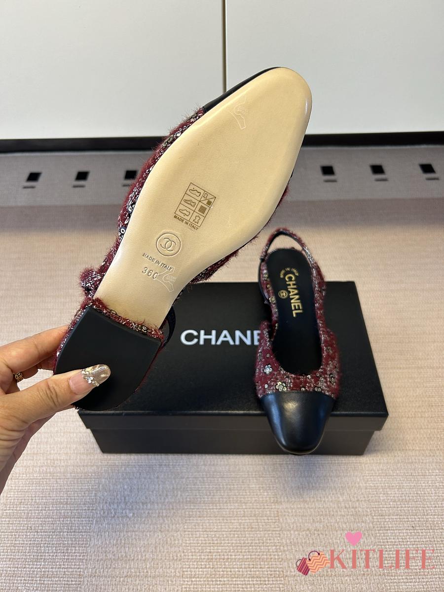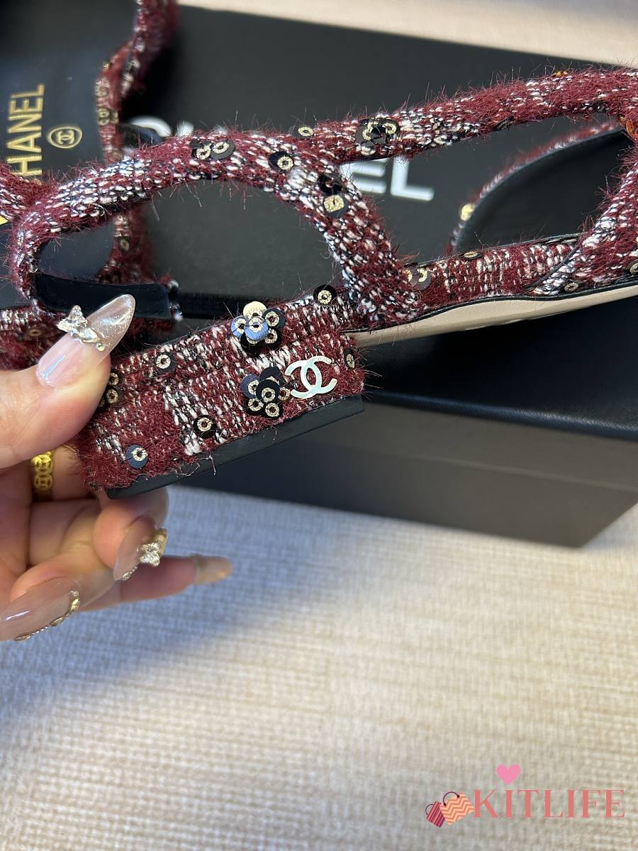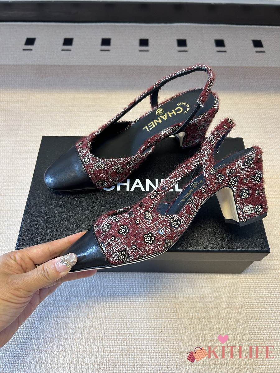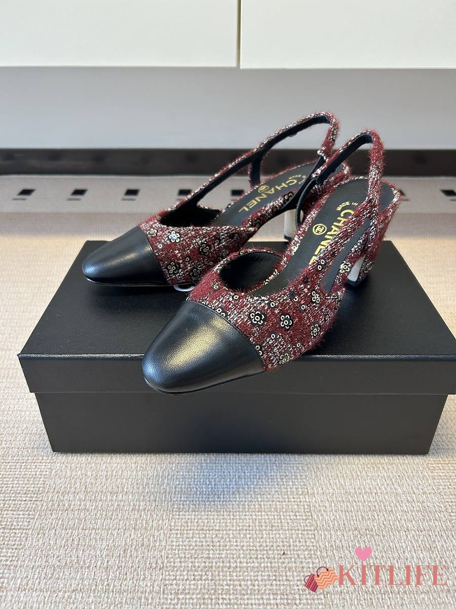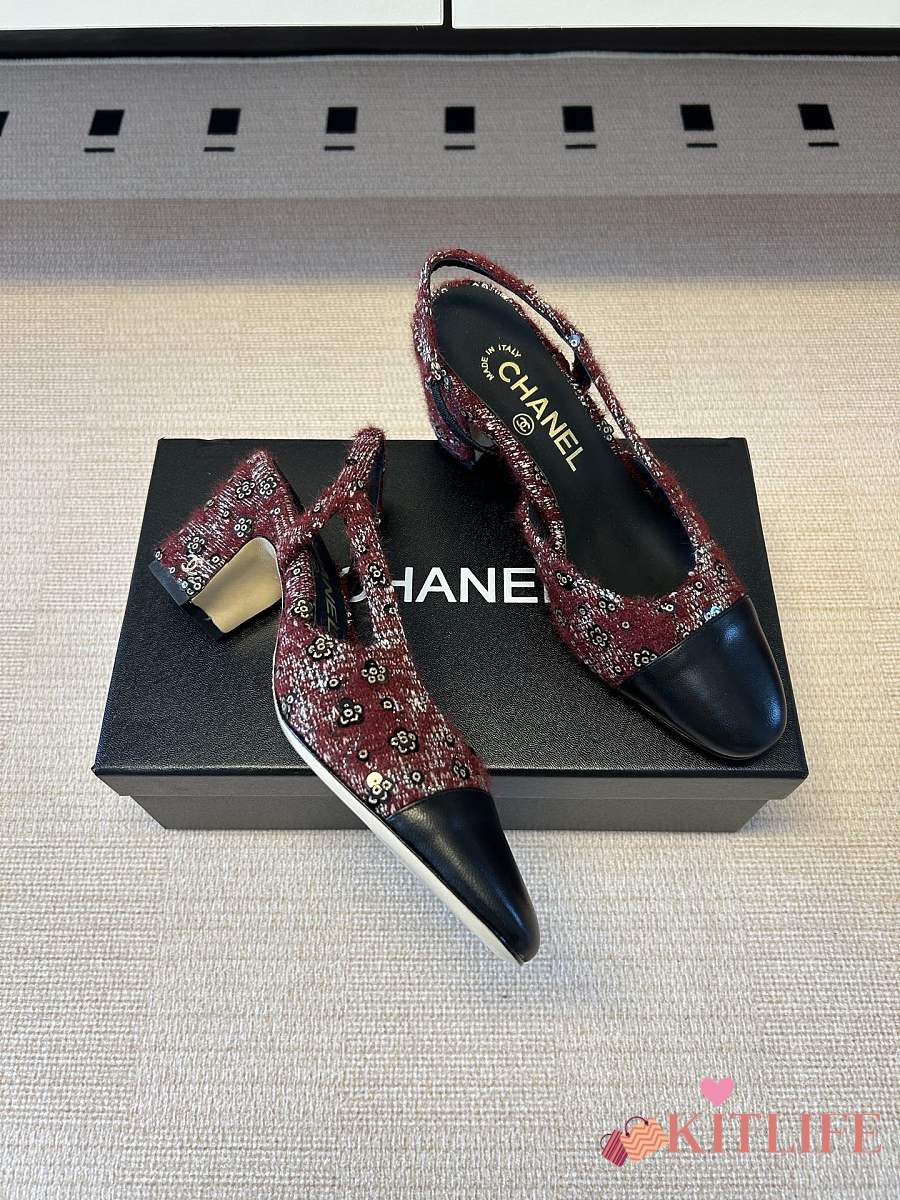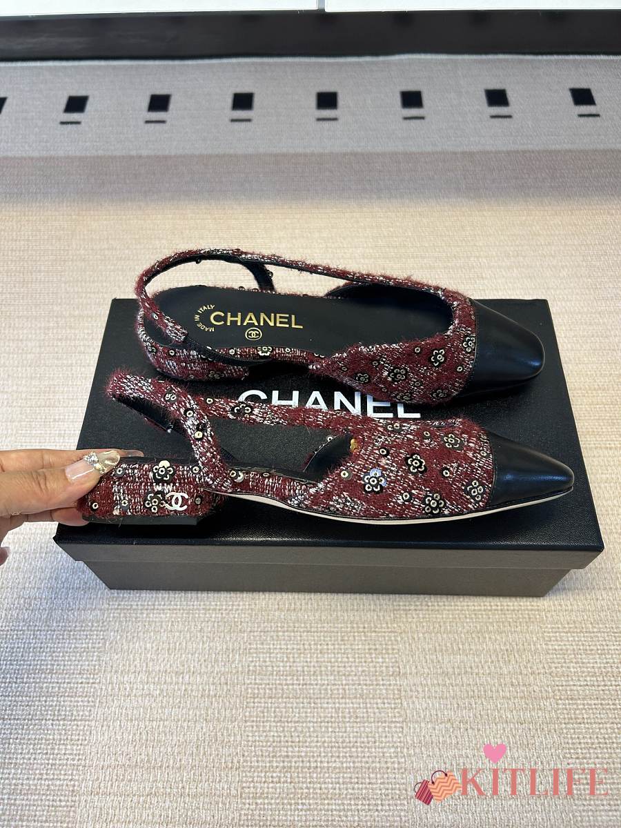 Kitlife Chanel Cap Toe CC Slingback Sandals Burgundy Tweed