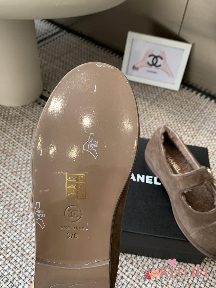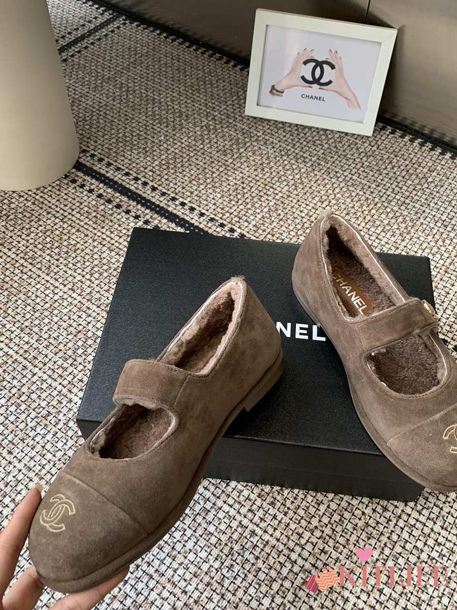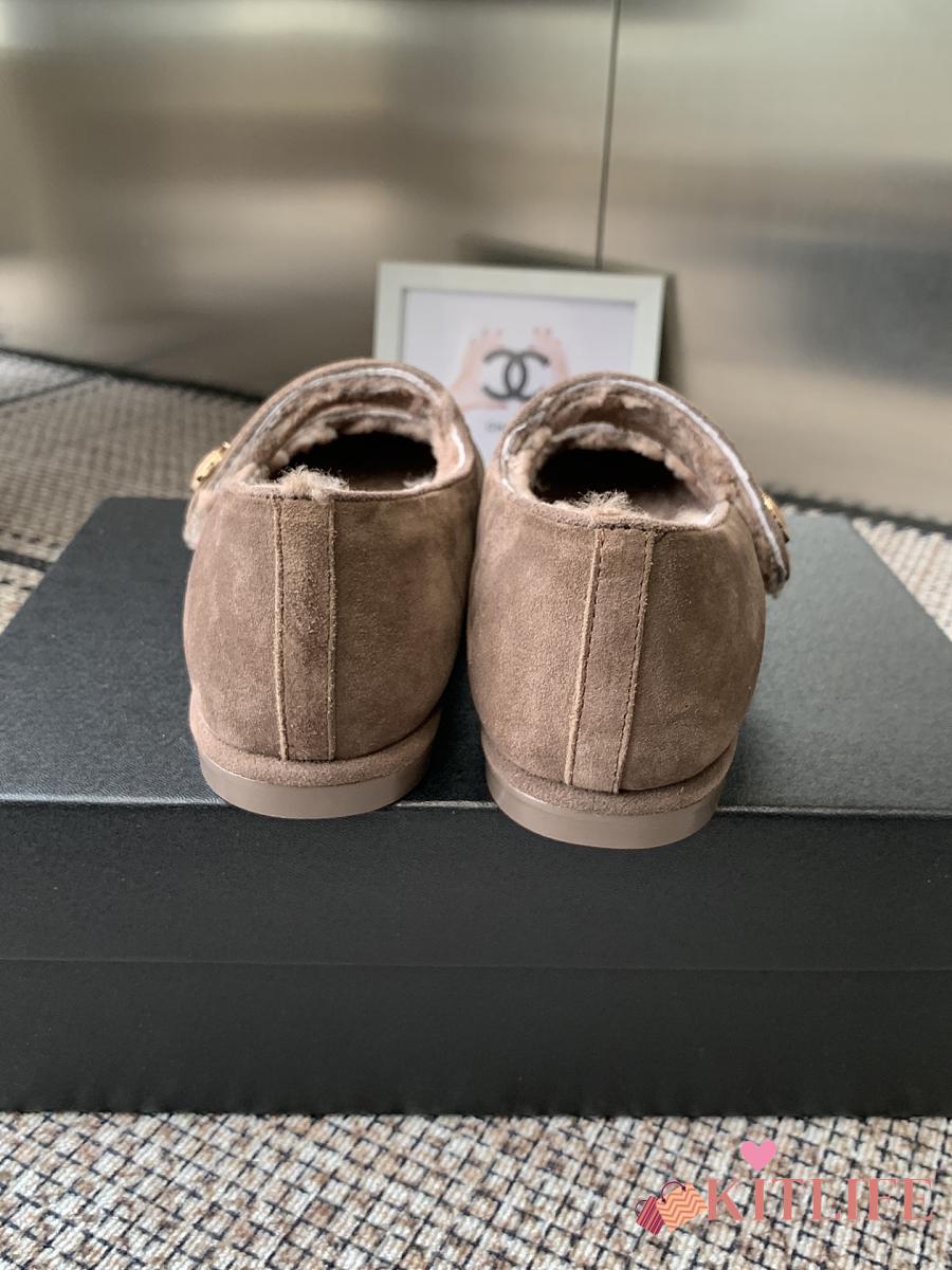 Kitlife Chanel Fur Ballet Flats Shoes Brown Suede