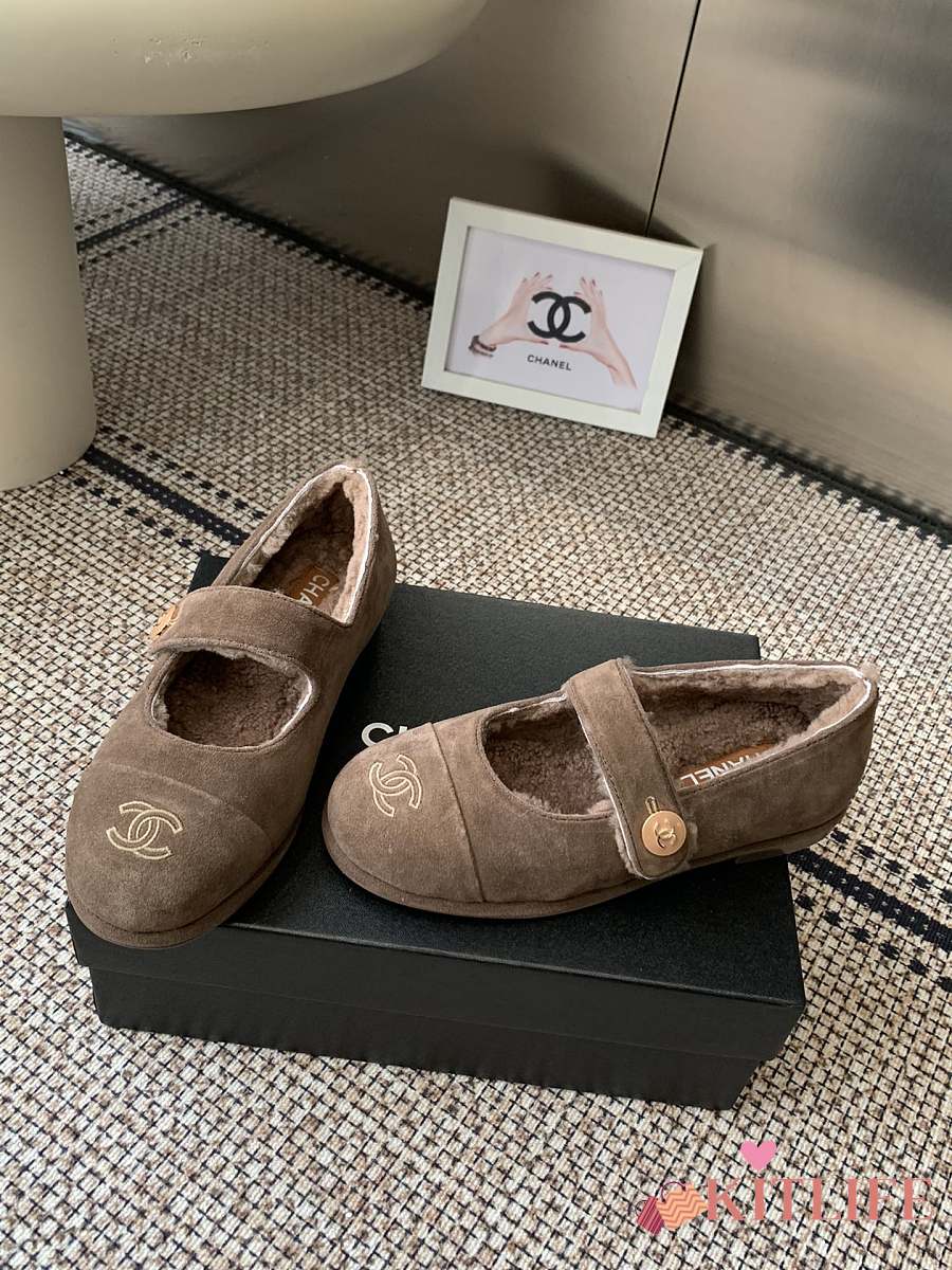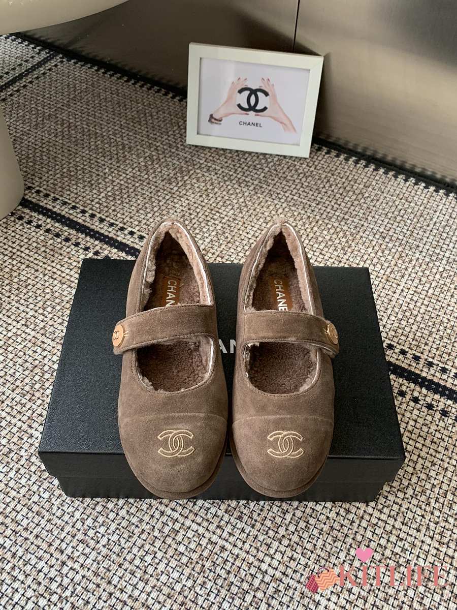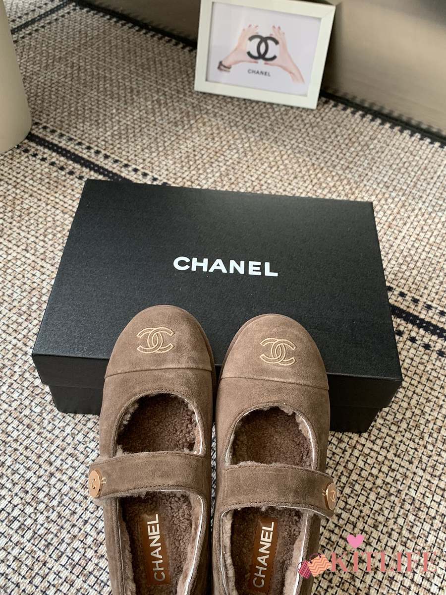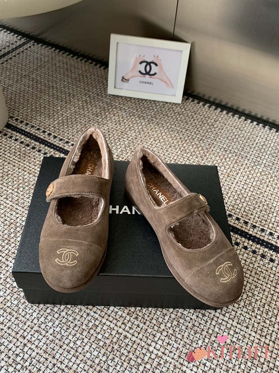 Kitlife Chanel Fur Ballet Flats Shoes Brown Suede