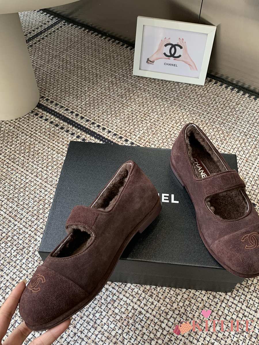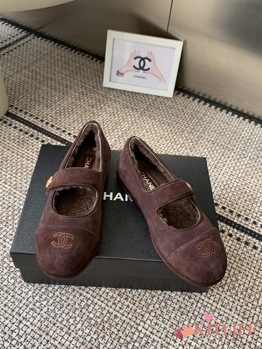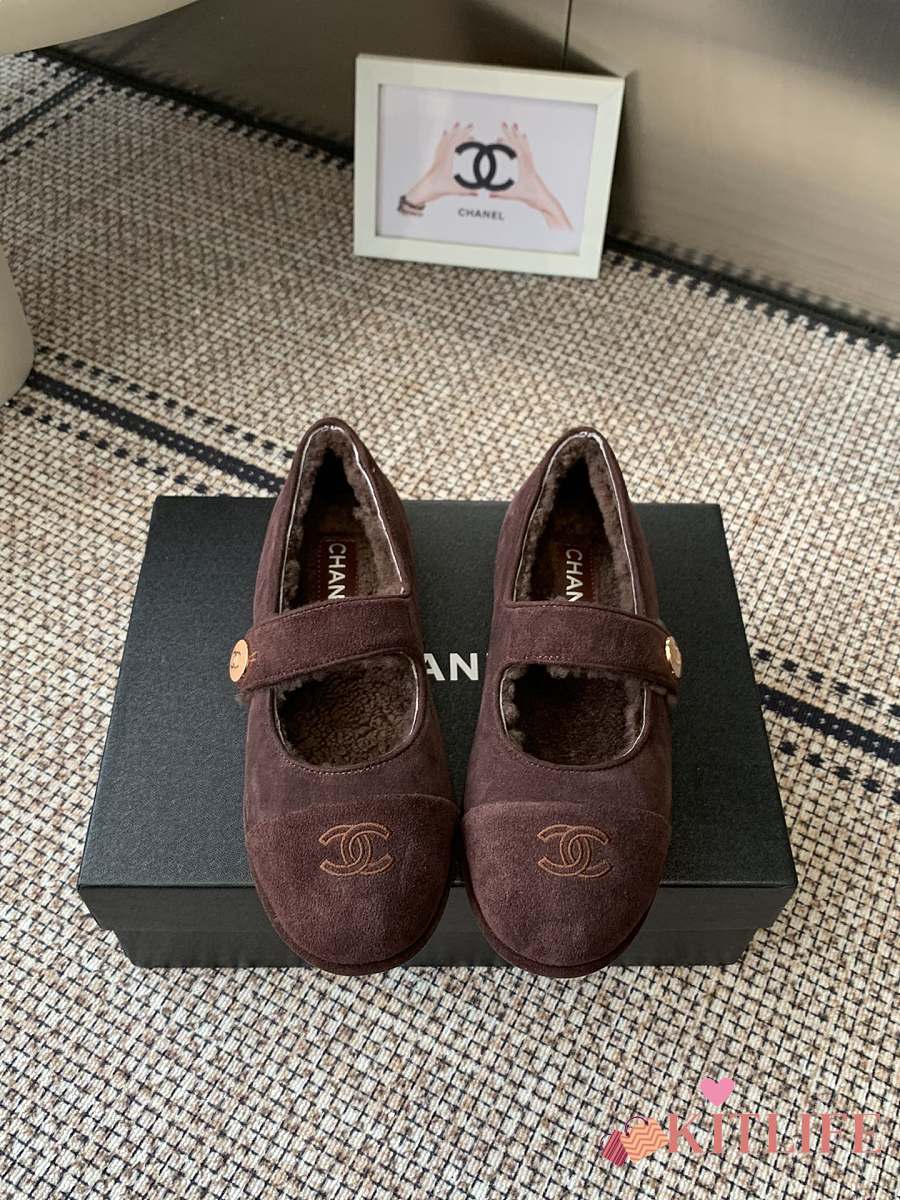 Kitlife Chanel Fur Ballet Flats Shoes Dark Brown Suede