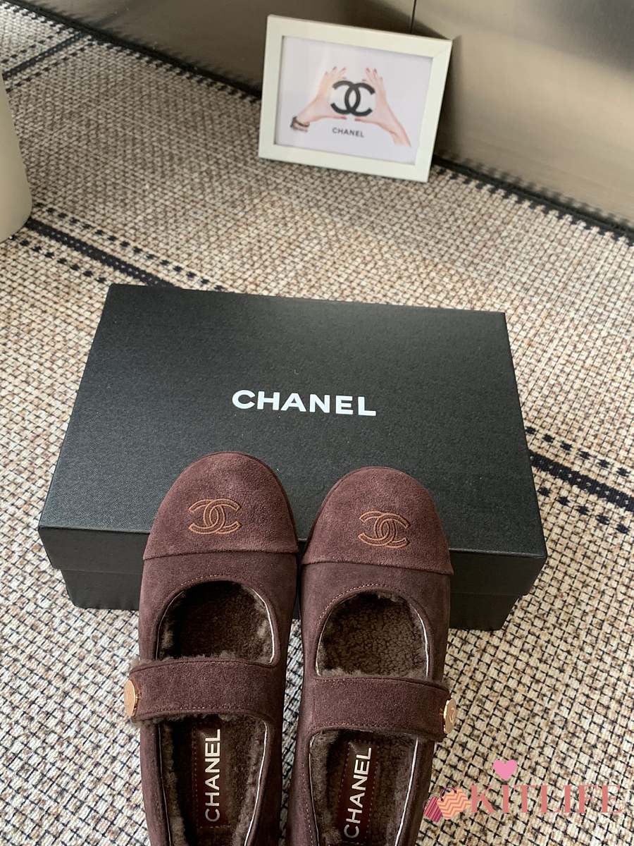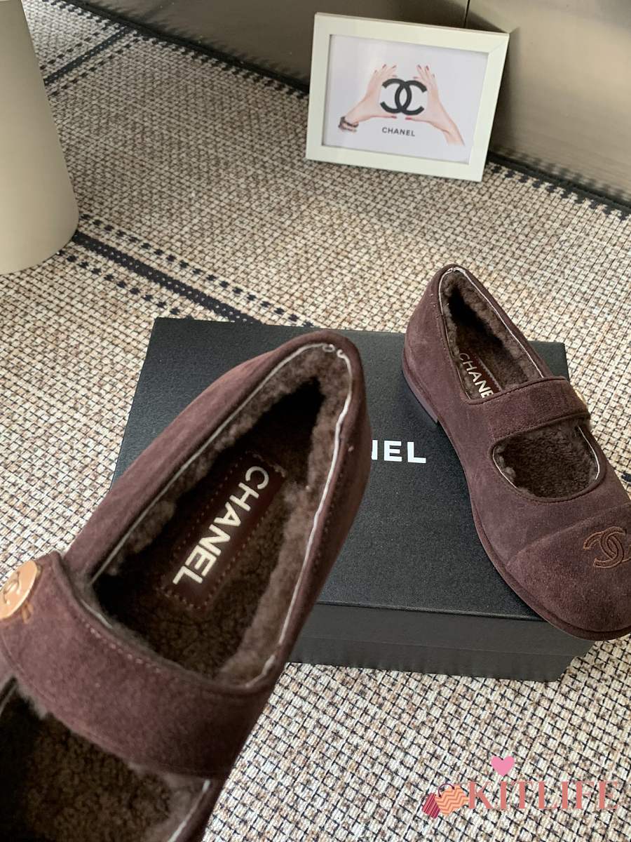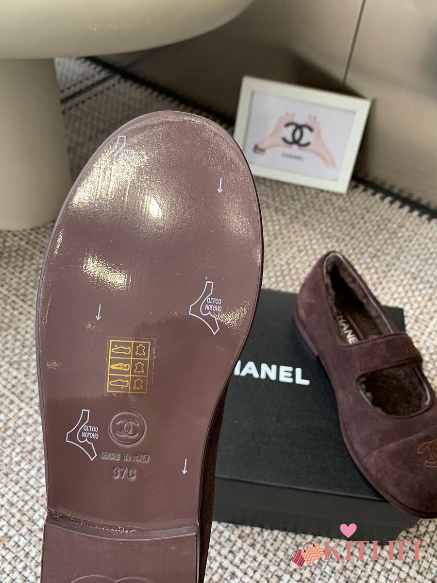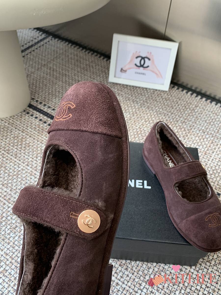 Kitlife Chanel Fur Ballet Flats Shoes Dark Brown Suede