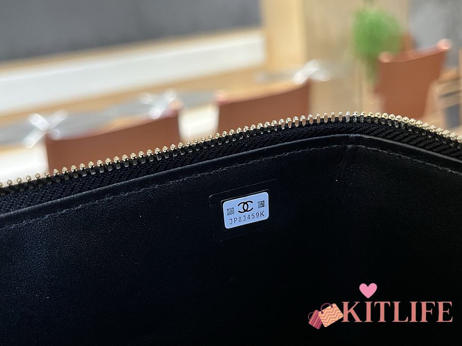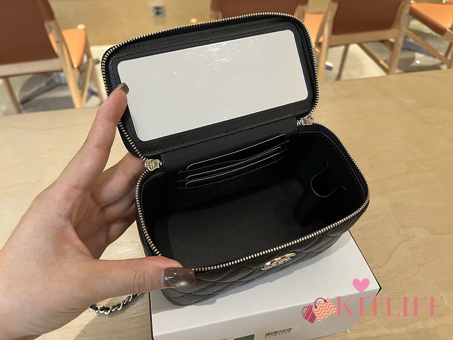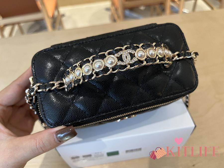 Kitlife Chanel Long Vanity With Chain Black Grained Calfskin, Imitation Pearl A96182 9.5x17x8cm