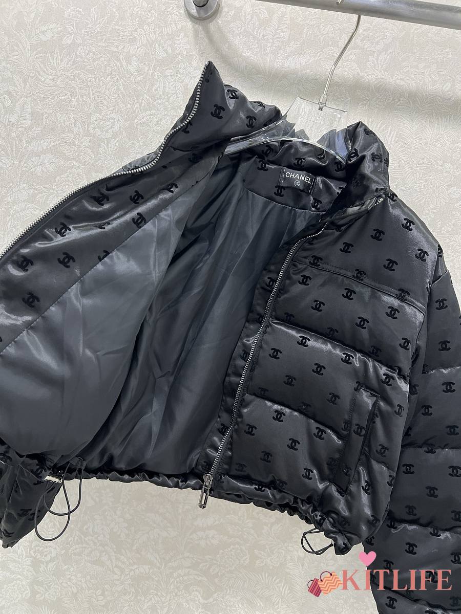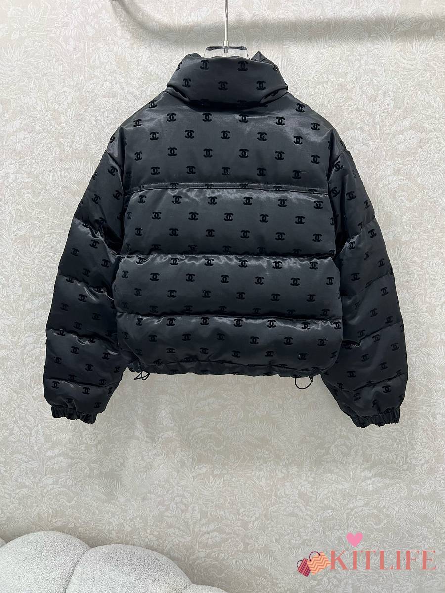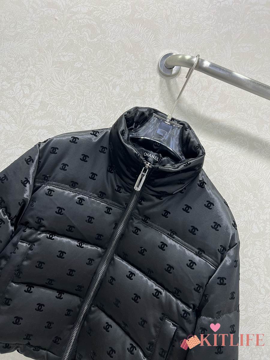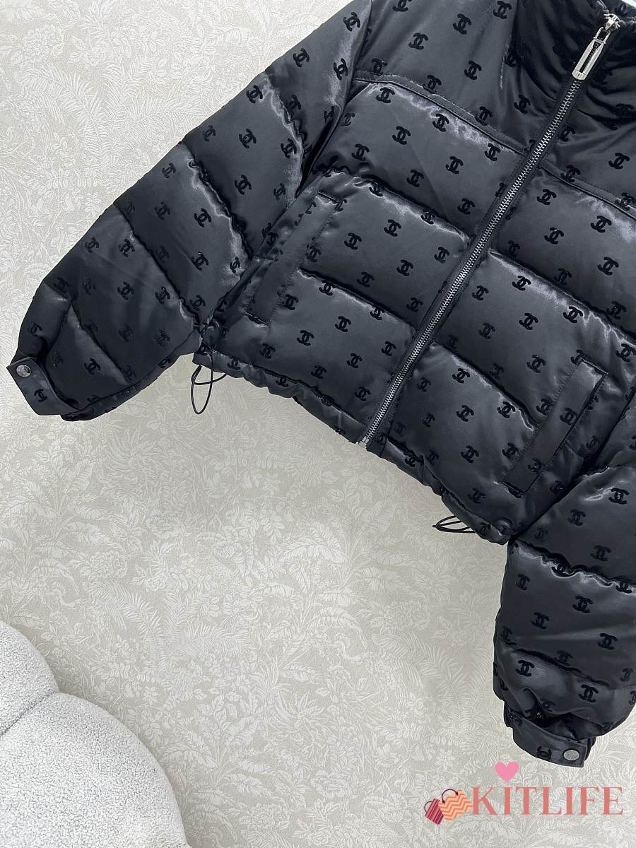 Kitlife Chanel Stand Collar Flocked Satin Down Jacket Black