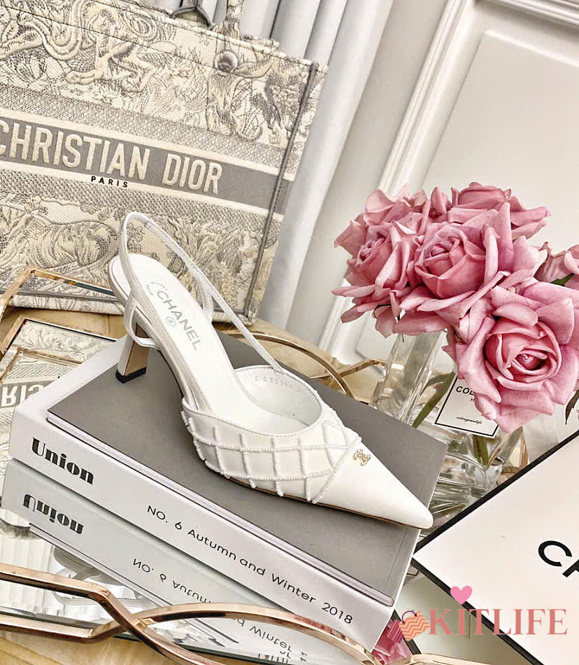 Kitlife Chanel White Satin CC Beads Embellished Slingback Pumps
