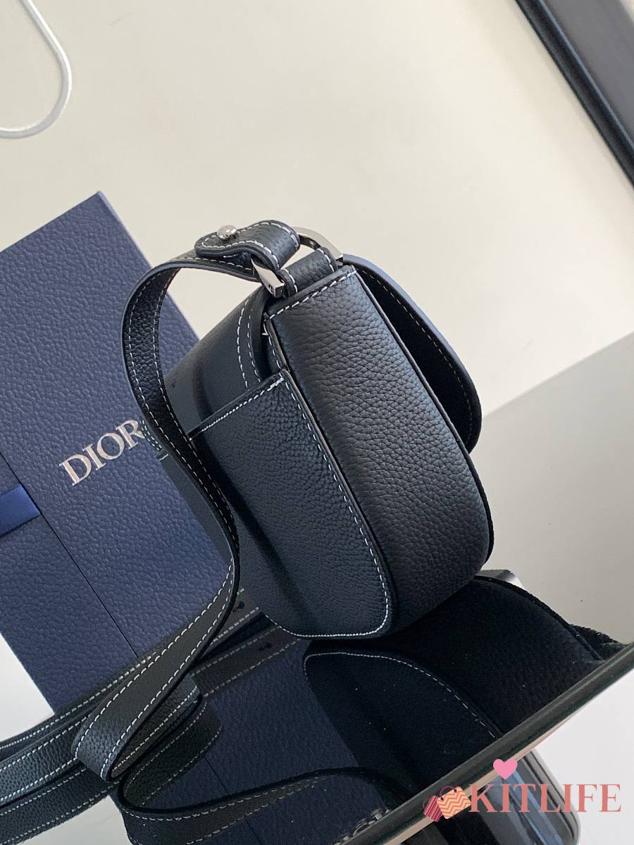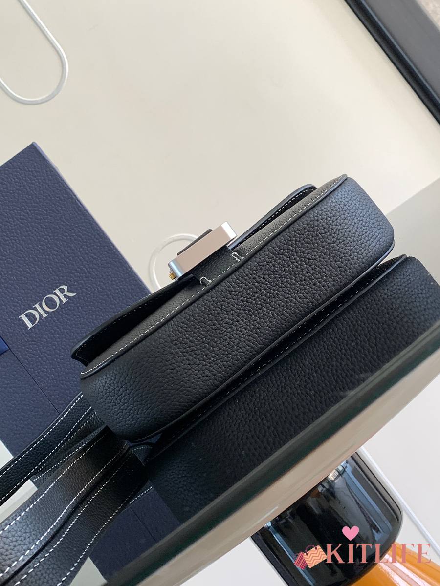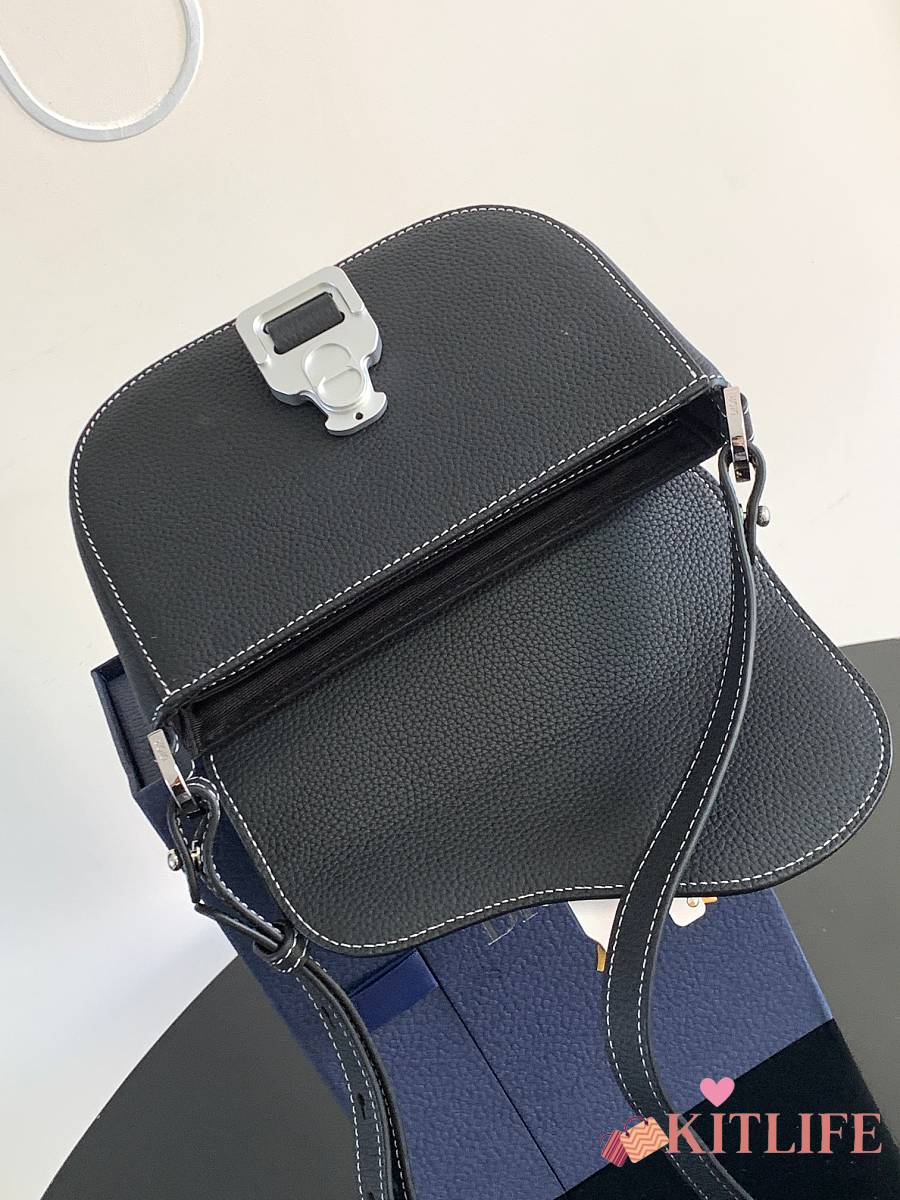Kitlife Dior Mini Saddle Messenger Bag with Flap Black Grained Calfskin 20x13.5x5.5cm