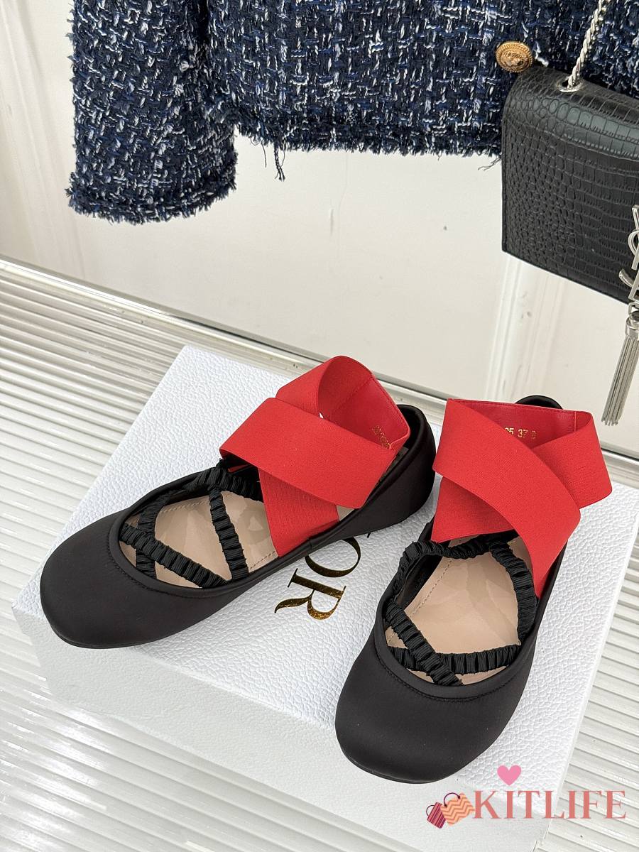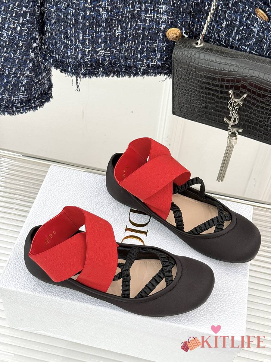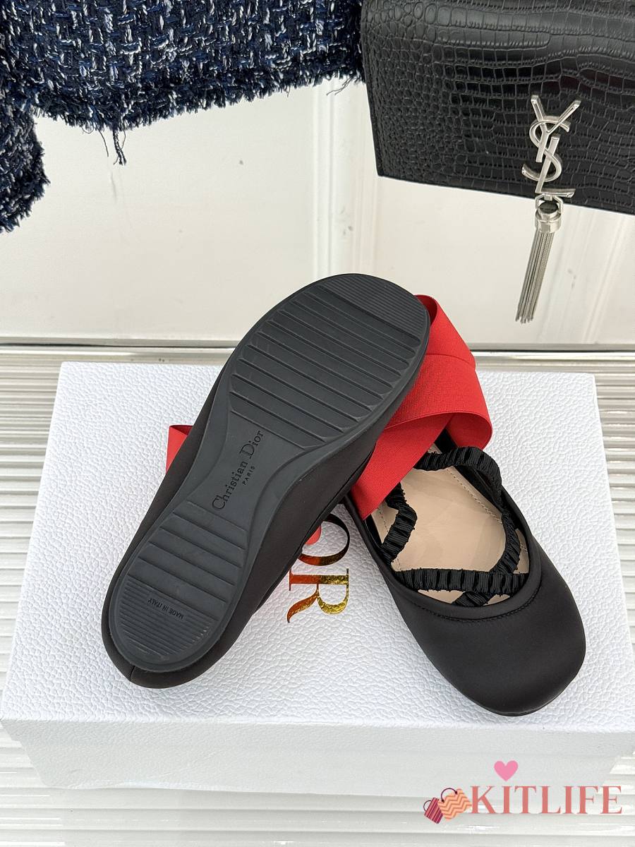 Kitlife Dior Shade Black Leather Ballerinas With Red Elastic Bands