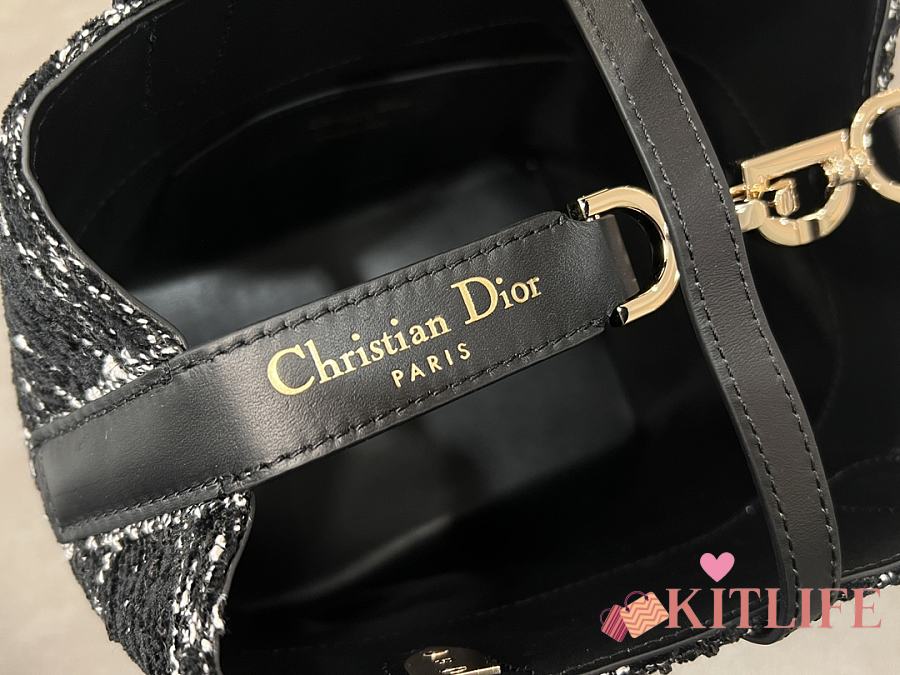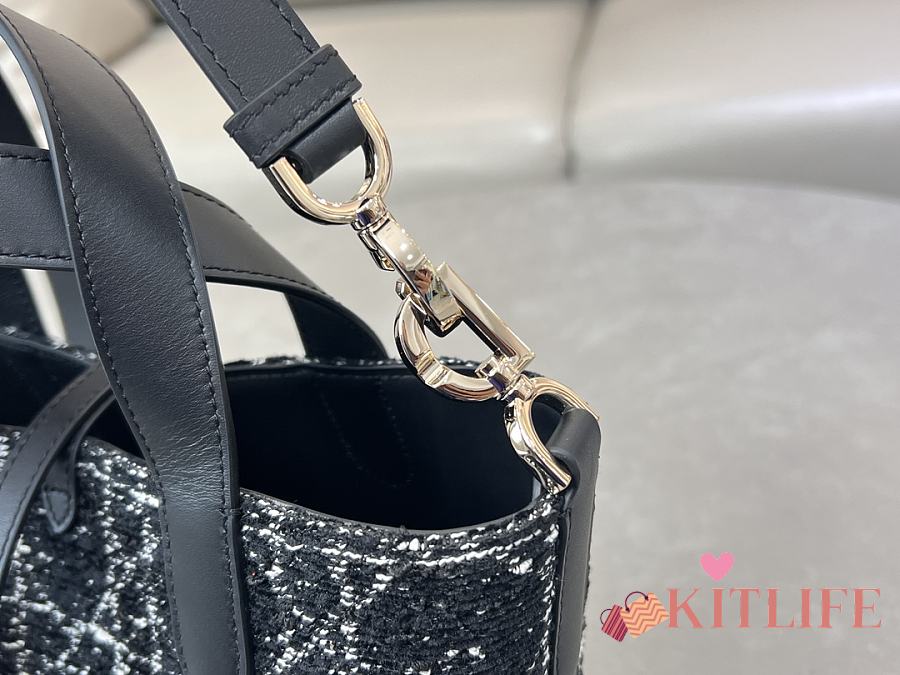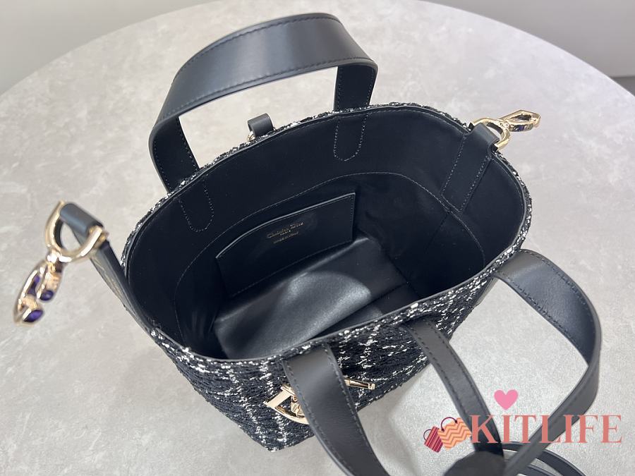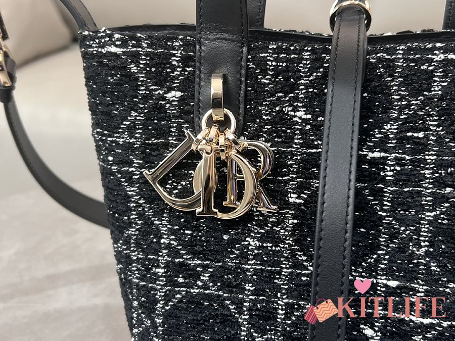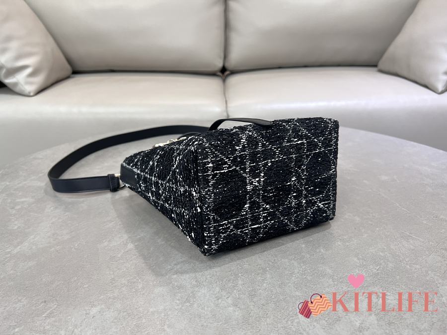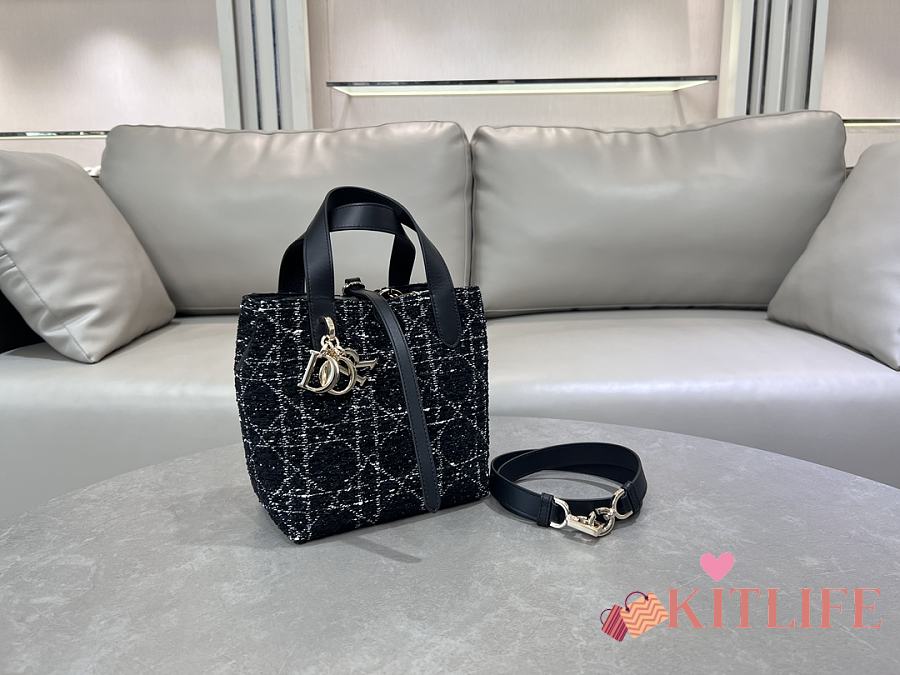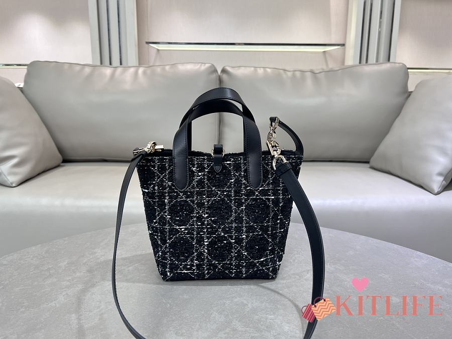 Kitlife Dior Small Toujours Vertical Tote Bag Black Tweed with White Cannage Motif 16×18×12cm