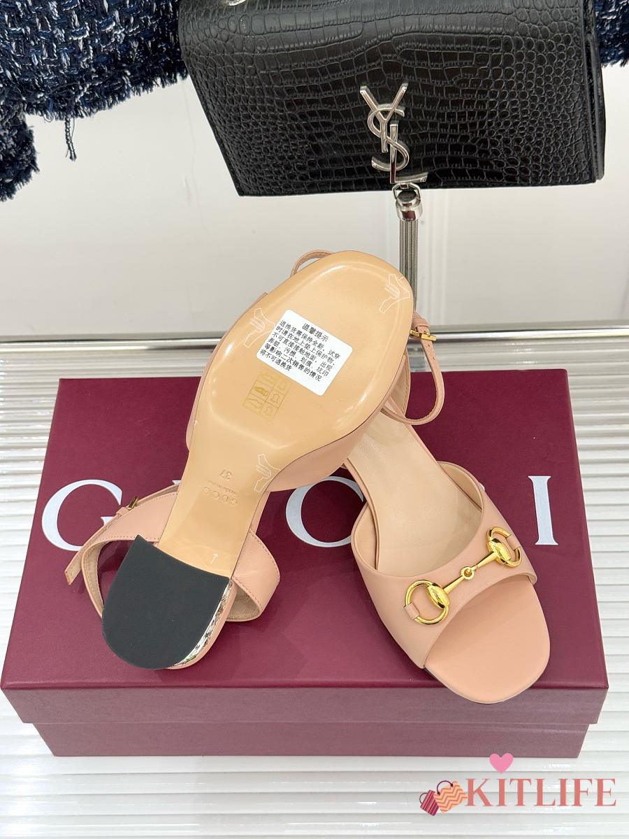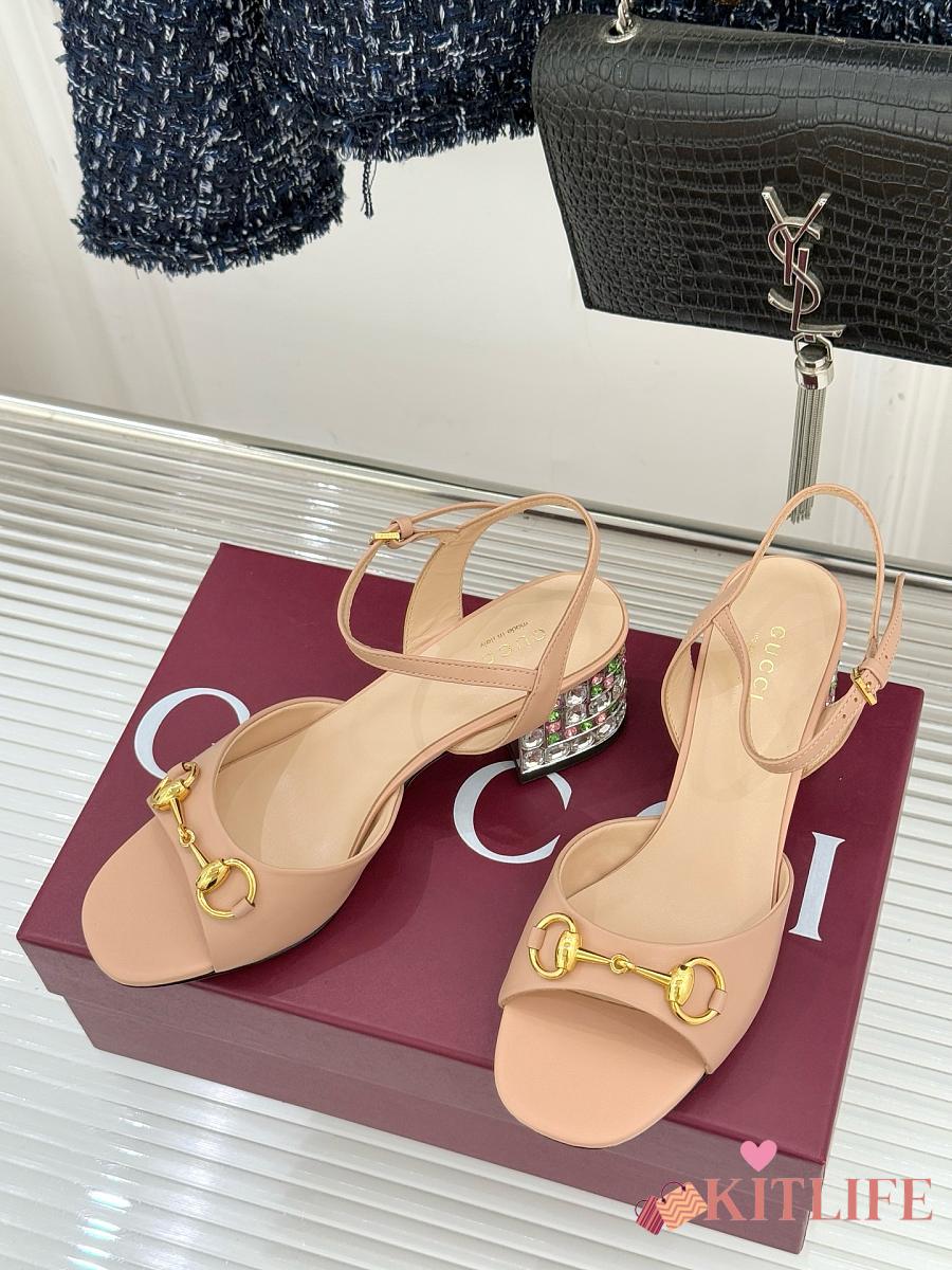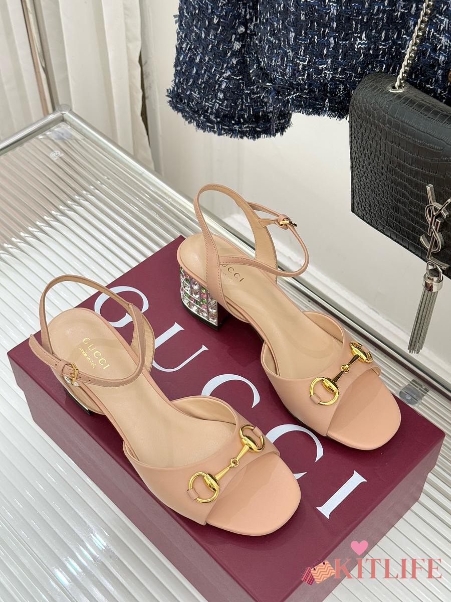 Kitlife Gucci Classic Horsebit Rhinestone Chunky Heel 55mm Sandals Beige