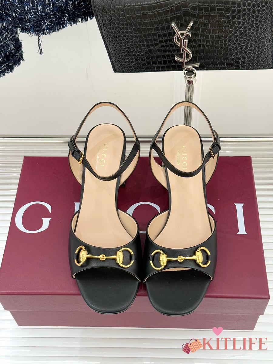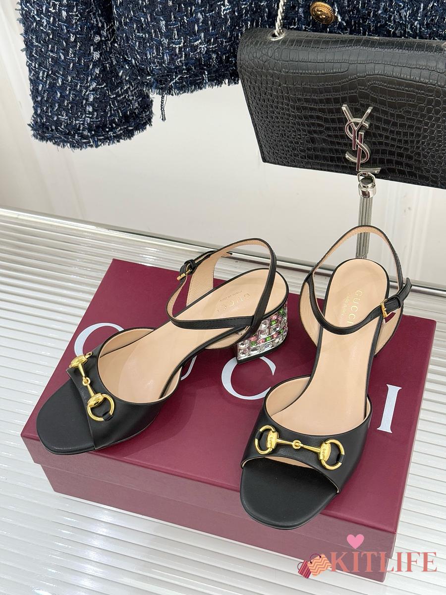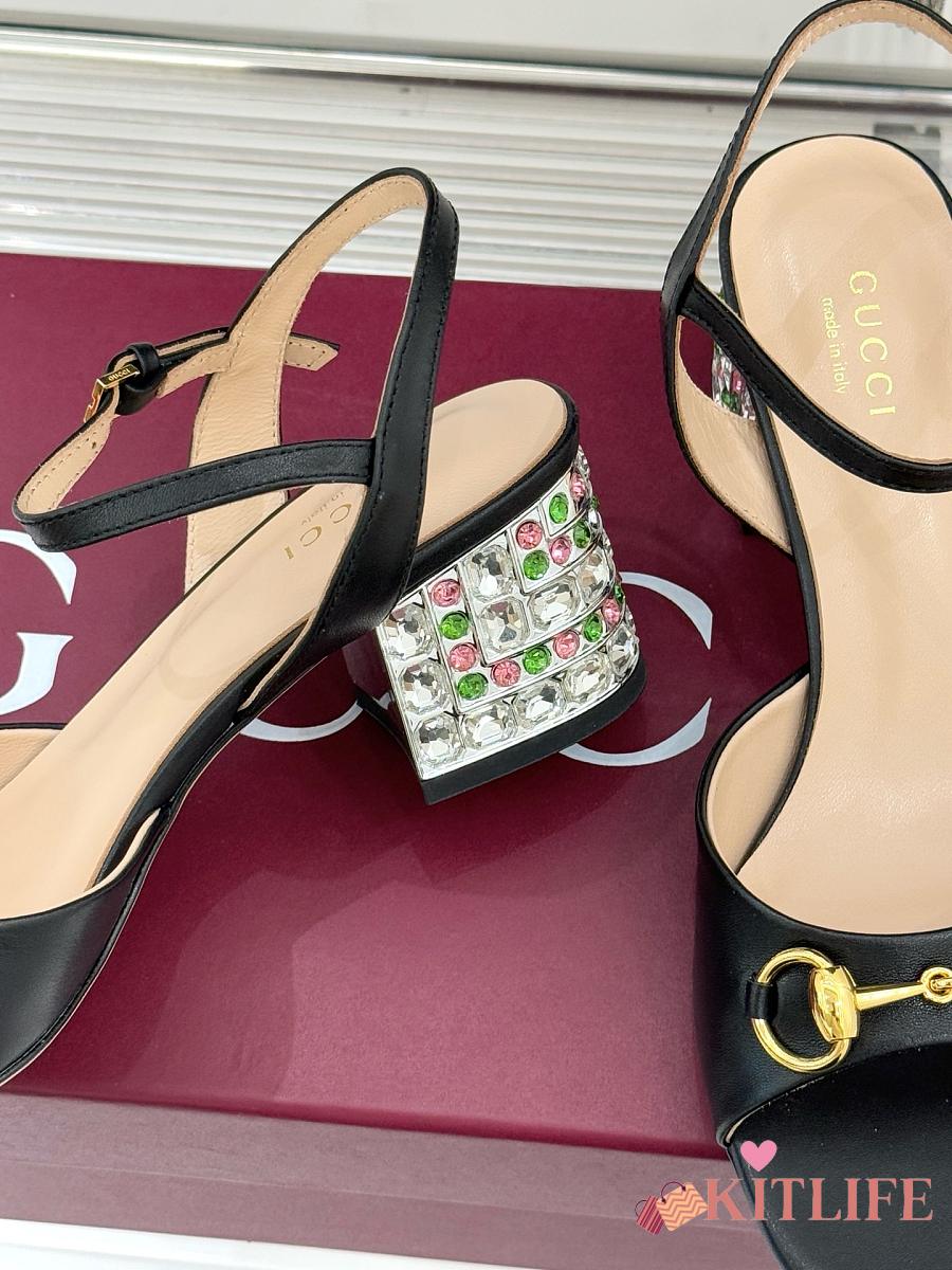 Kitlife Gucci Classic Horsebit Rhinestone Chunky Heel 55mm Sandals Black