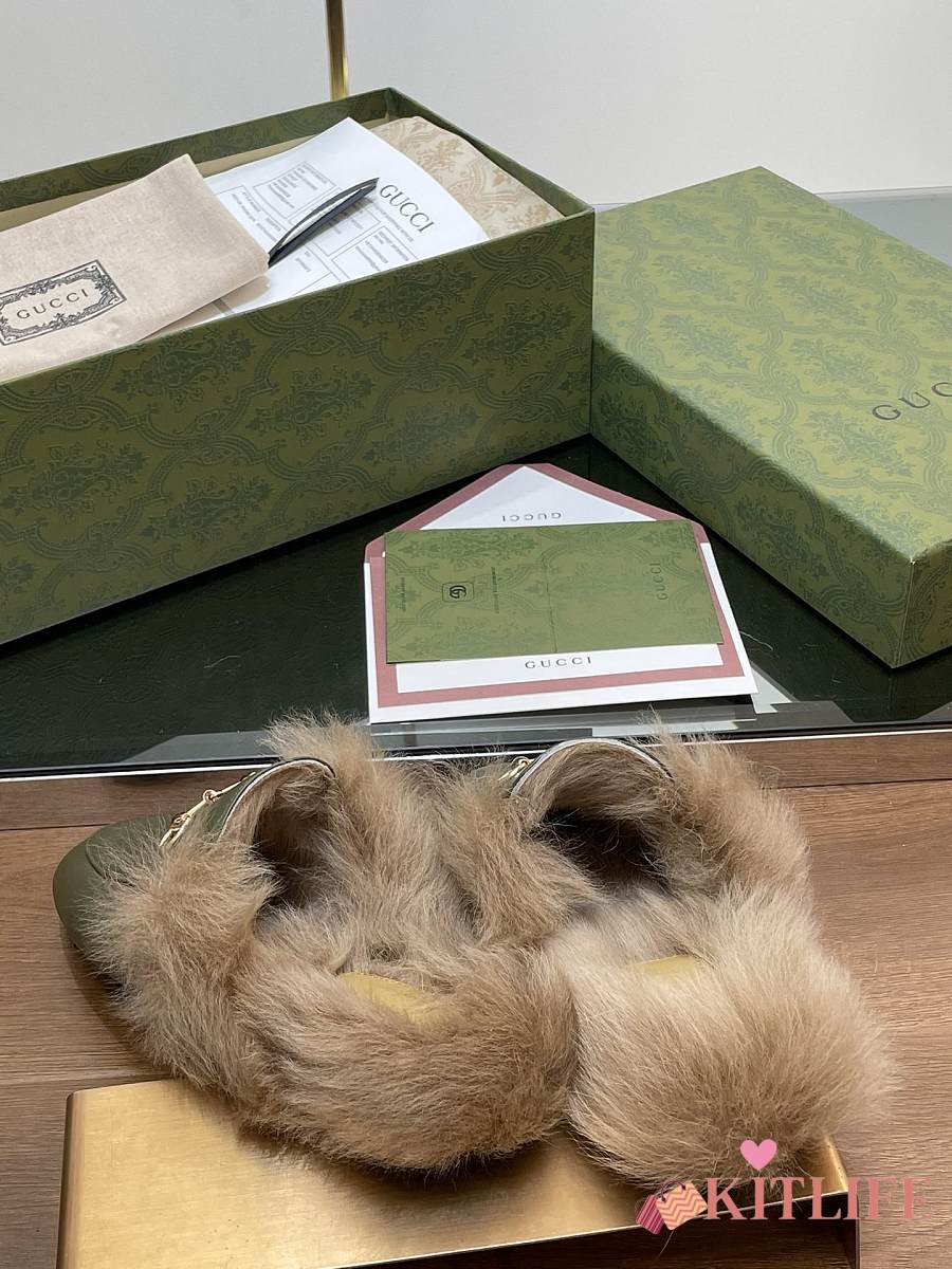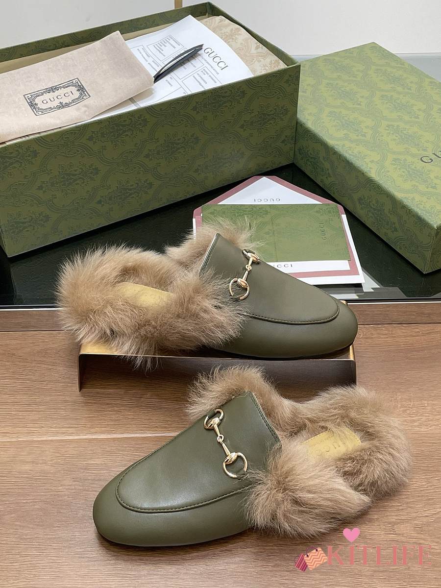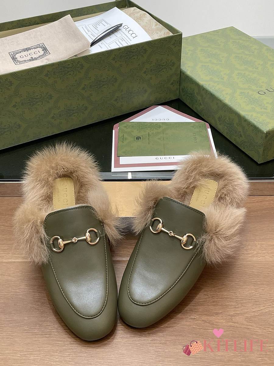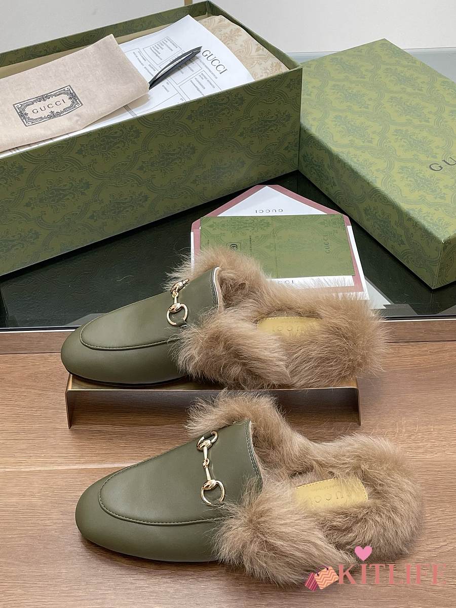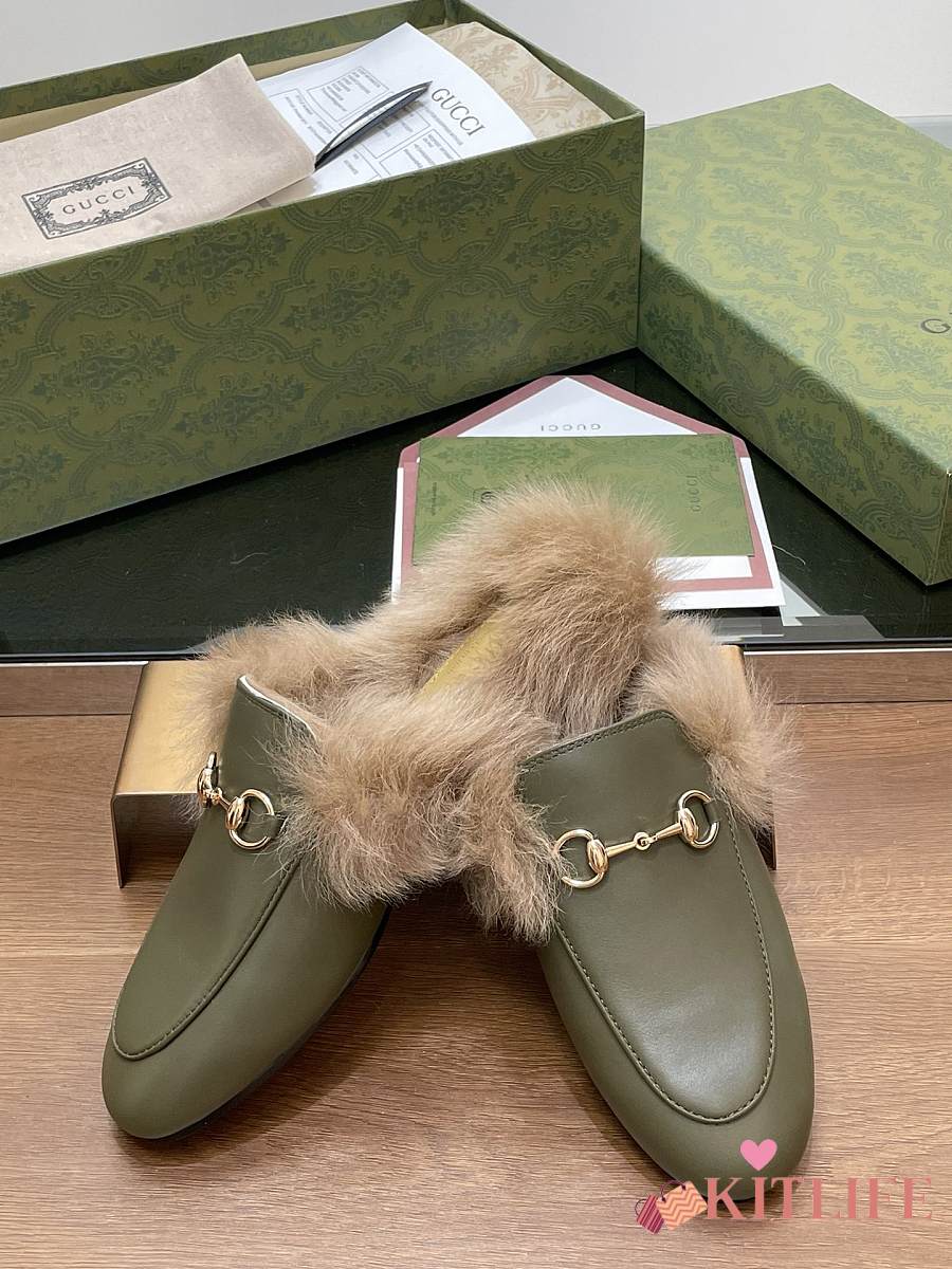 Kitlife Gucci Green Olive Calfskin Fur Women Princetown Slippers