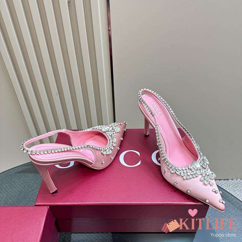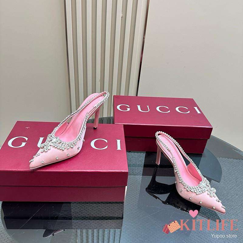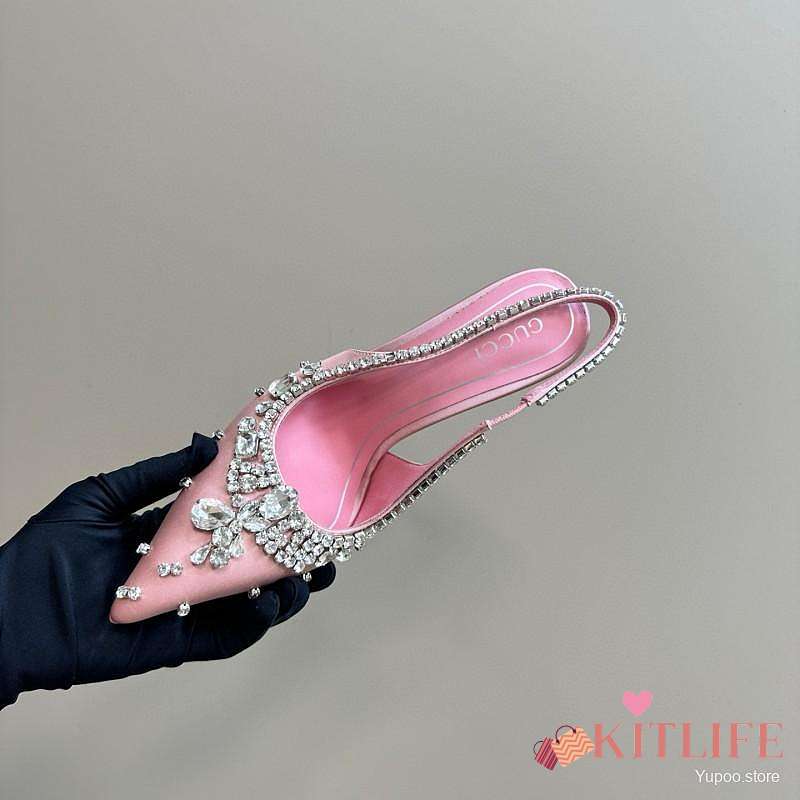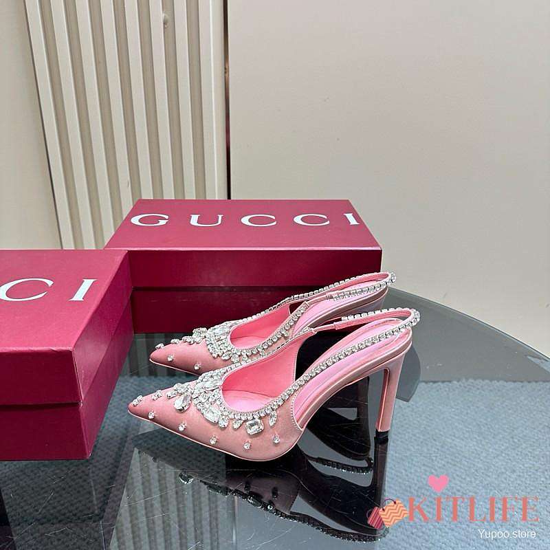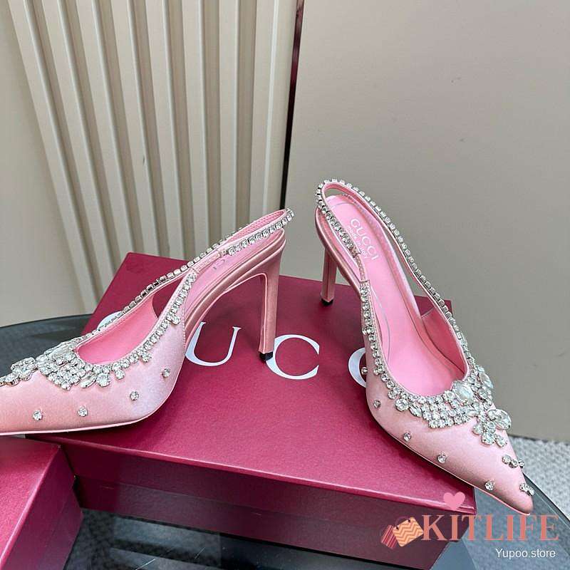 Kitlife Gucci Talia 105 Embellished Satin Slingback Pumps Pink