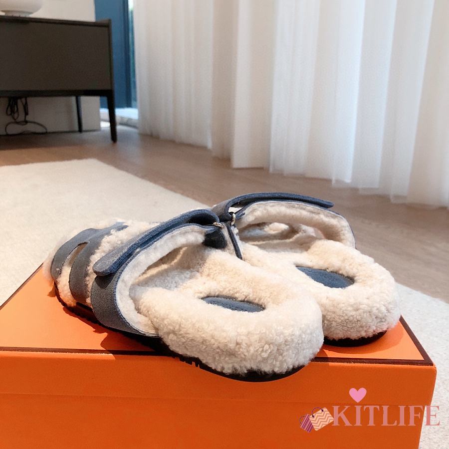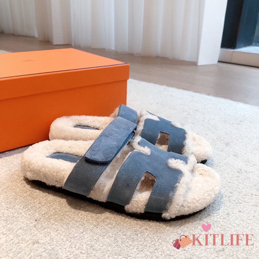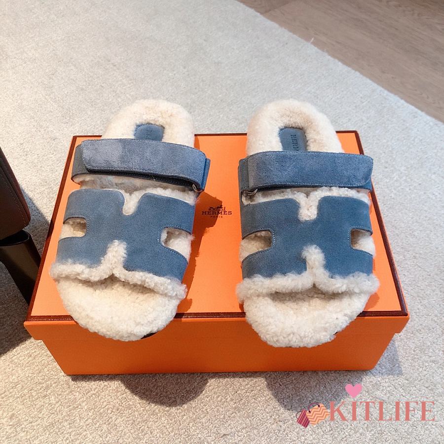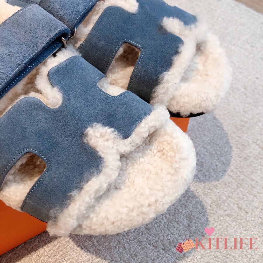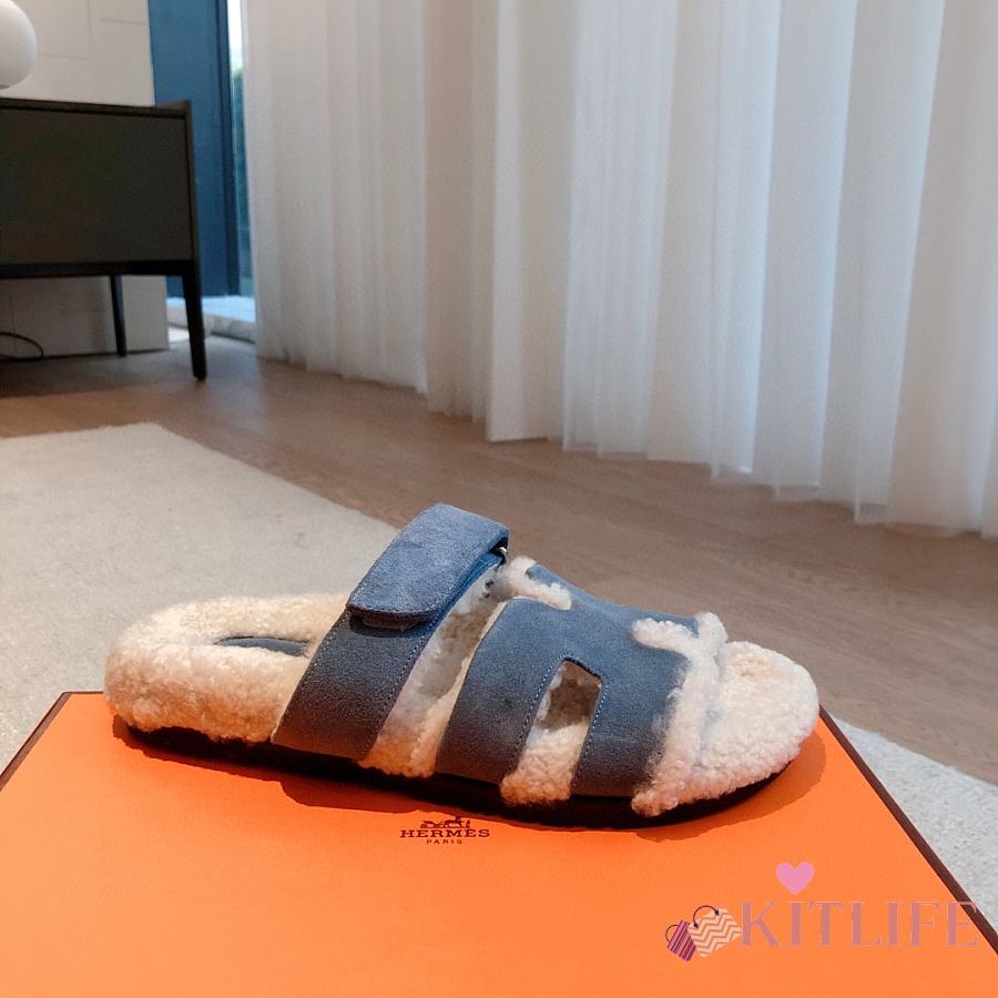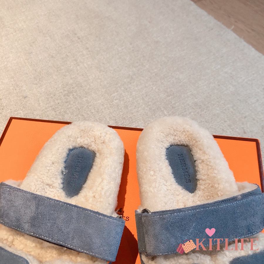 Kitlife Hermes Chypre Shearling Sandals Blue Suede