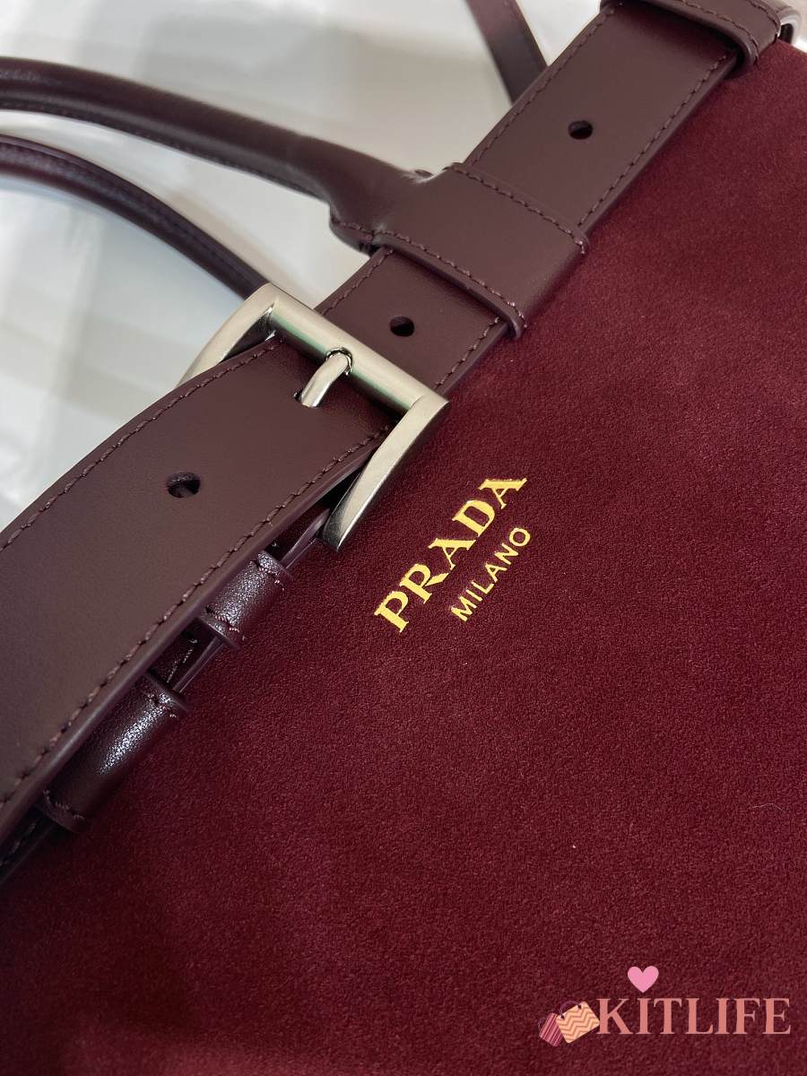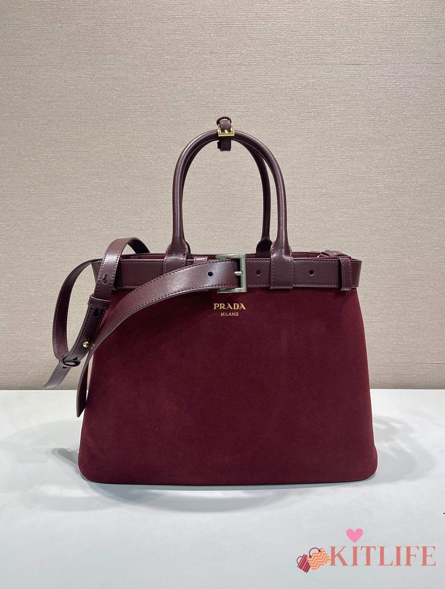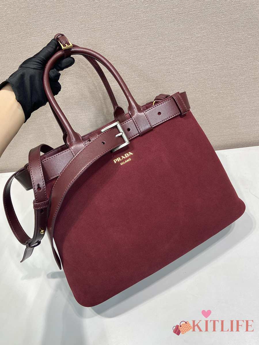 Kitlife Prada Buckle Large Burgundy Suede Handbag With Belt 1BA416 37.5x27.5x14cm