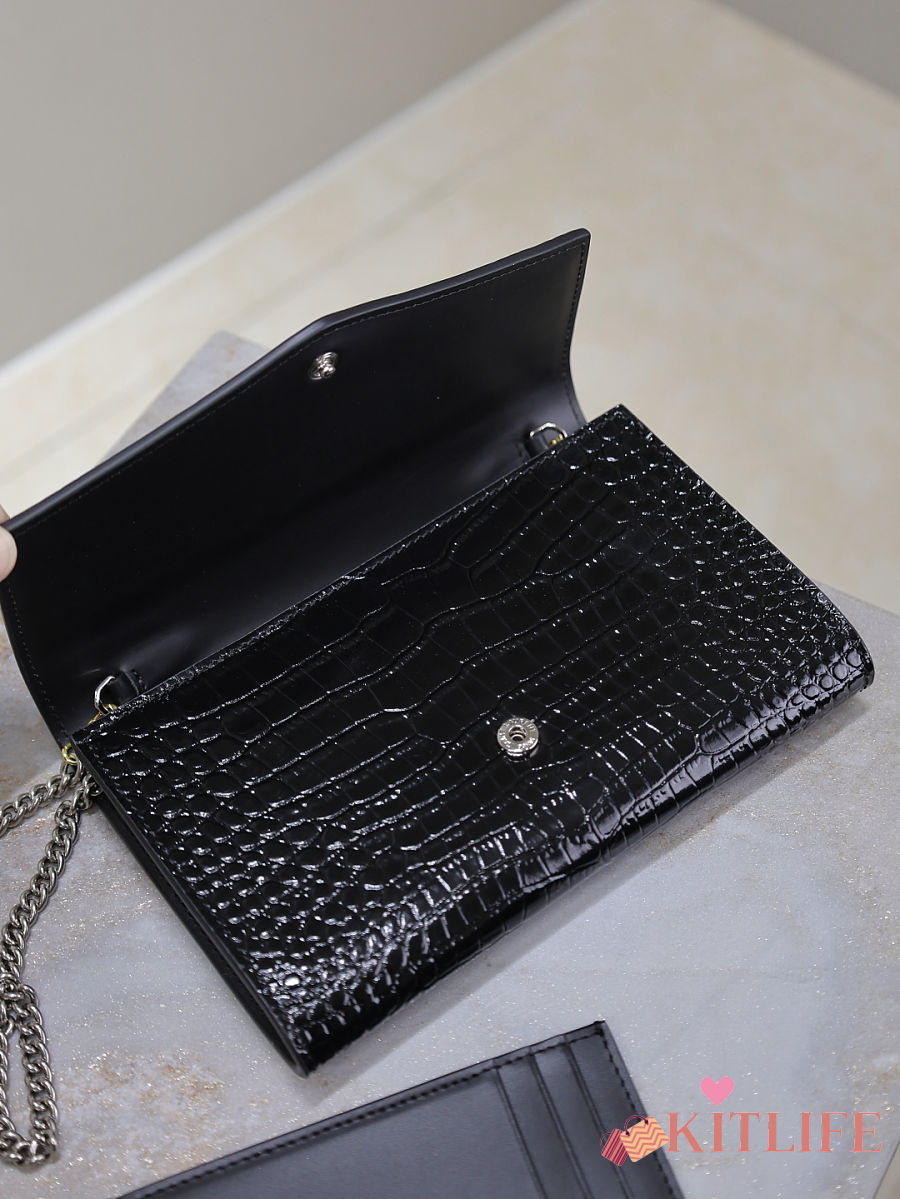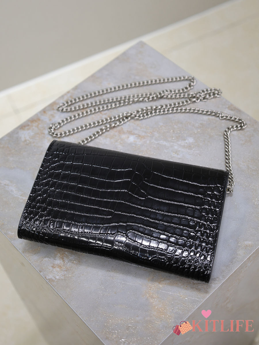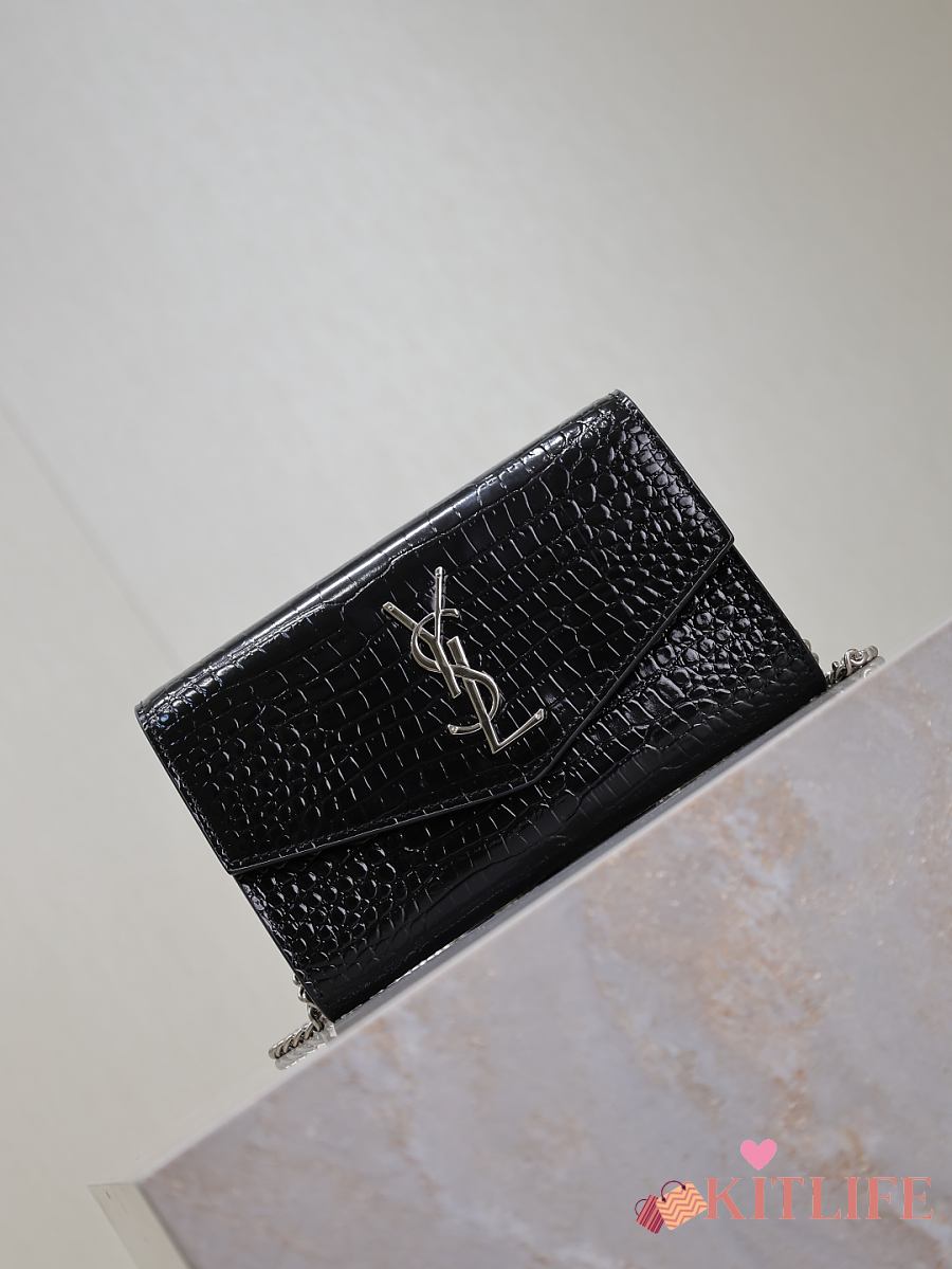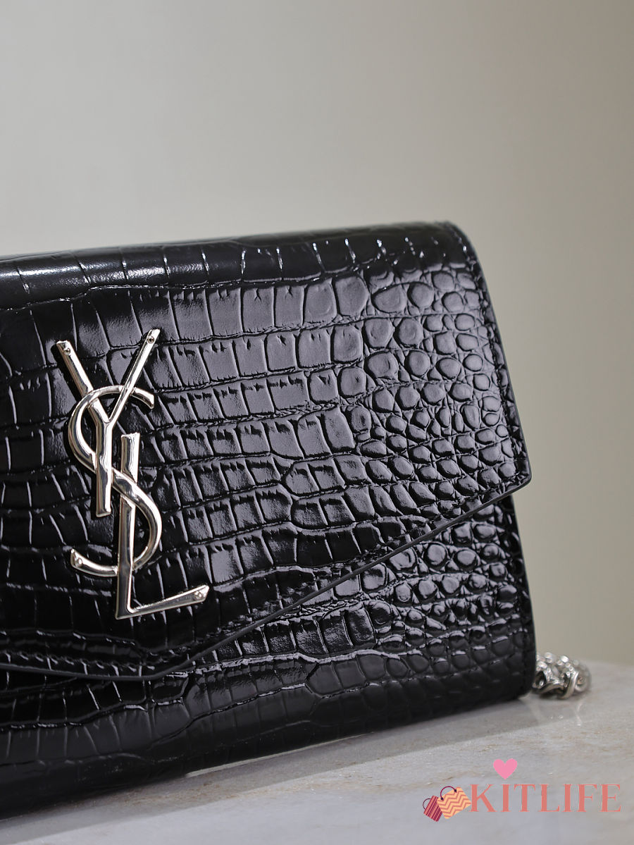 Kitlife Saint Laurent Uptown Chain Wallet in Black Shiny Crocodile-embossed Leather Silver Buckle 607788 19x12x4cm