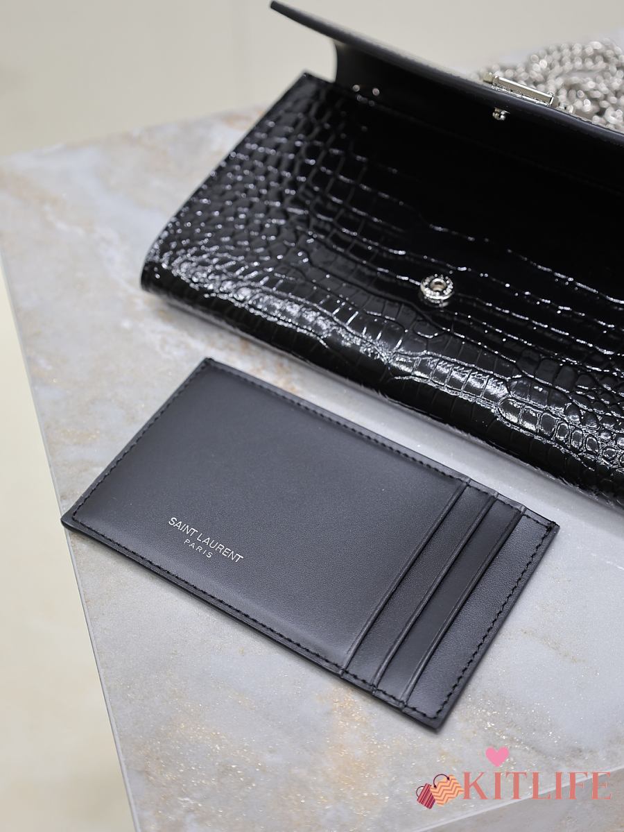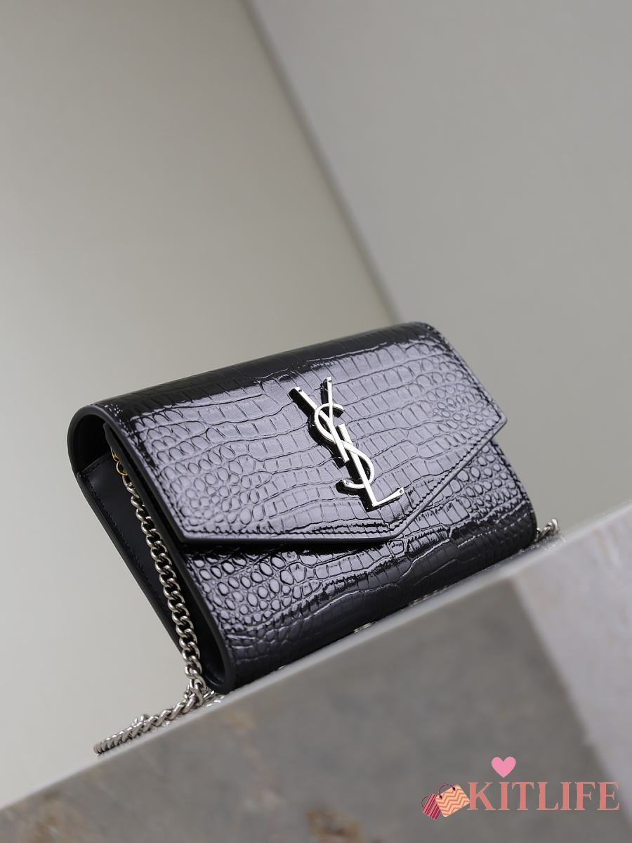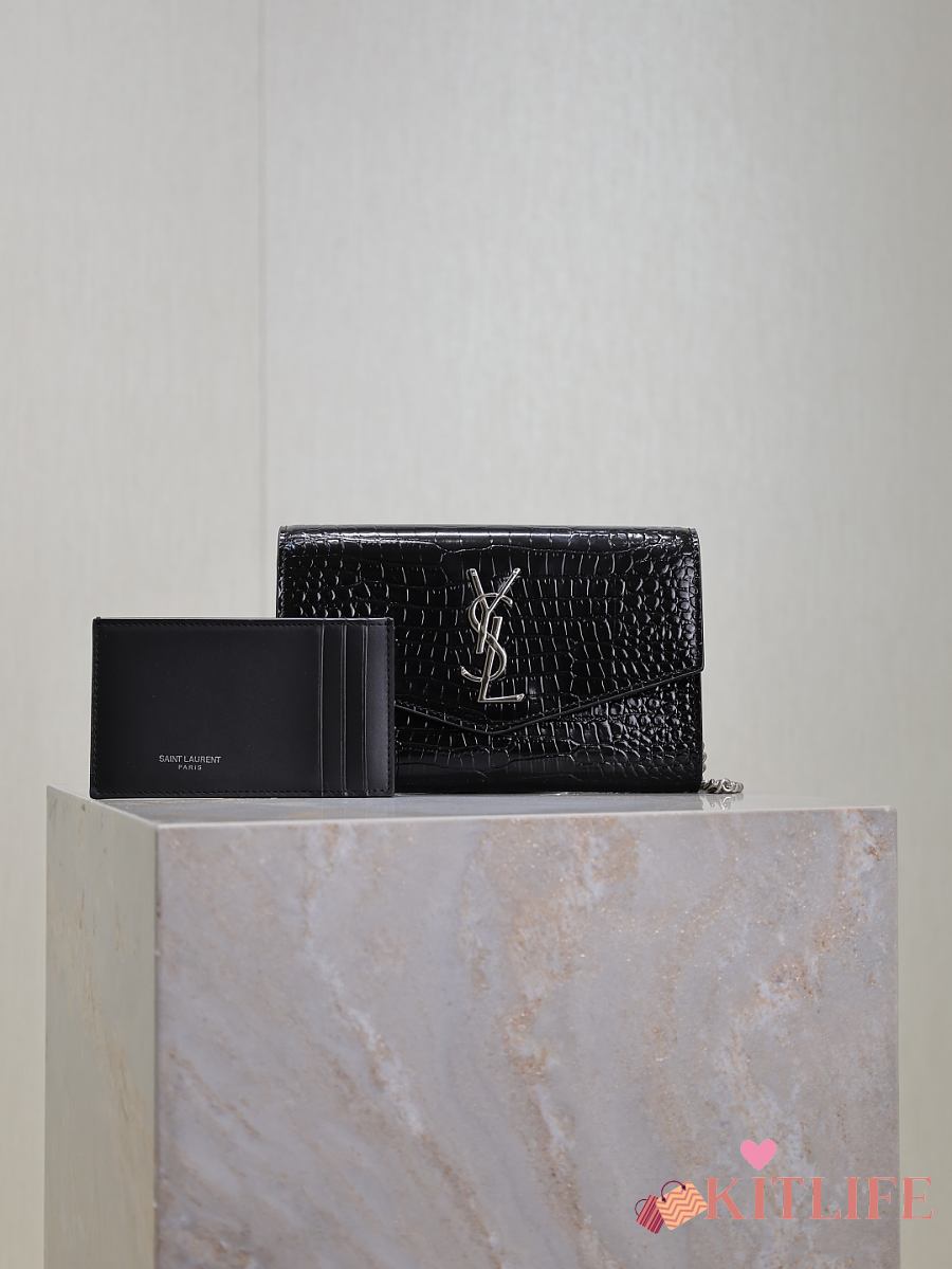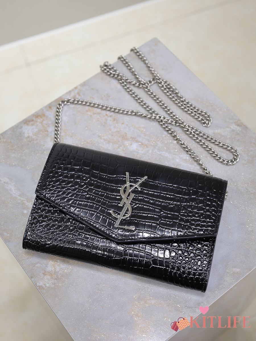 Kitlife Saint Laurent Uptown Chain Wallet in Black Shiny Crocodile-embossed Leather Silver Buckle 607788 19x12x4cm