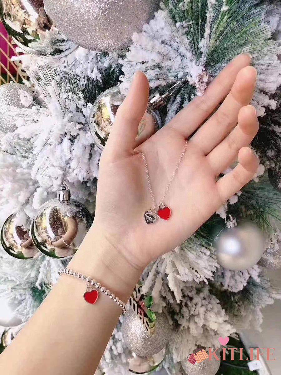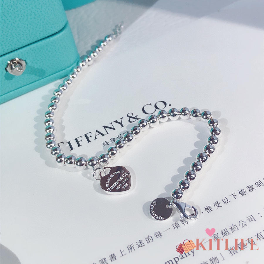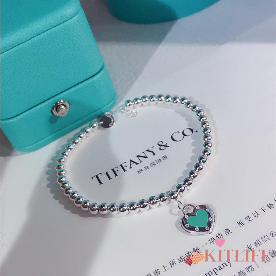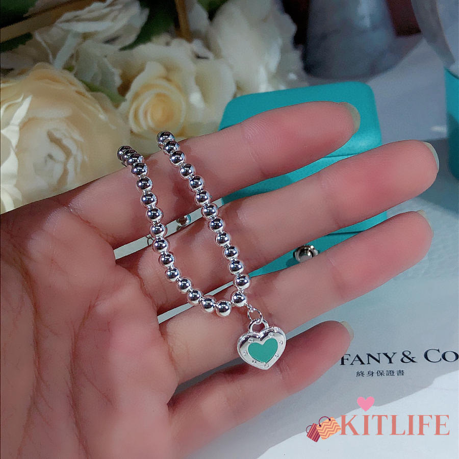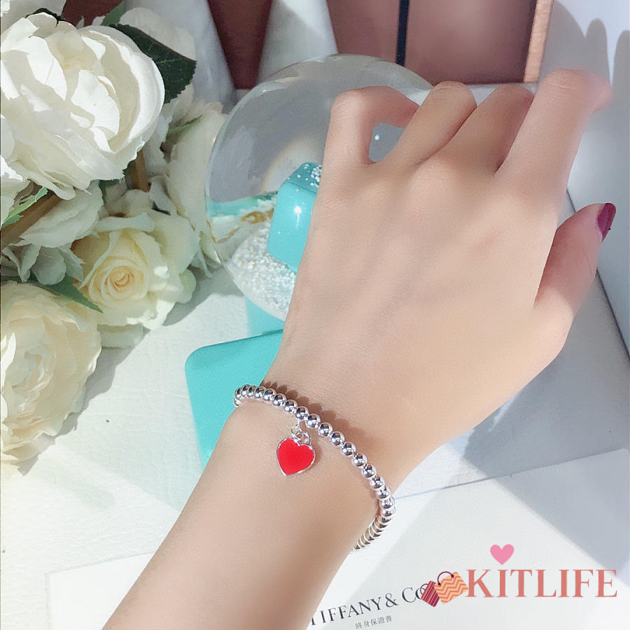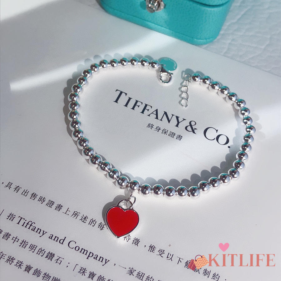 Kitlife Tiffany & Co. Enamel Silver Bead Bracelet With Blue / Red Heart