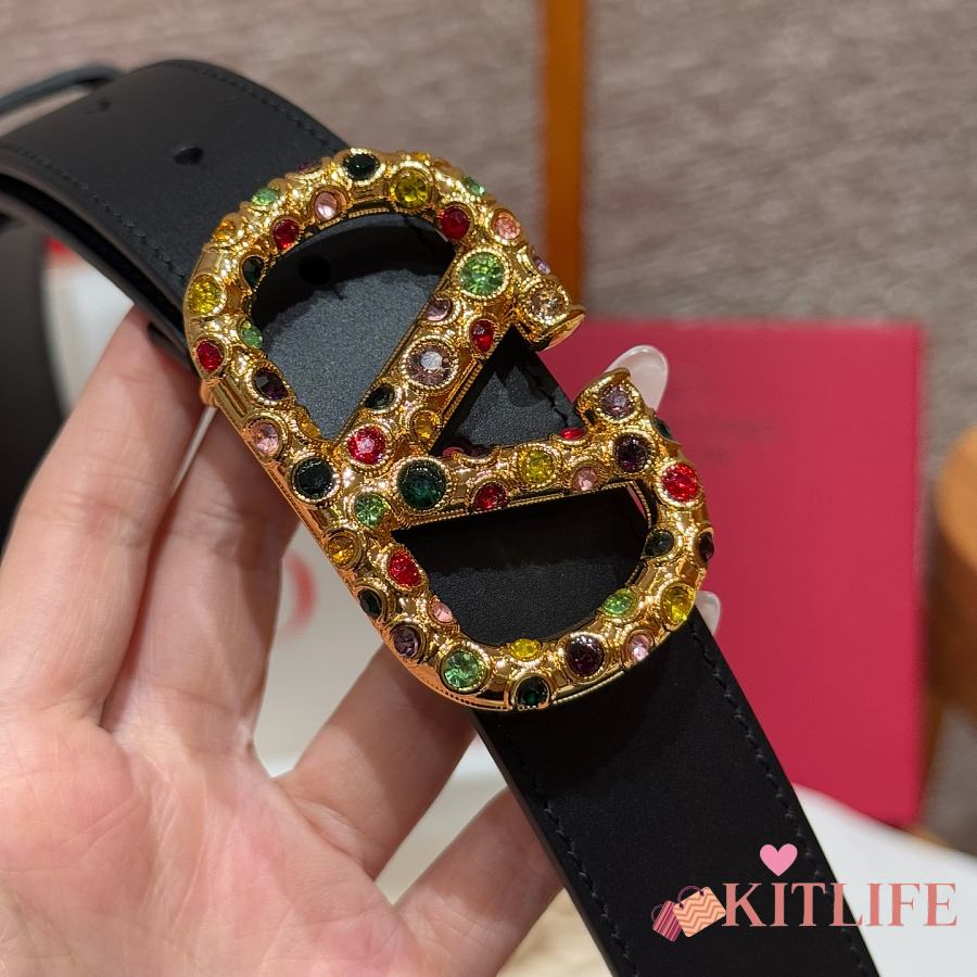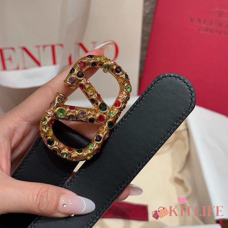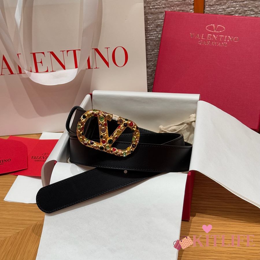 Kitlife Valentino Garavani VLogo Signature Belt In Black Calfskin With Gold Multicolor Crystals 30mm